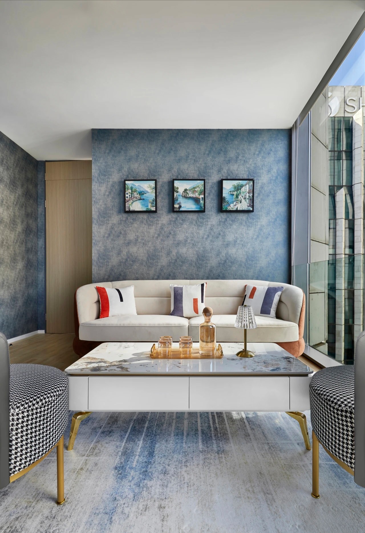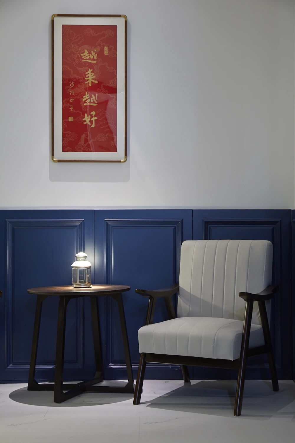 入户侧墙是一个简约的形象墙;中间设计了一个长条的吧台,吧台中间设计了一个端景作为中央空间的视觉焦点;