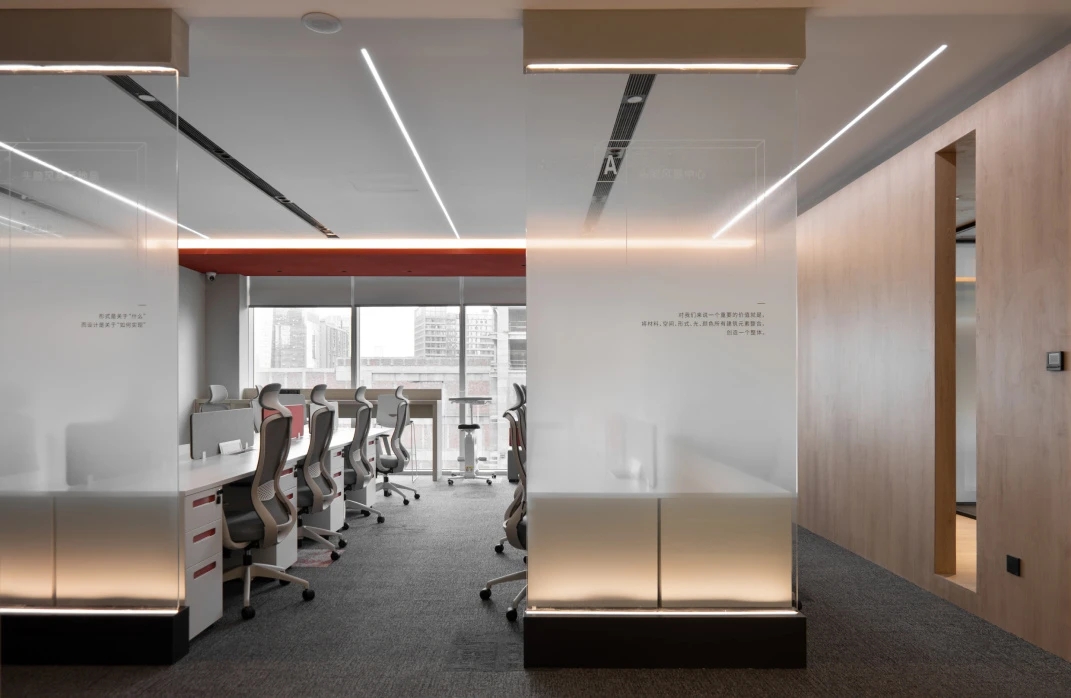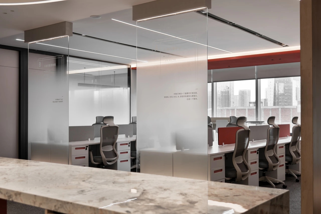 前台区域,精心考量的材质搭配,兼顾实用与美观,定制的灯具点缀其间,共同营造出宁静优雅的氛围。办公区采用开放式布局,与讨论区无缝衔接,促进不同部门成员之间的沟通与协作。