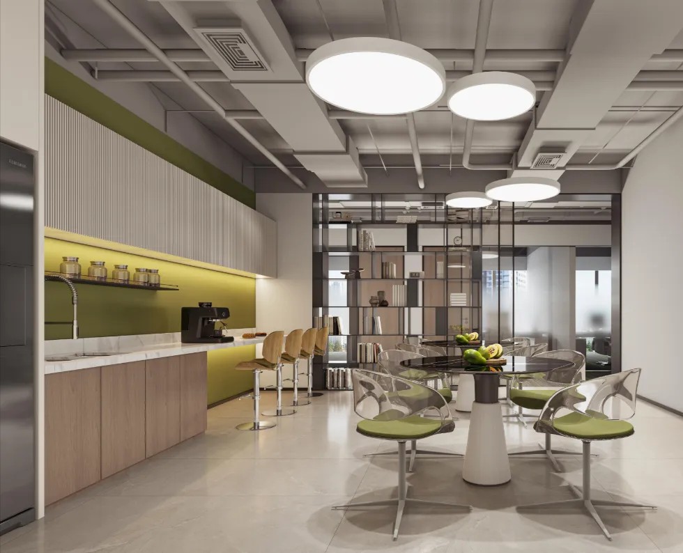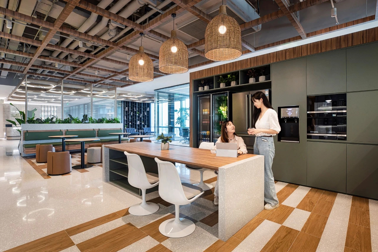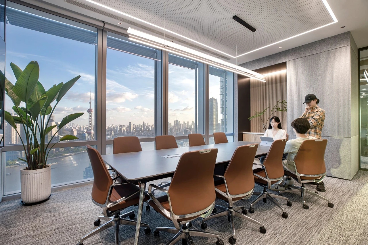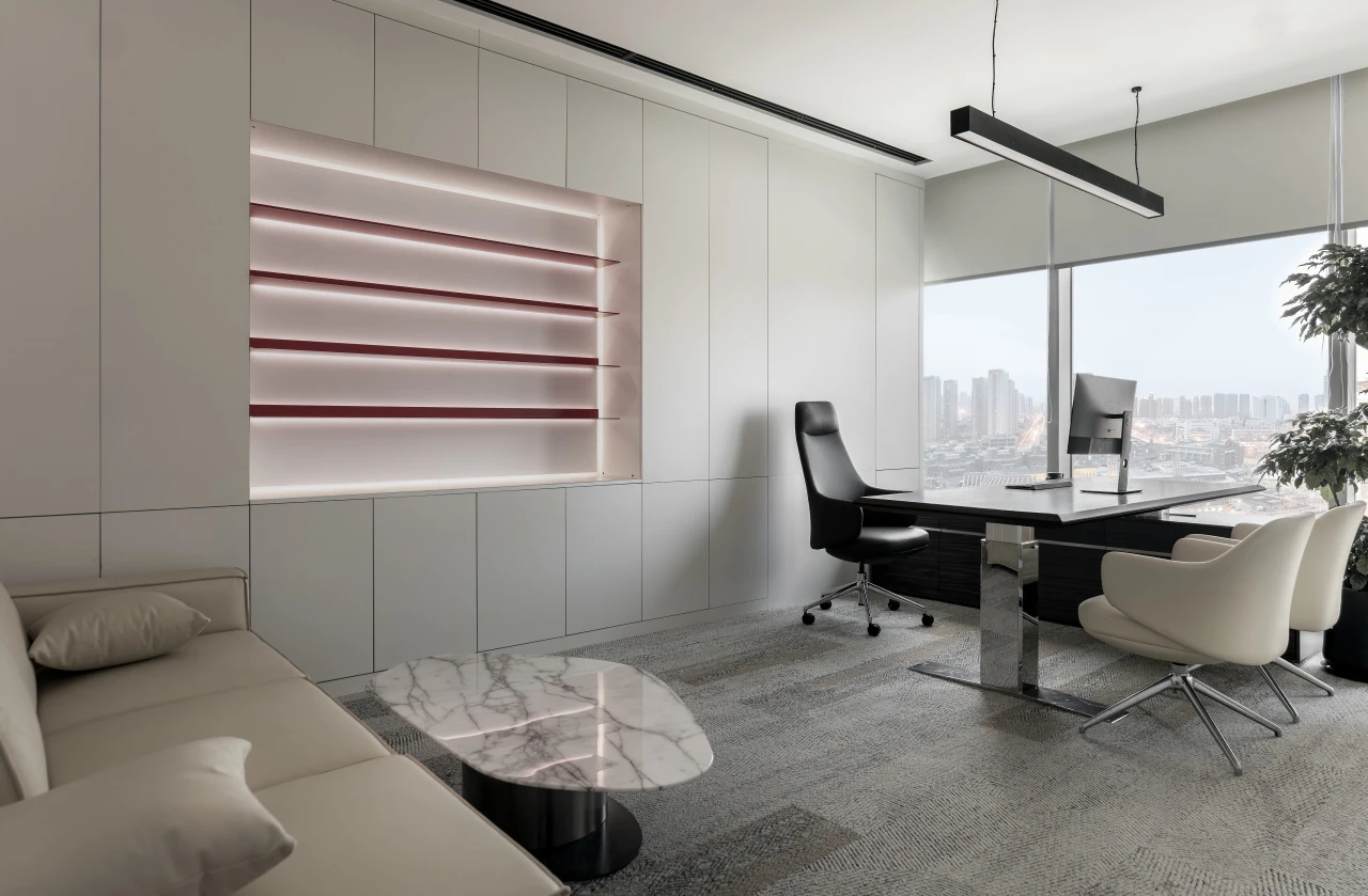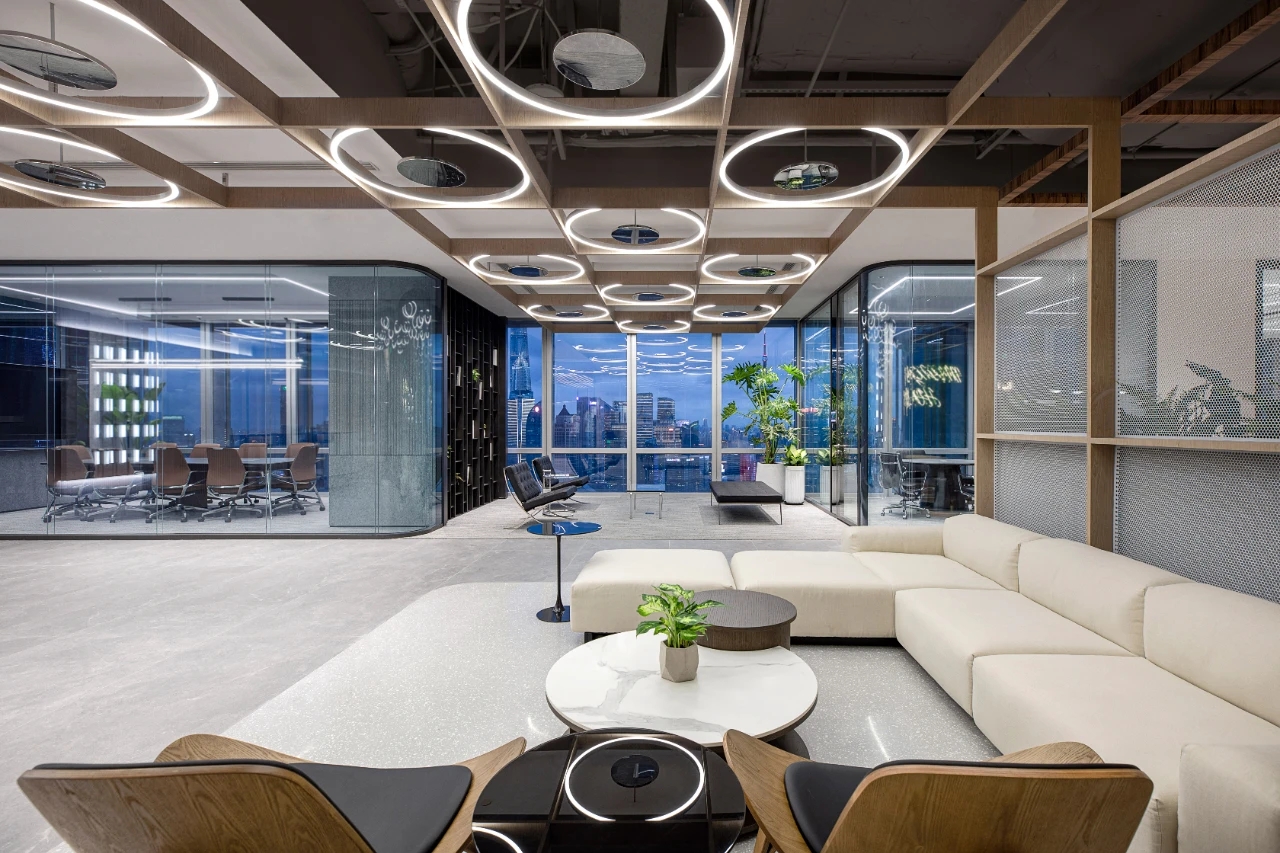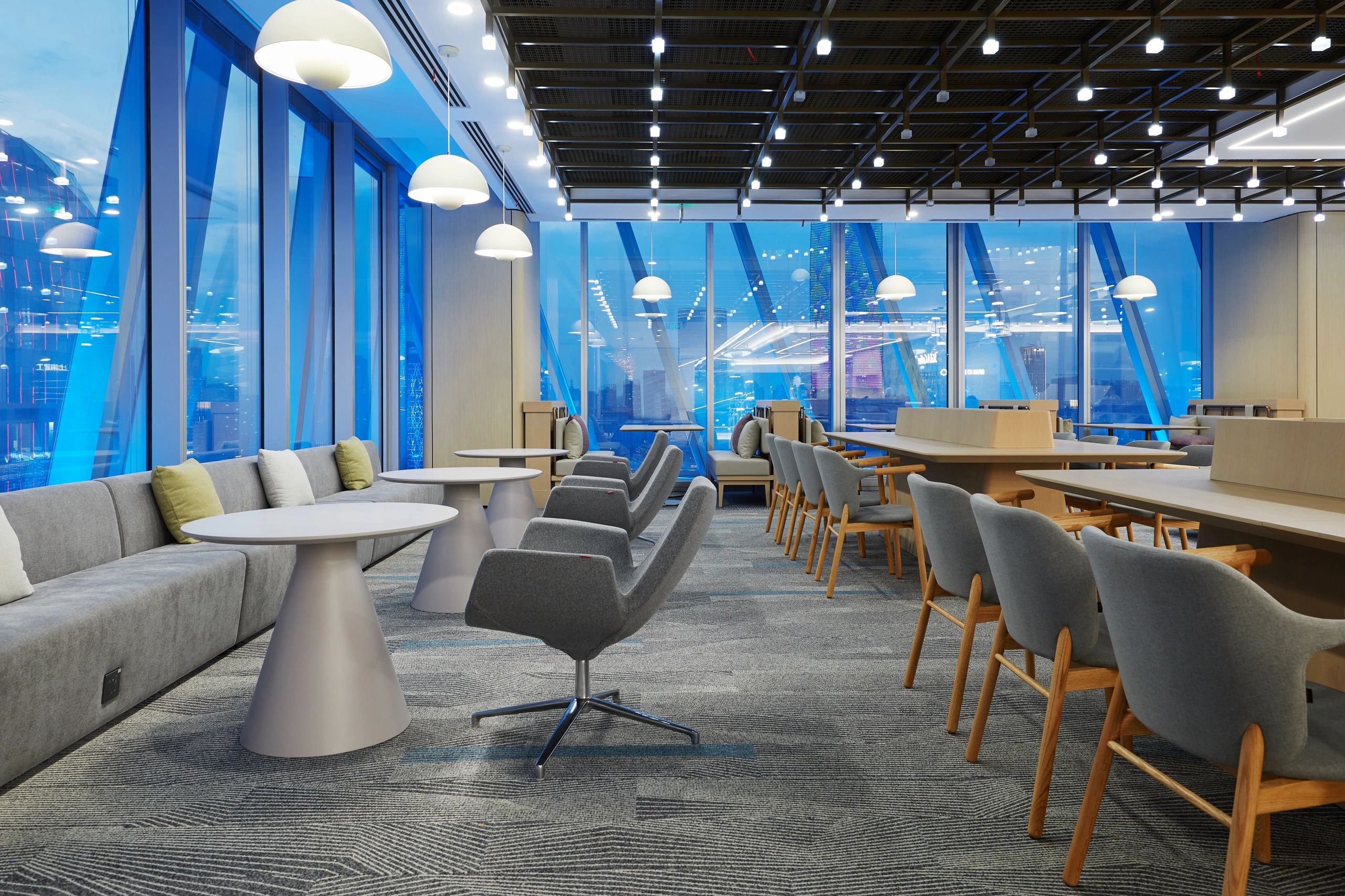 休闲区域,则以柔和色彩为主调,营造出温馨舒适的氛围。工作之余,慢享云卷云舒,俯瞰江景如画,使人持续保持一种由内而外的健康与活力。