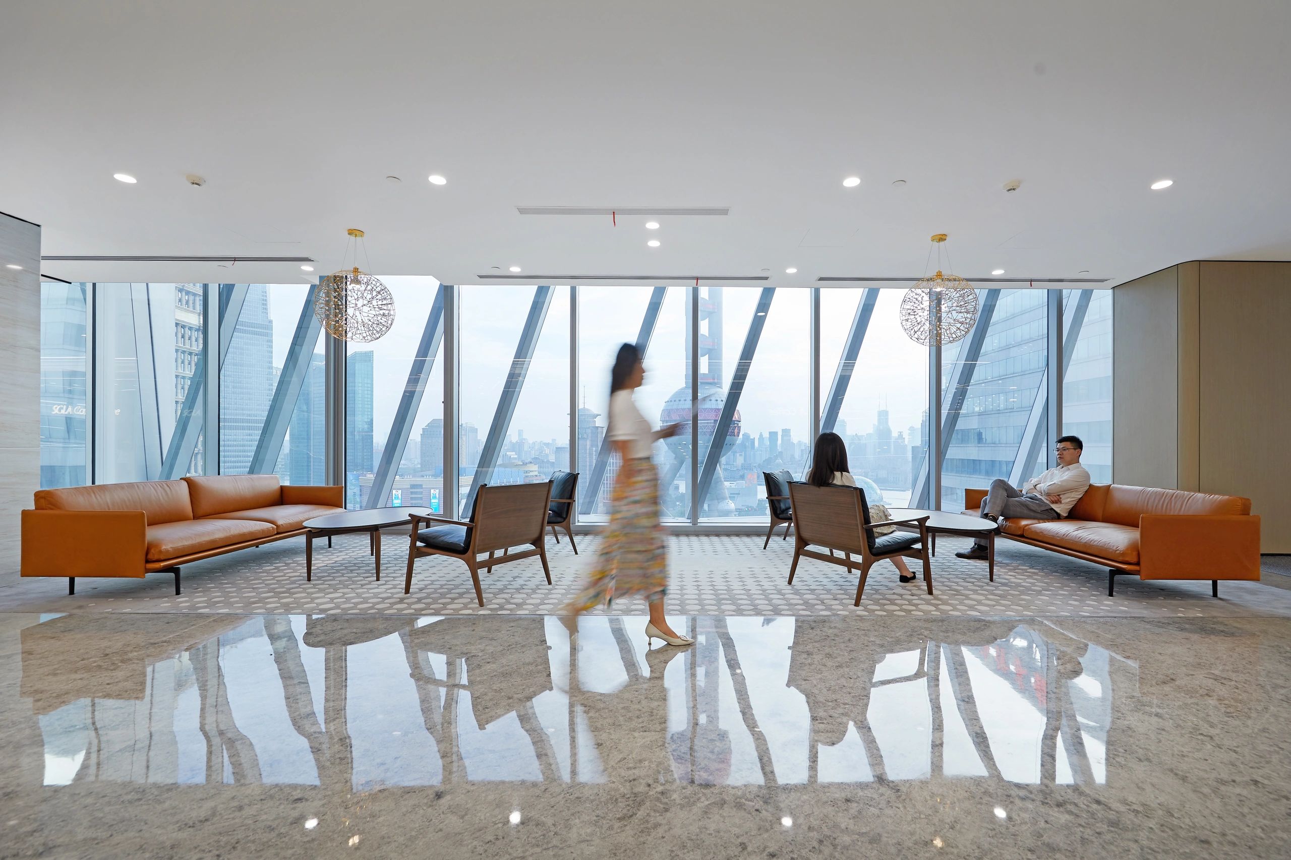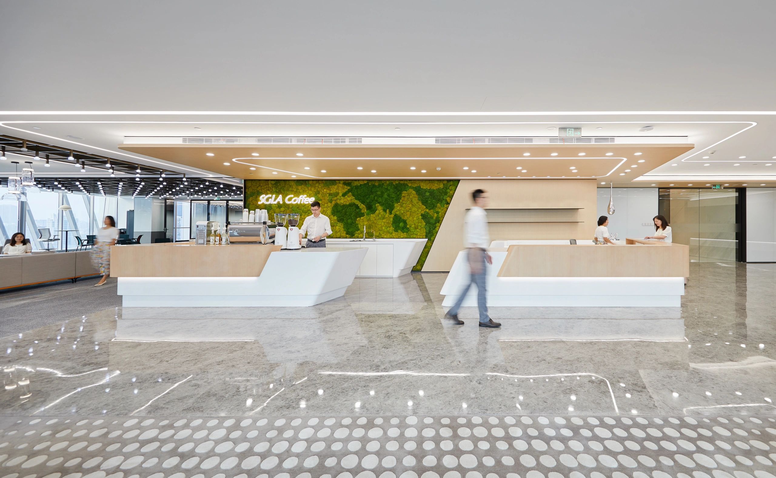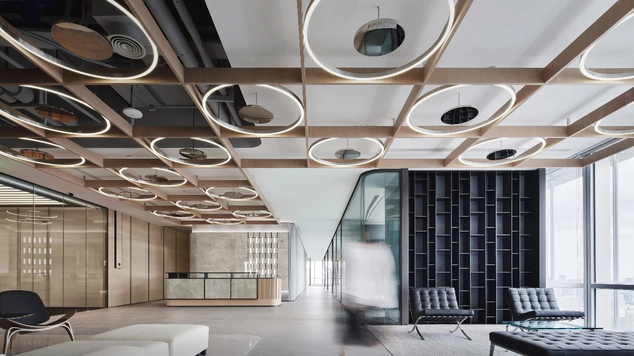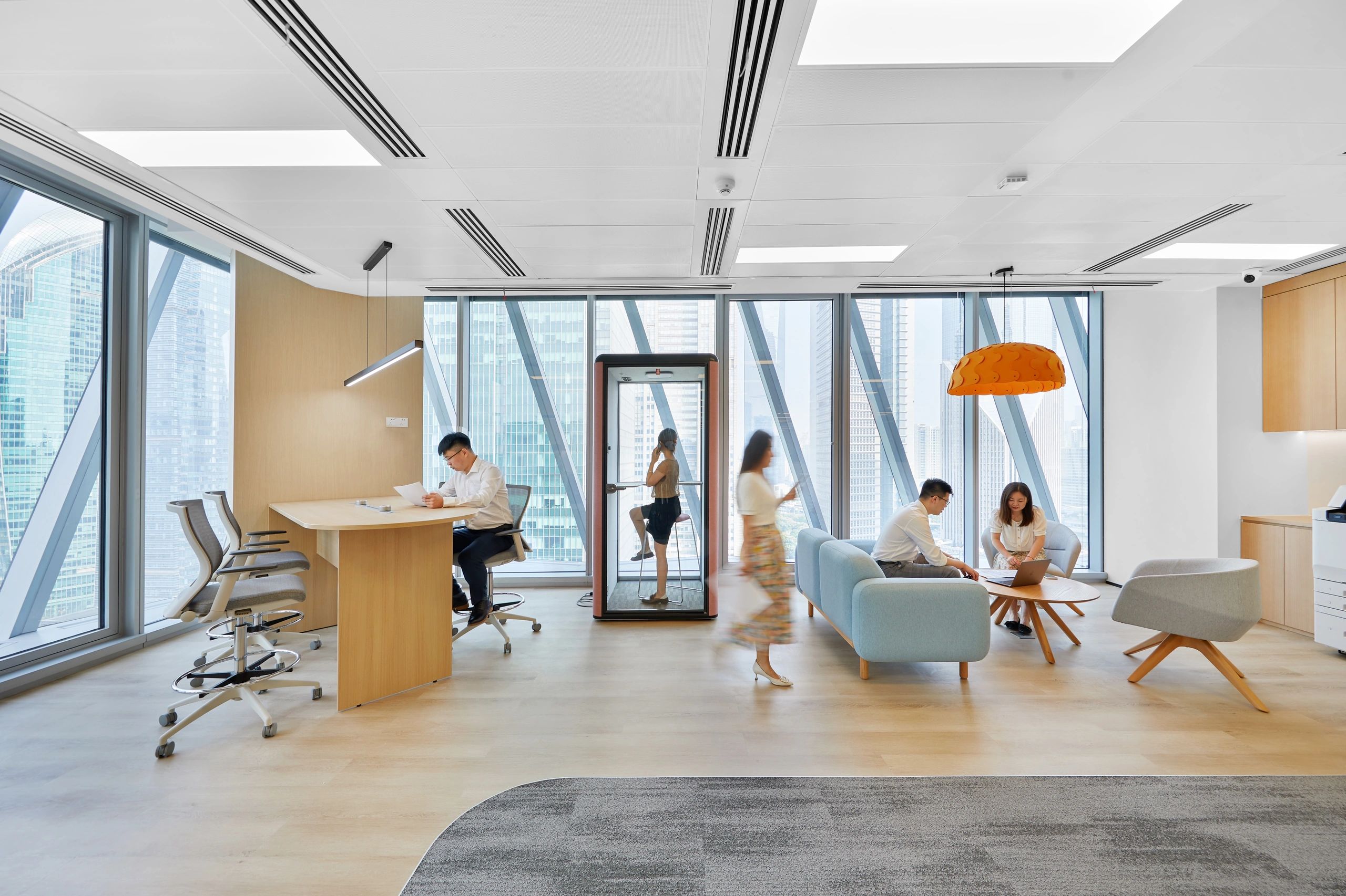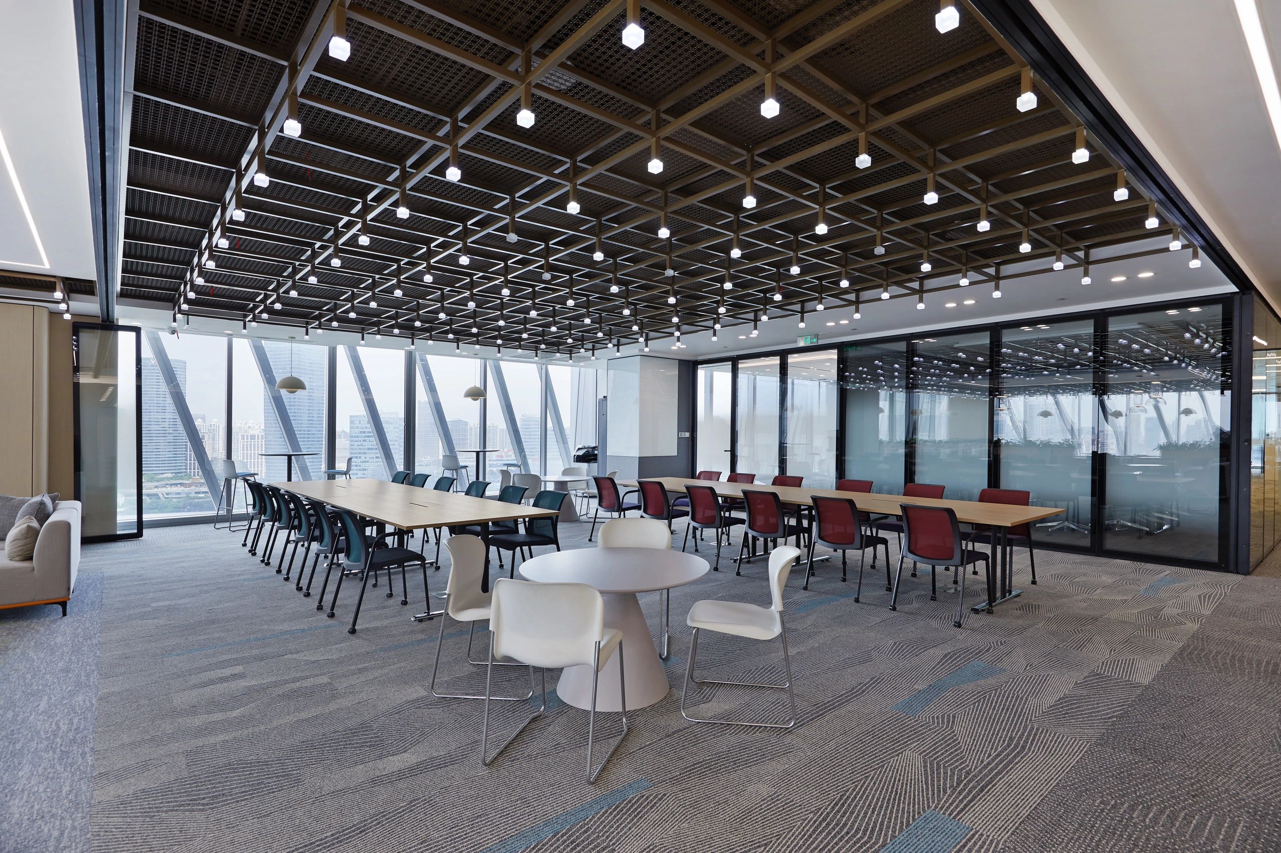 休闲区域,则以柔和色彩为主调,营造出温馨舒适的氛围。工作之余,慢享云卷云舒,俯瞰江景如画,使人持续保持一种由内而外的健康与活力。