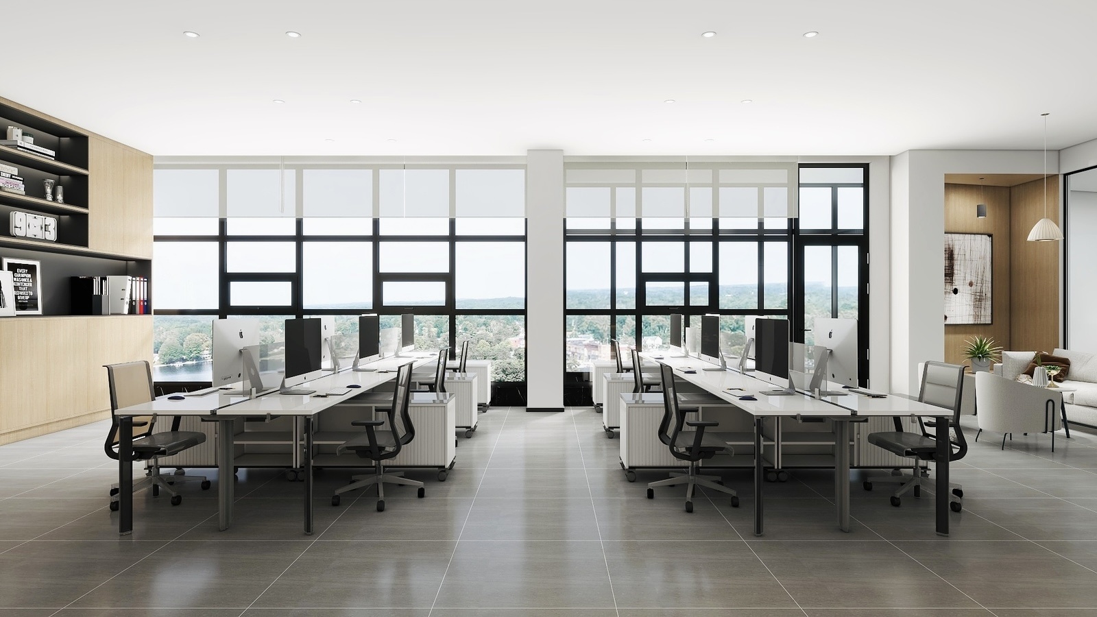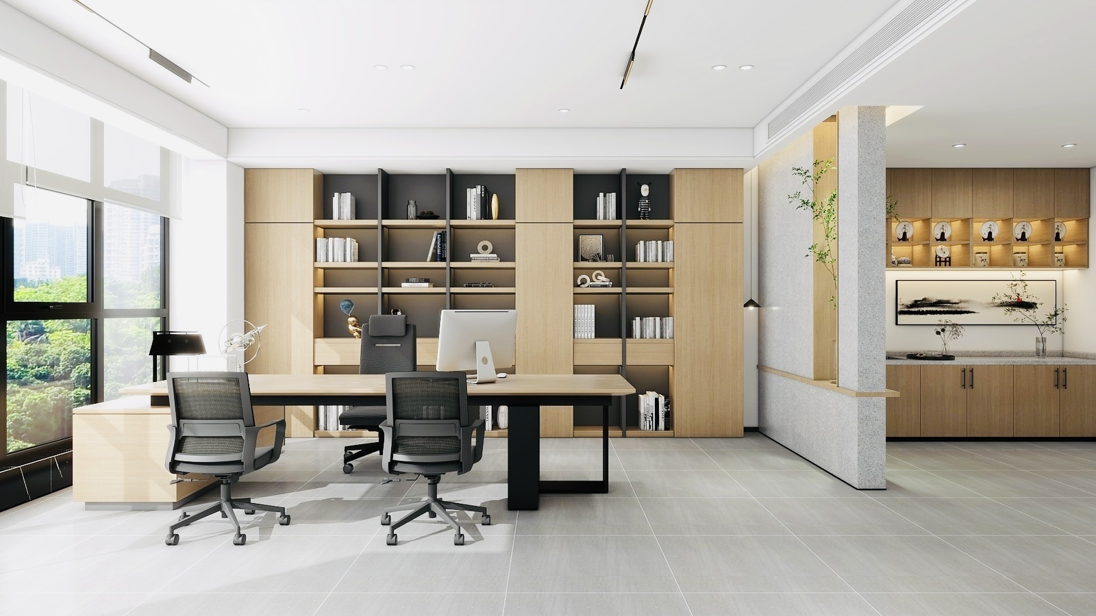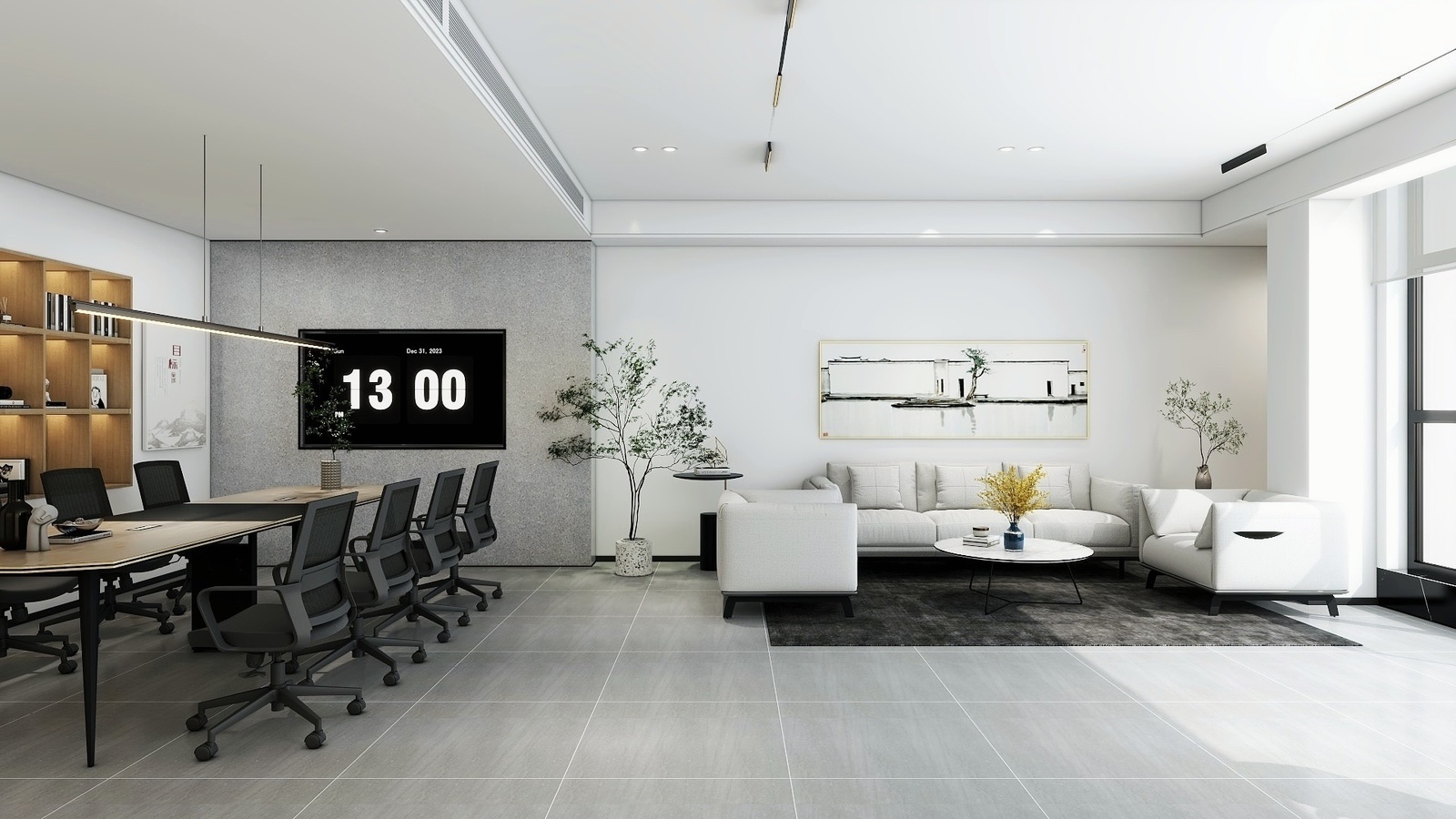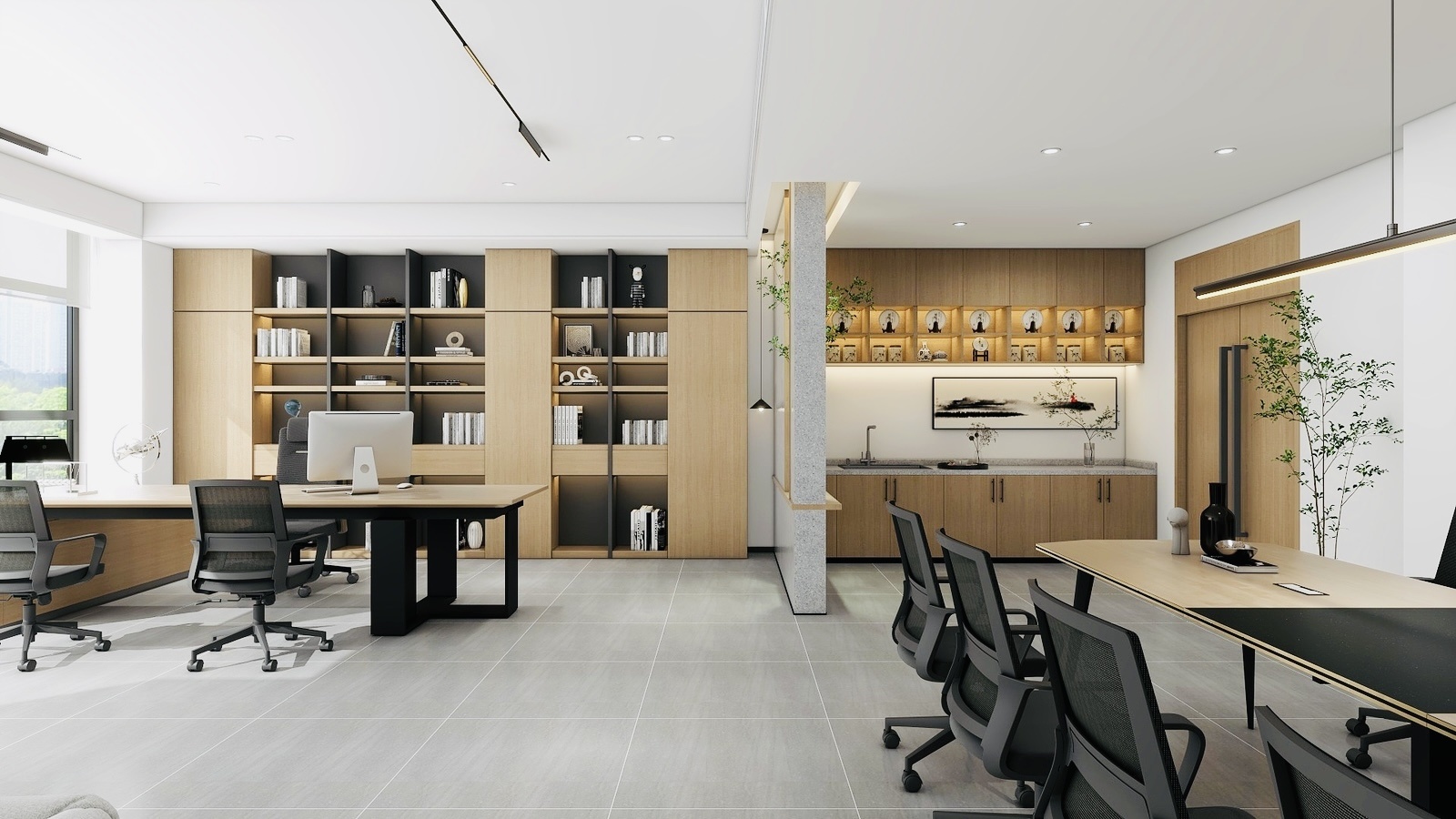 从访客踏入接待区的那一刻起,他们就被自然木色、绿植和温暖的自然光线所包围。这些元素不仅仅是装饰,更是为客人营造了一种自然、温馨的氛围。中央工作区展示了亲生物设计的实际应用,开放的空间鼓励团队合作,而私密的角落则为个人工作提供了安静空间。每个区域都配备了符合人体工学的现代家具,反映了对现代工作方式深入理解。
