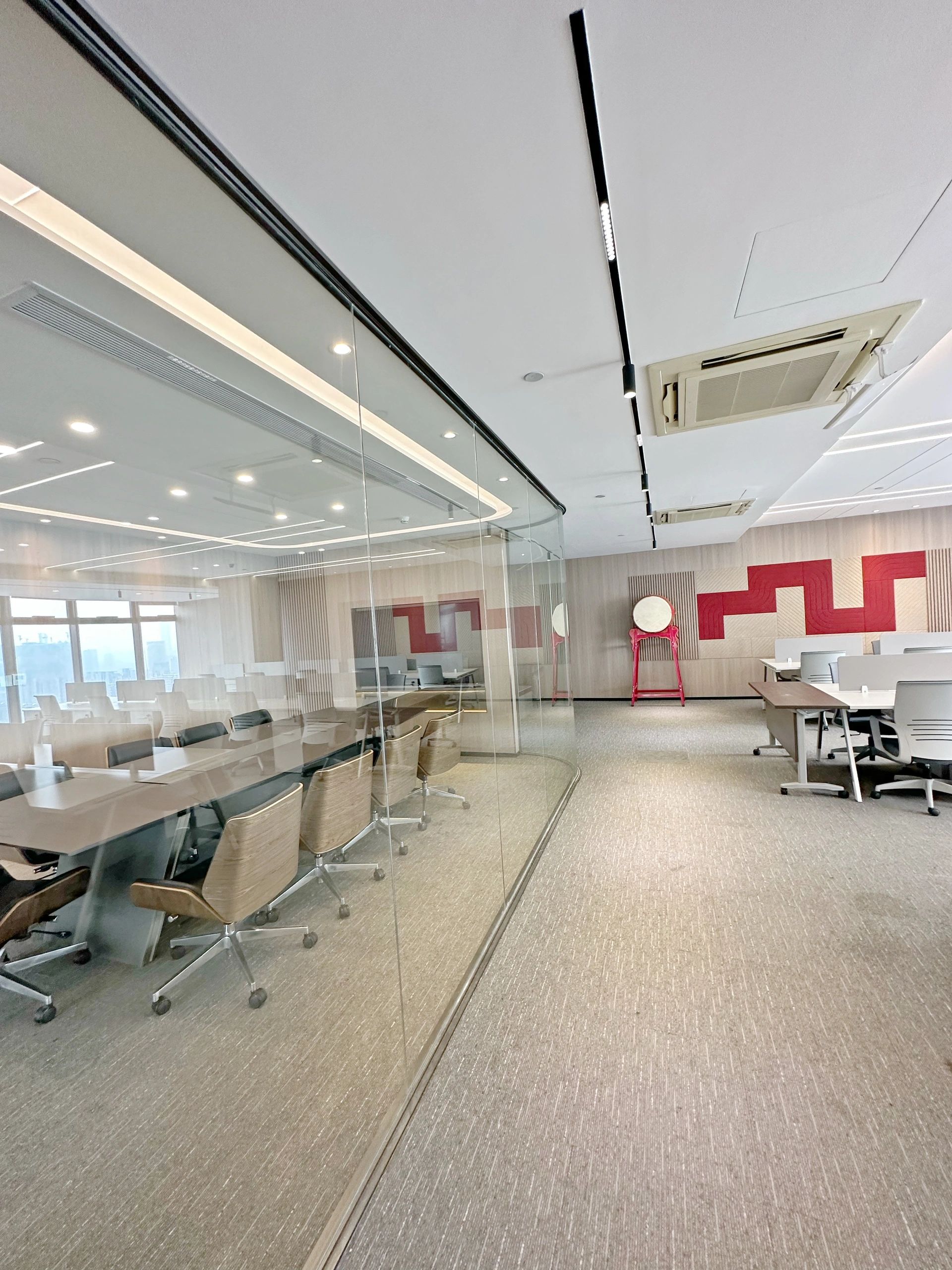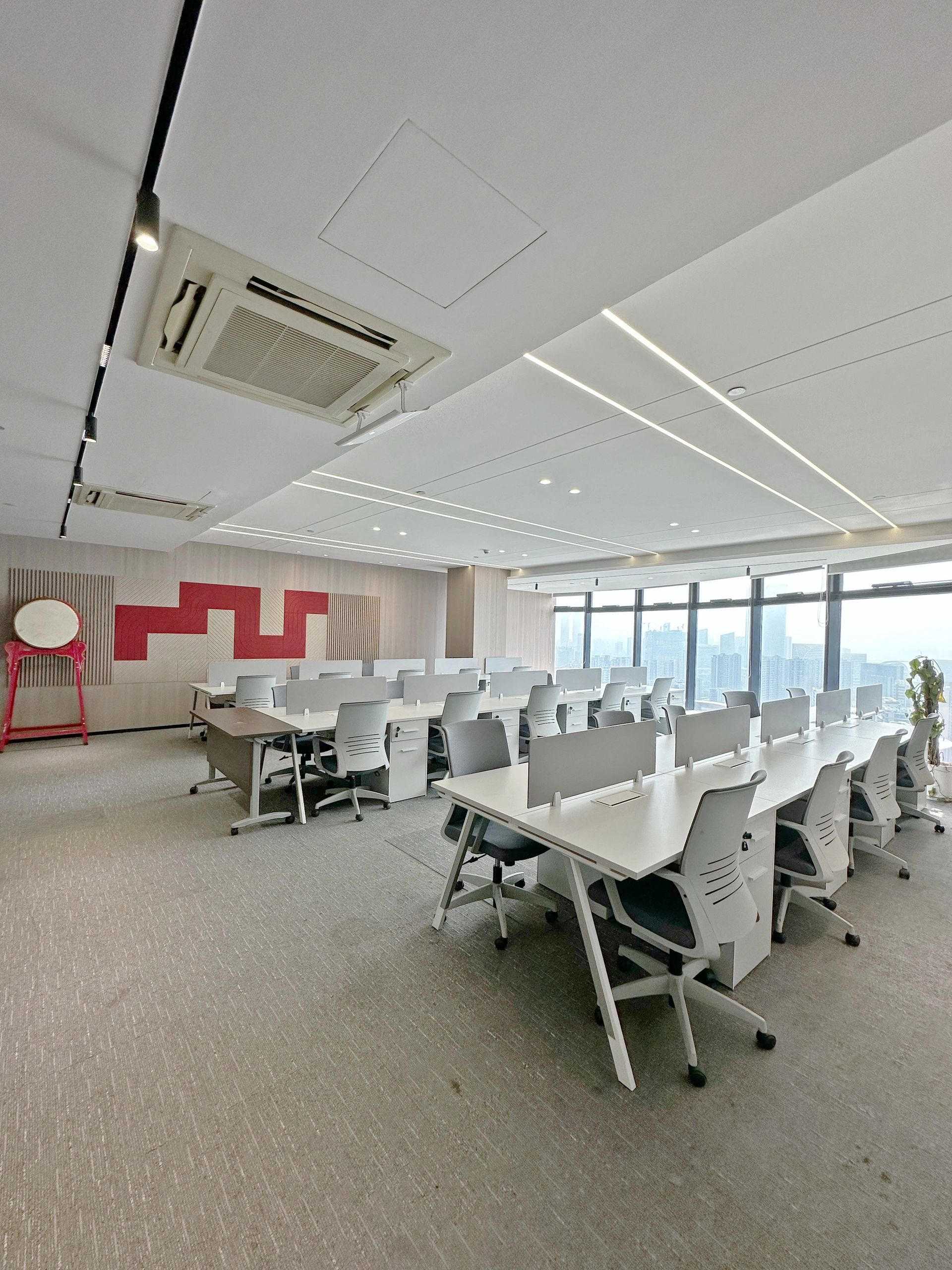 特别值得一提的是主茶水间,采用了鲜艳的珊瑚色天花板,旨在促进员工之间的交流和互动,为工作环境增添了一抹亮色。设计的灵活性是整个空间的一大特点,模块化的工作站可以根据团队需求进行调整。