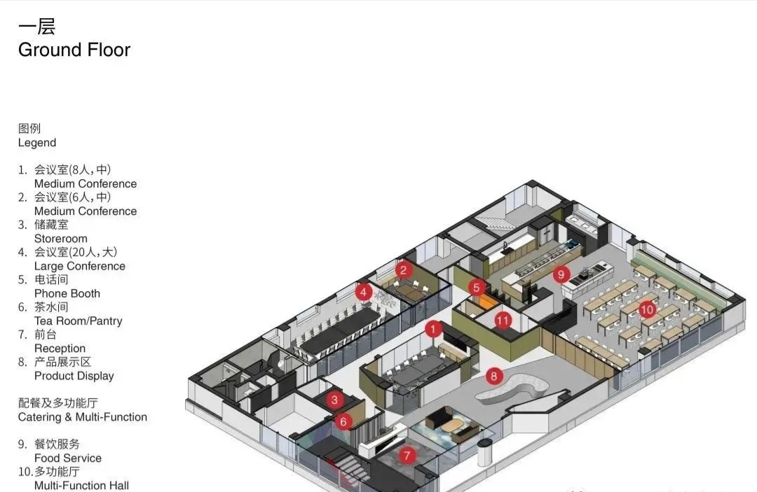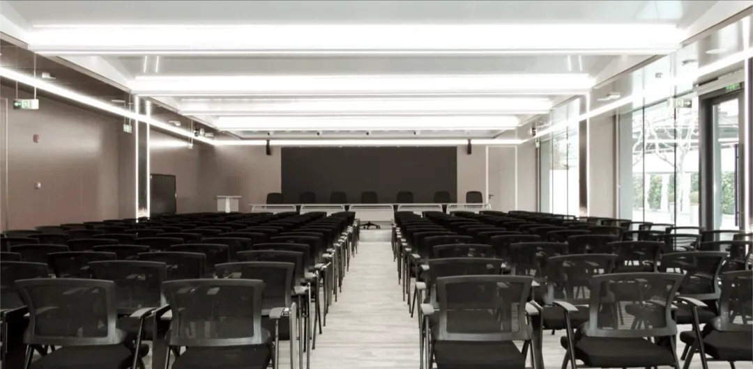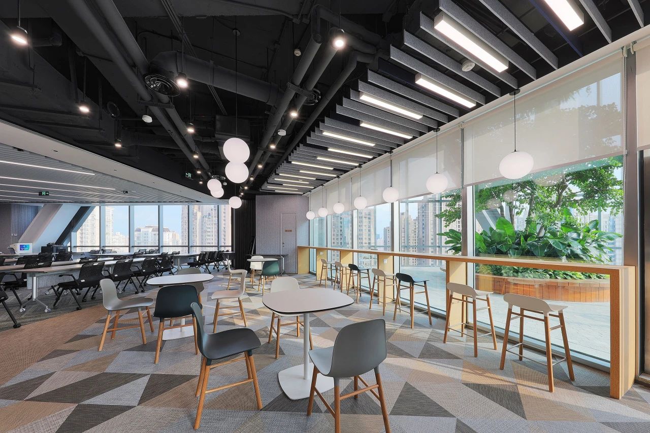 位于行政大楼底层的公司食堂拥有咖啡馆般的舒适氛围。相邻大厅除了为公司提供充足展示其产品成就的机会,同时也预留了空间弹性,在每年一次的年会可以结合食堂将空间延伸。