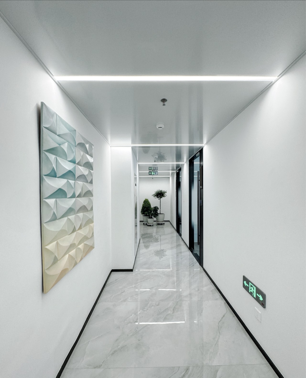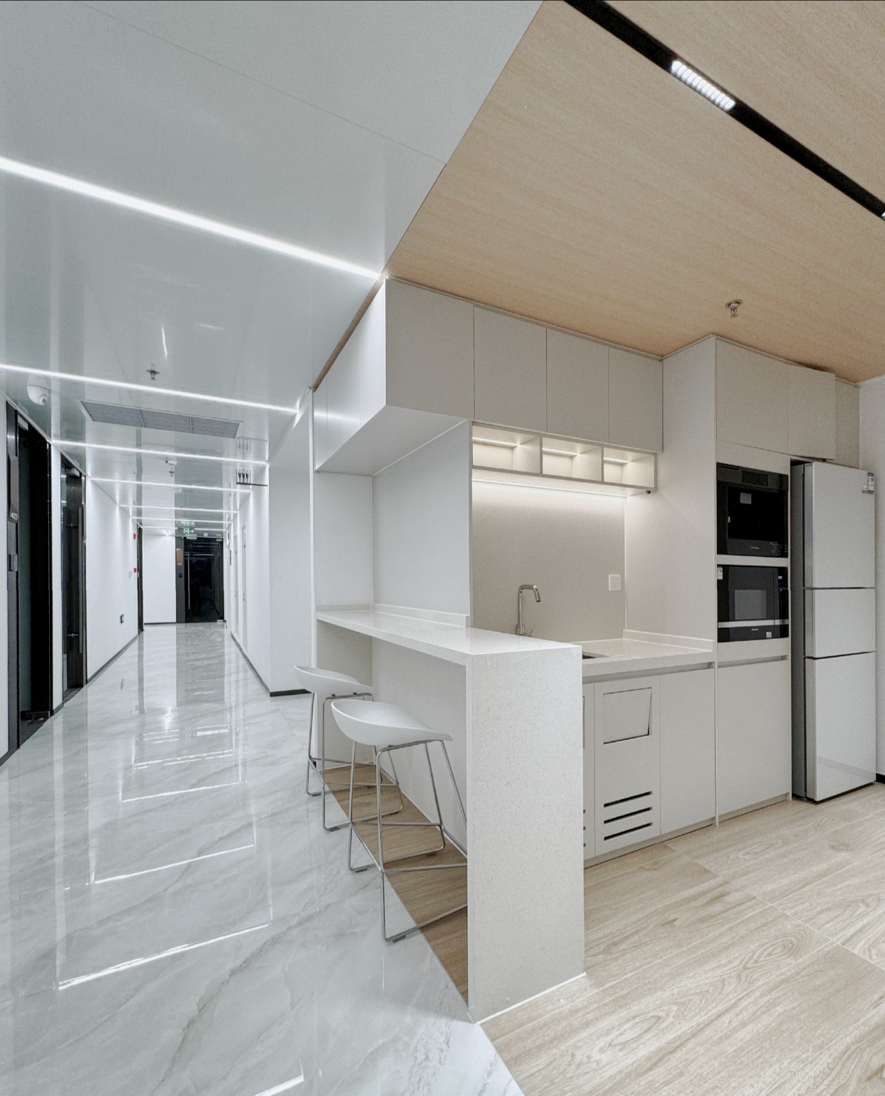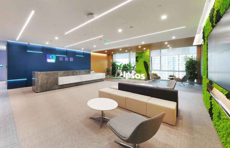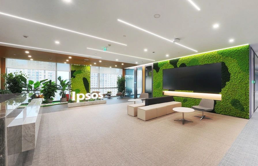 为了增强员工在工作场所内的参与度和联系感,办公空间内集成了亲自然 "绿植墙"。这面墙由益普索的企业颜色组成,引导员工和访客从入口直至办公室。这面绿墙不仅为环境增添了活力,还加深了员工的认同感和归属感。