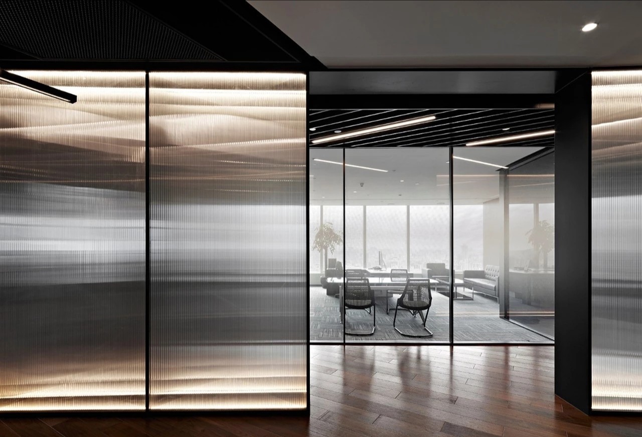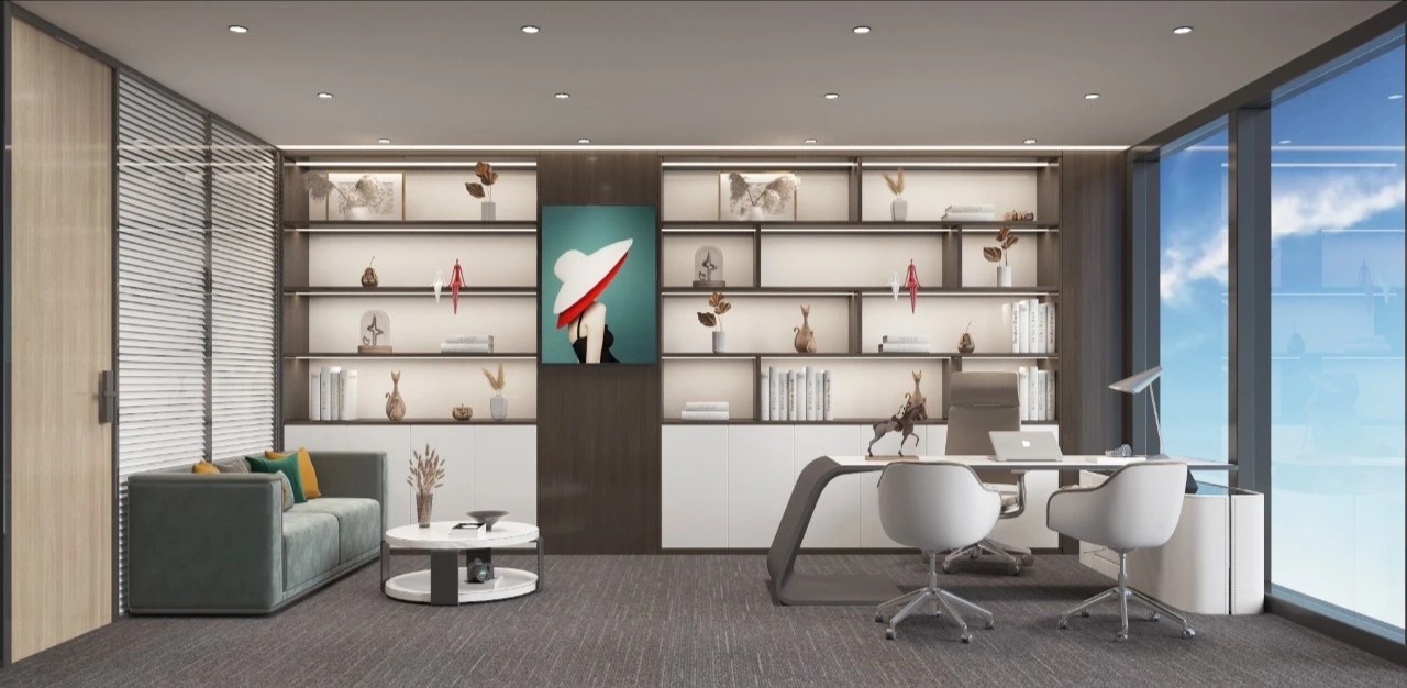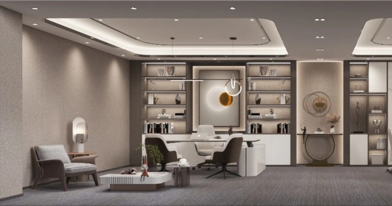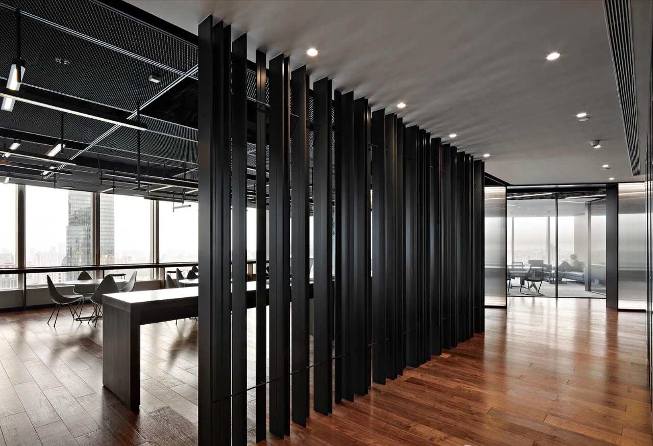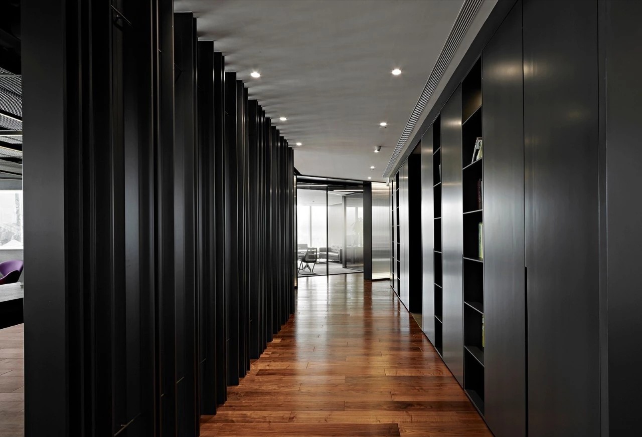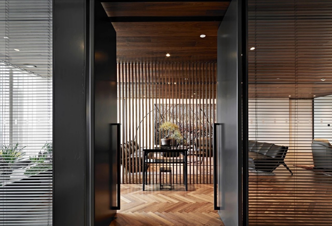 办公室分为两个出入口,一侧临近总裁办公区,通过管控可作为总裁及贵宾专用动线,另一侧则通往前台接待区,成为办公室主要出入口。