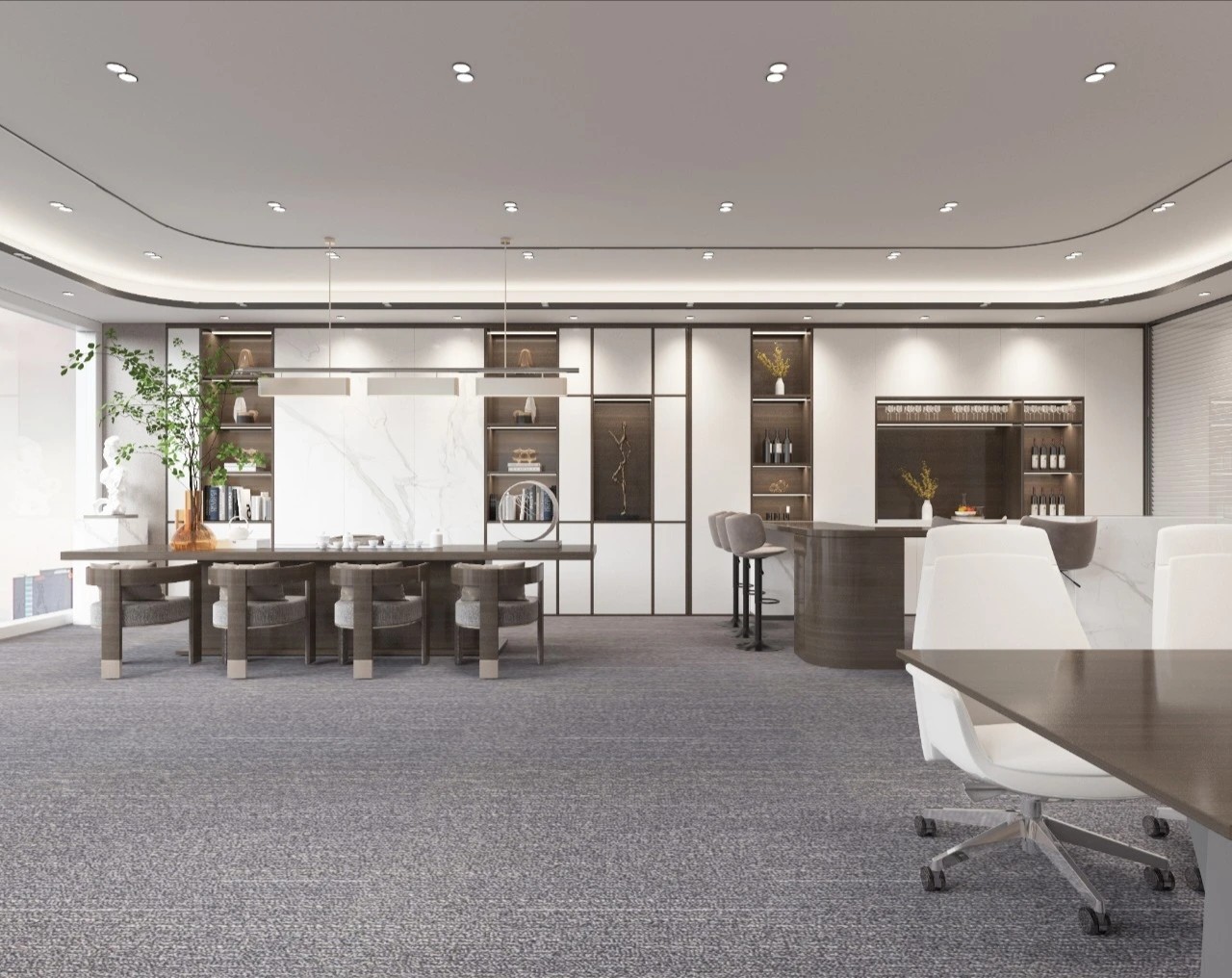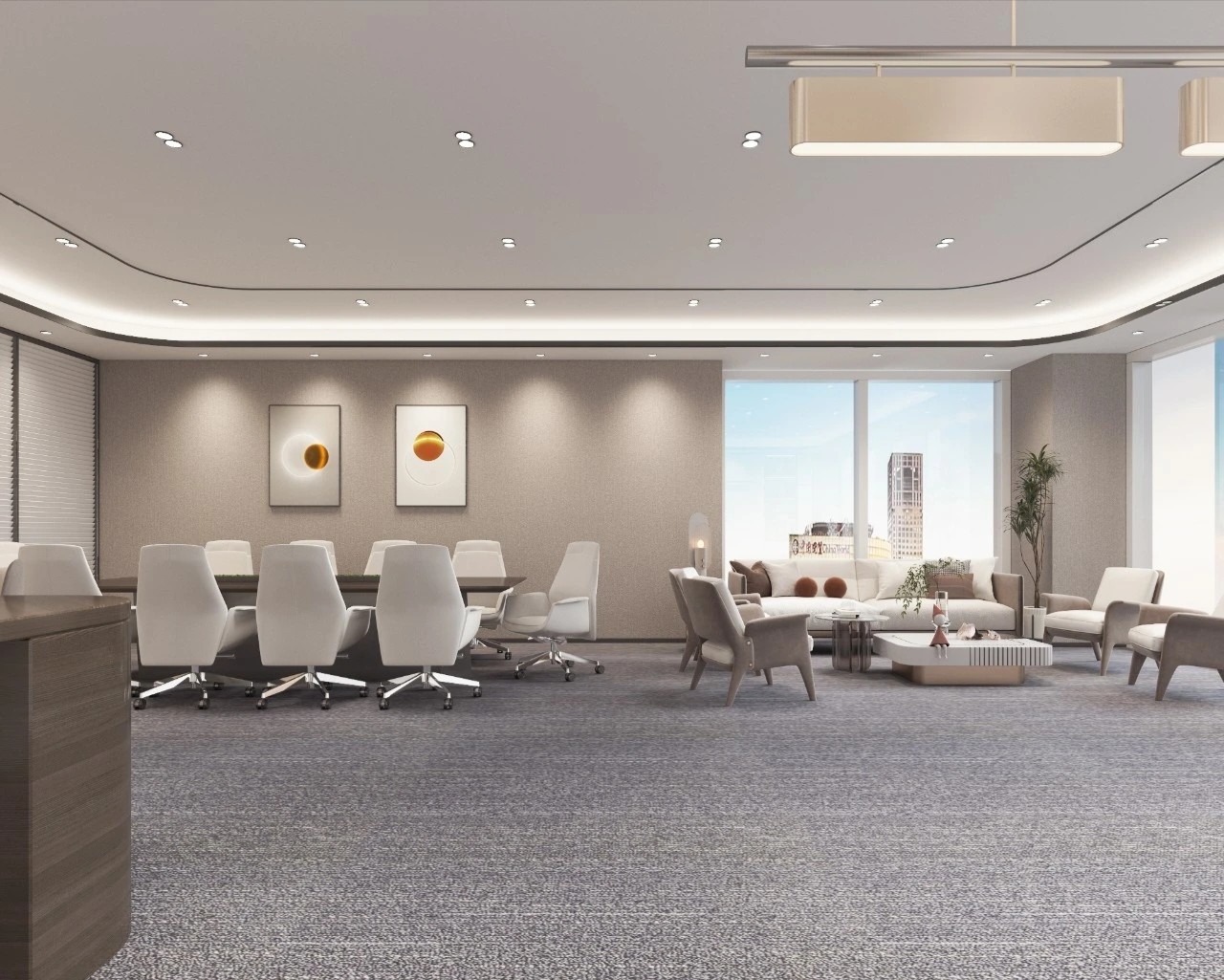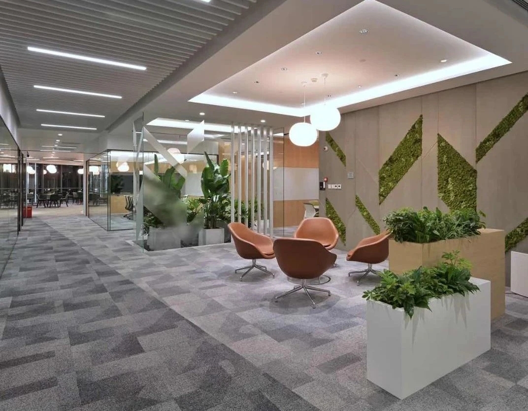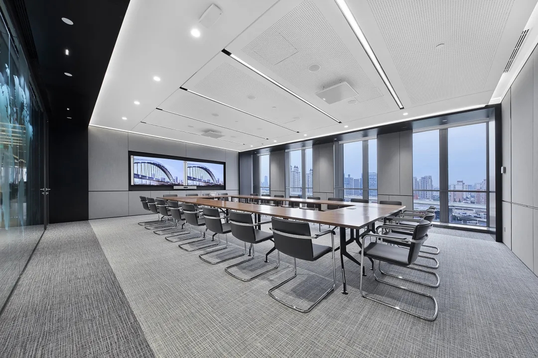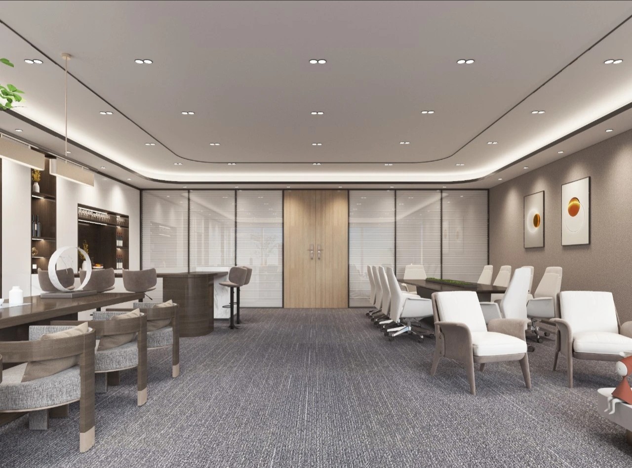 考虑到公共办公区面积较大人员较多,平面布局相对更加严谨,运用地毯穿插、叠加、相交让不同区块,整洁有序,辨识度更高。温暖的木饰面让空间变得更加柔和、流动效率更高。休闲区放置异形沙发,温和的绒毛与超大尺寸的坐深拉伸视线、提升质感。背景在原木色包裹之下压低商务感,令人心情放松,由此完成一种办公、会客与休闲氛围的融合。
