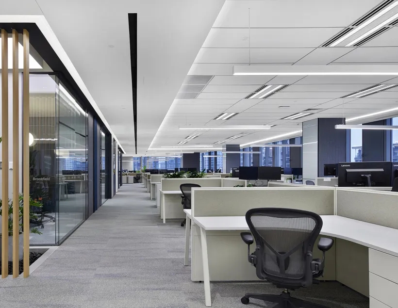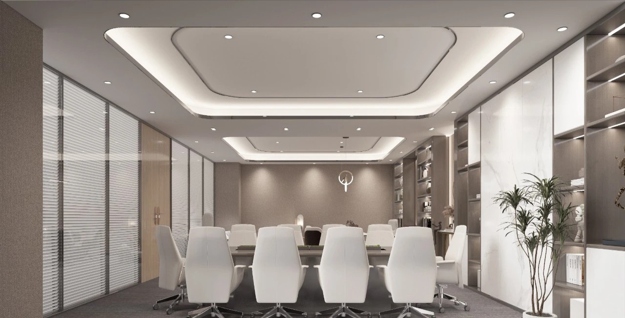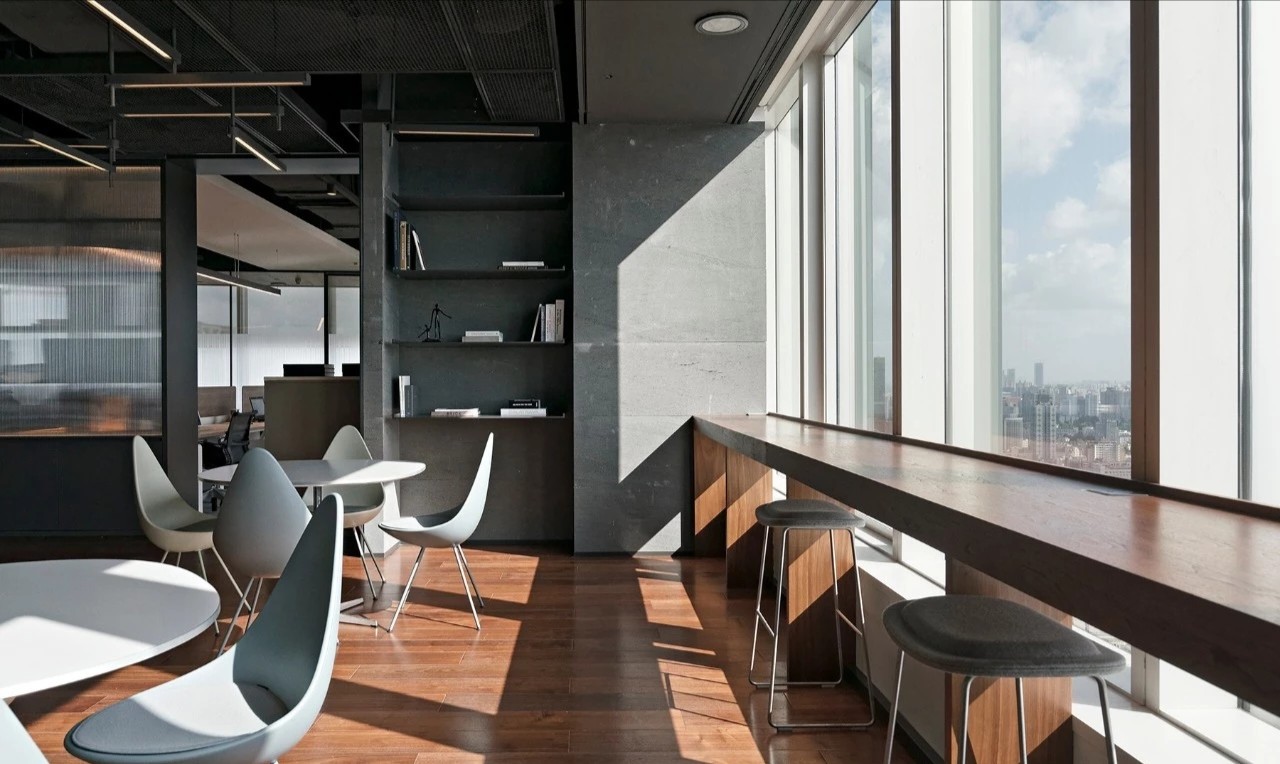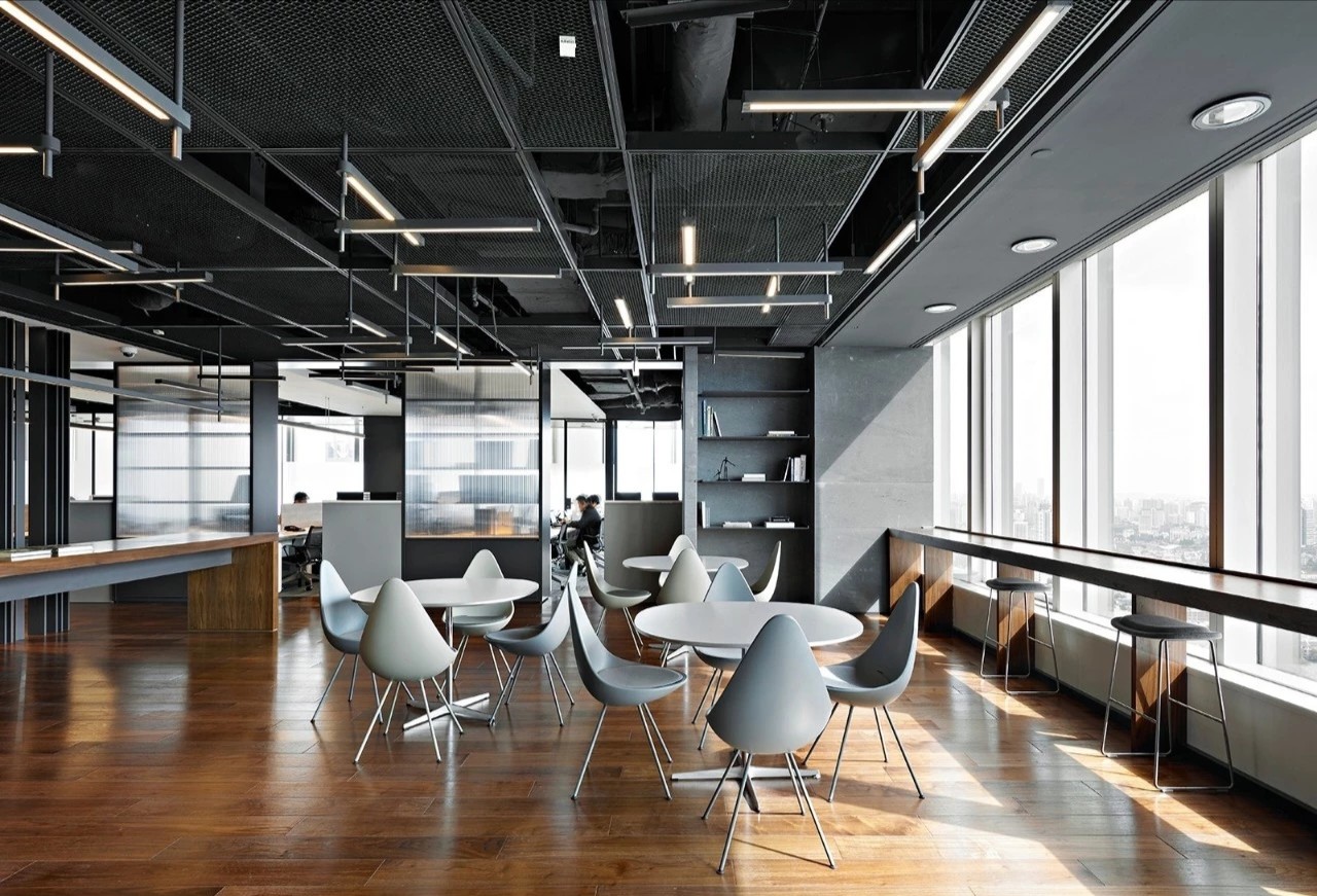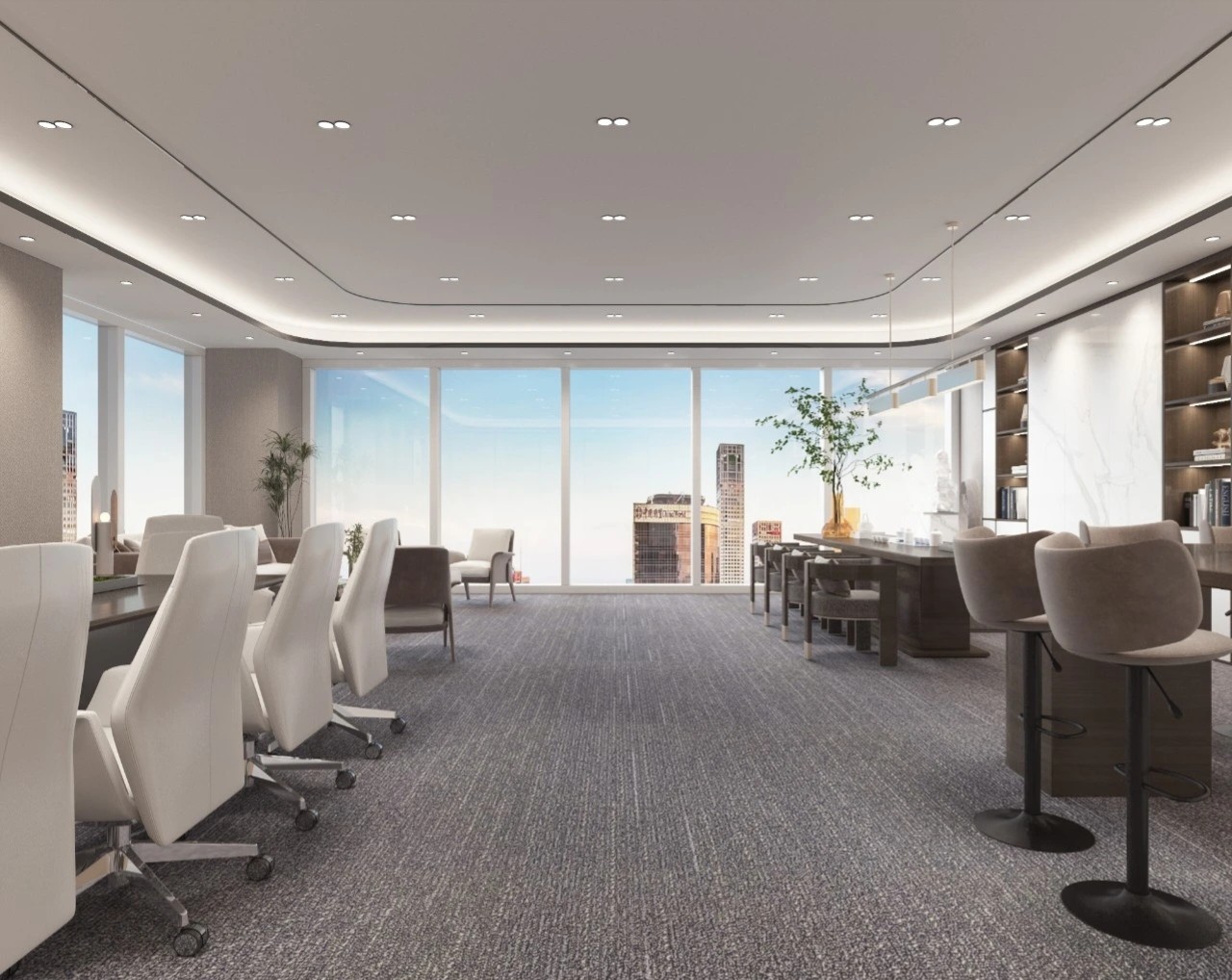 考虑到公共办公区面积较大人员较多,平面布局相对更加严谨,运用地毯穿插、叠加、相交让不同区块,整洁有序,辨识度更高。温暖的木饰面让空间变得更加柔和、流动效率更高。休闲区放置异形沙发,温和的绒毛与超大尺寸的坐深拉伸视线、提升质感。背景在原木色包裹之下压低商务感,令人心情放松,由此完成一种办公、会客与休闲氛围的融合。