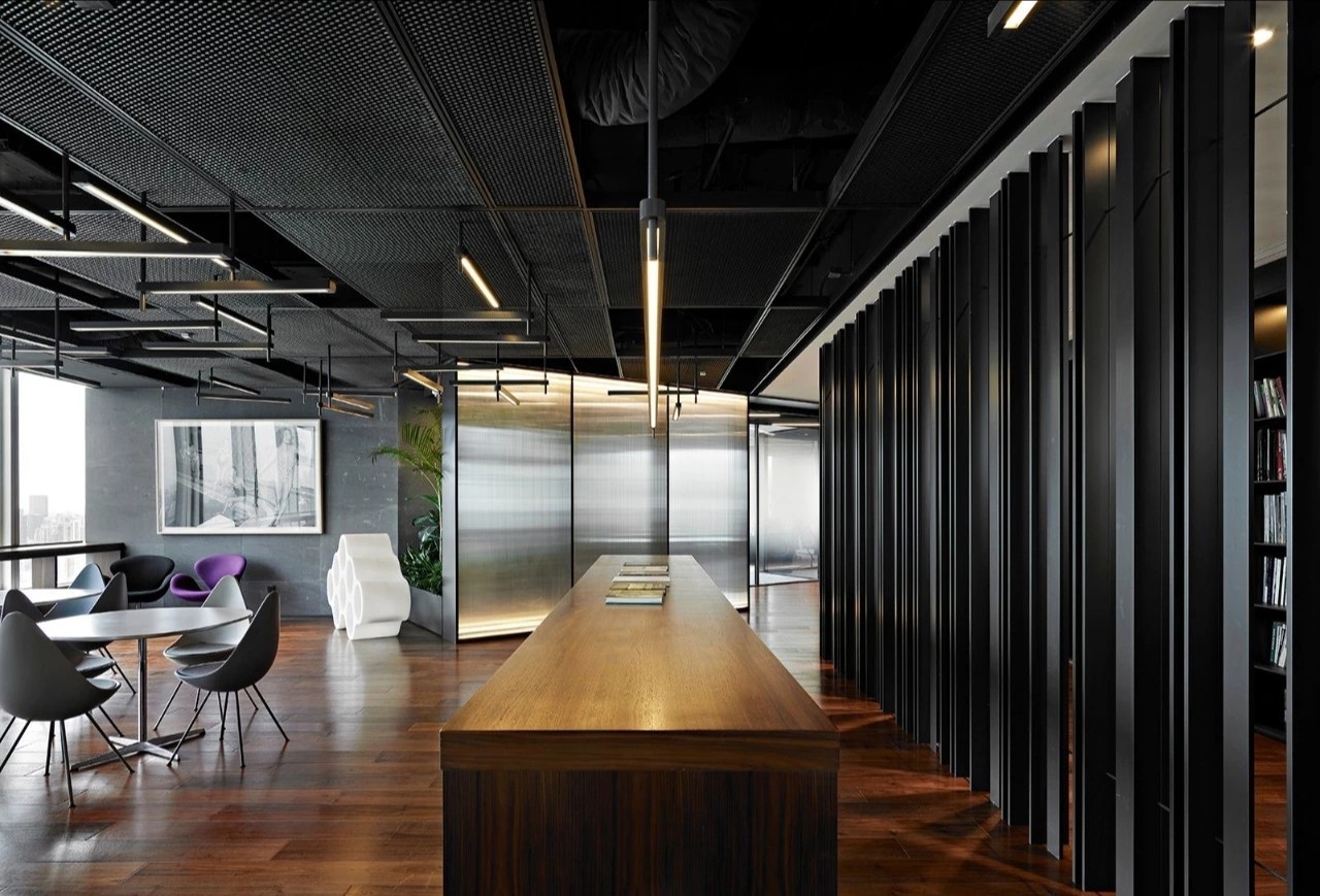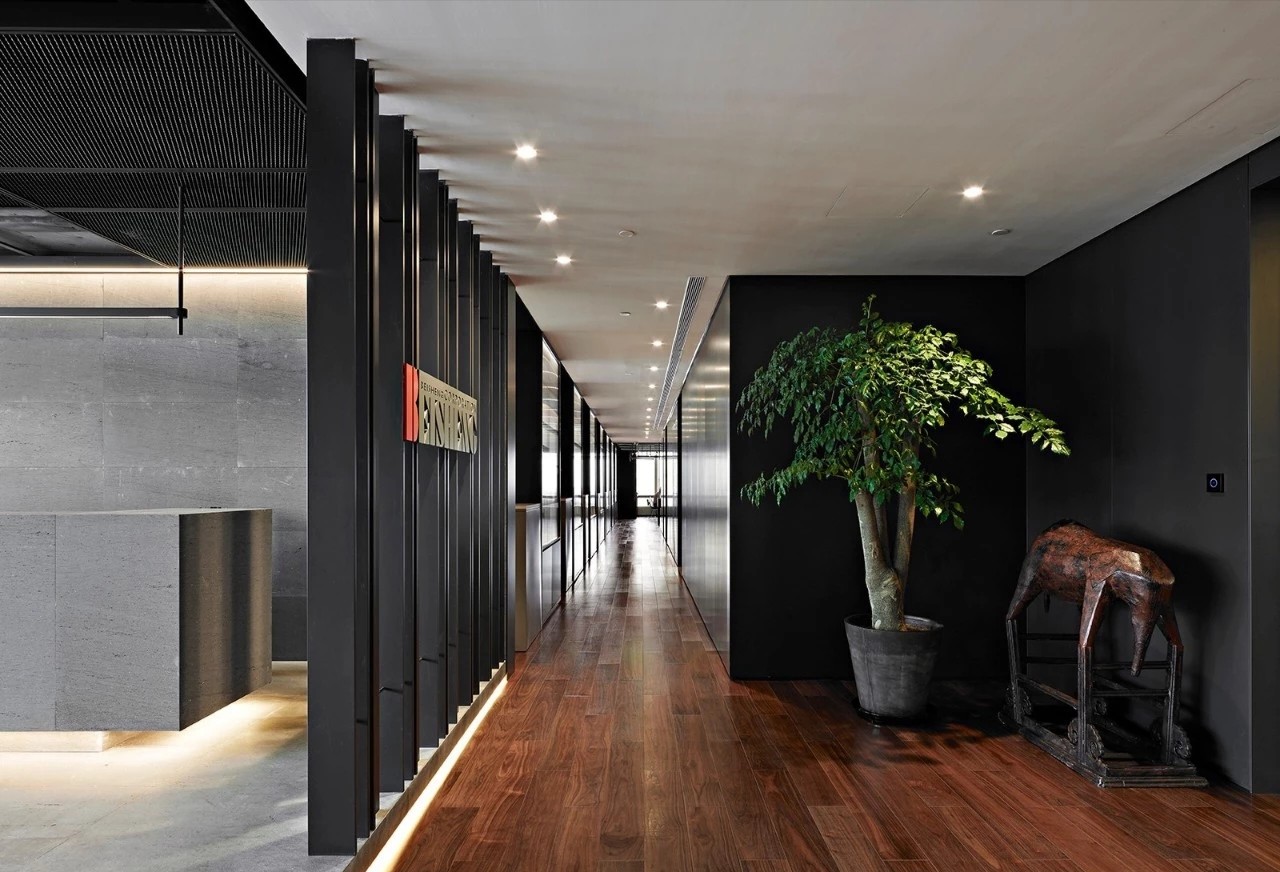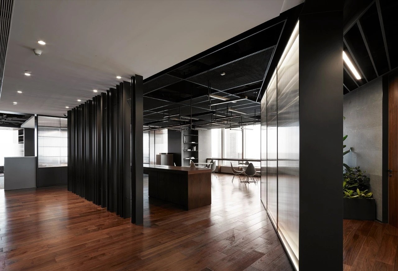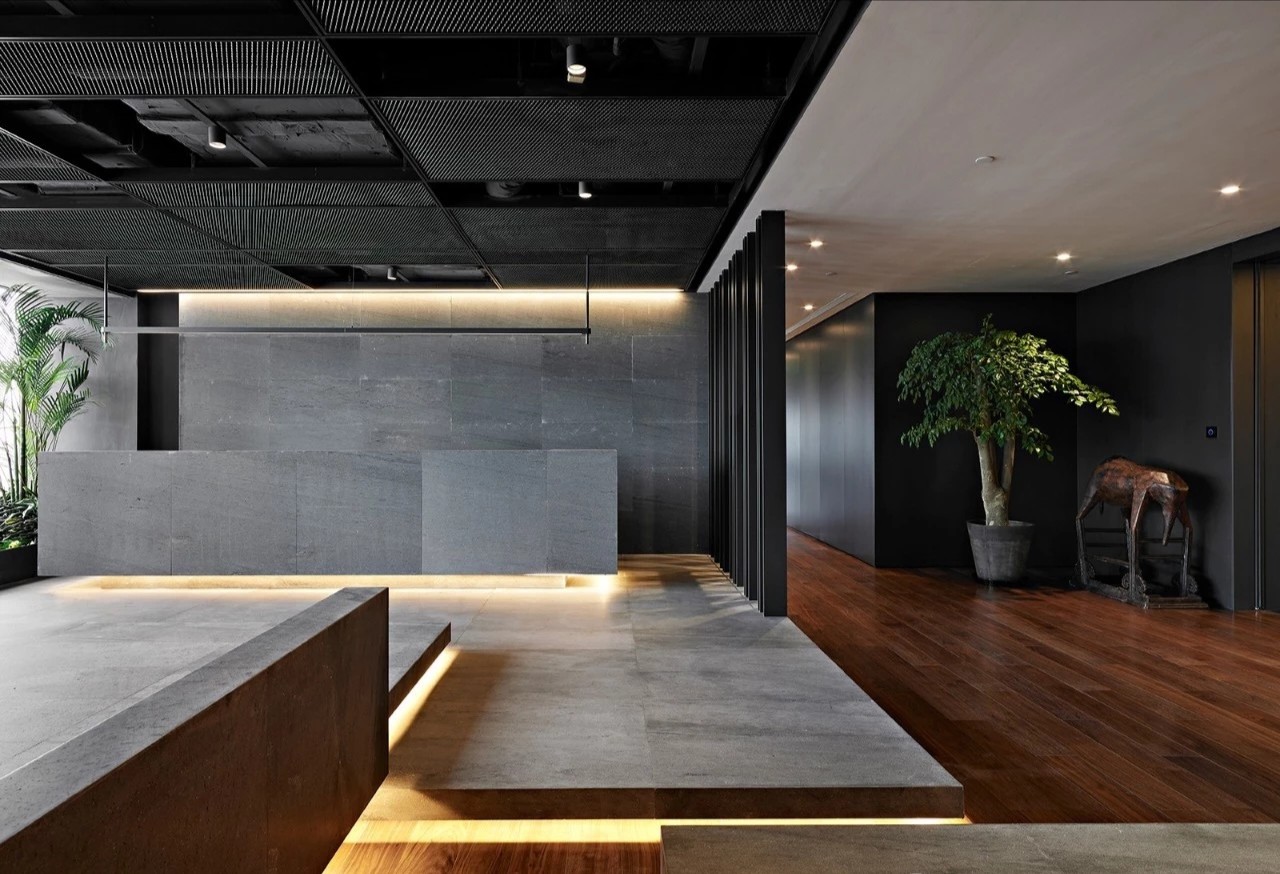项目中并没有将接待台的位置按照传统意来正对入口,而是半隐在由金属百叶铸成的logo墙背后。阶台,光带,绿植,造影,一层层渐退在深灰色的基调之中,时尚且富有质感,使造访者感受犹如步入桃源般的惊喜。