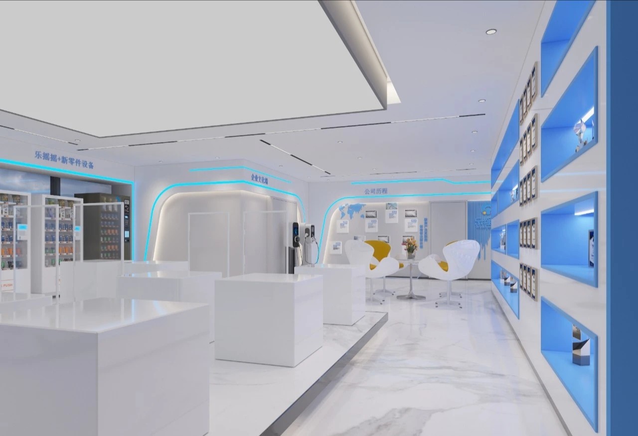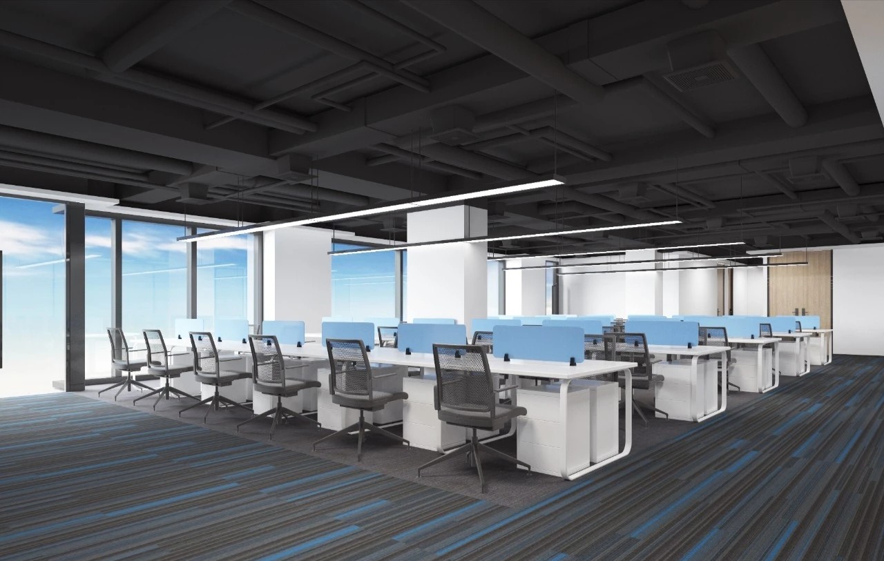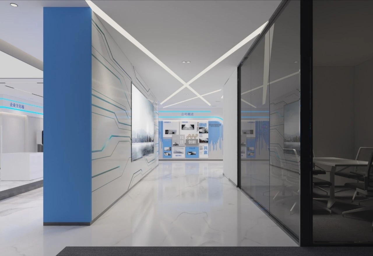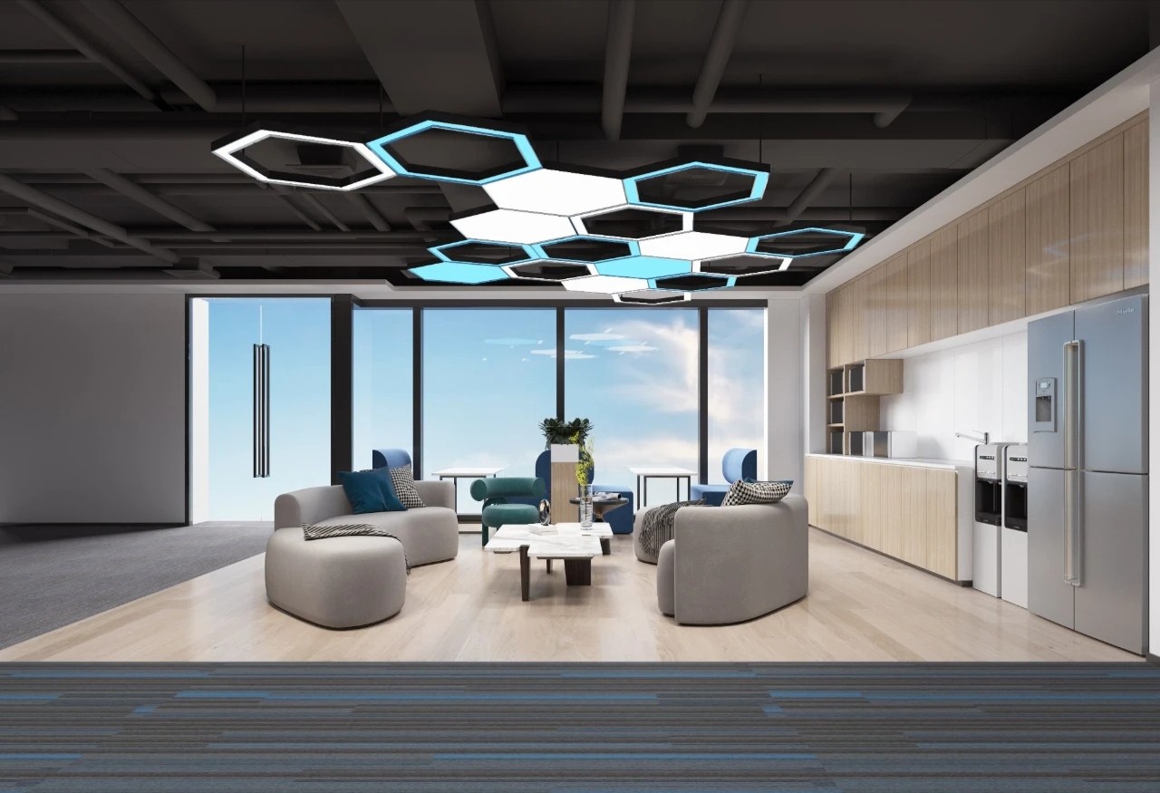 总体办公中心延展时尚年轻的设计调性和思路,整体取品牌视觉基色“蓝色”作主线,恰如其分地将色彩心理学伏笔在空间当中,潜移默化发挥 工作状态所需的正向理性反馈、品牌IP故事场景化、以及提高员工对企业价值和身份认可的效果。