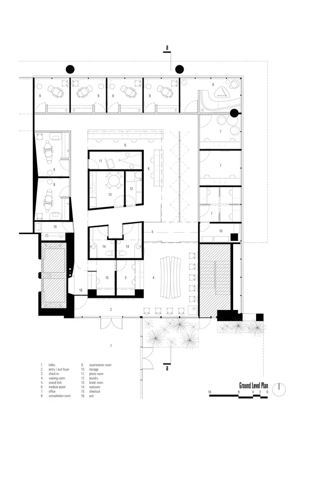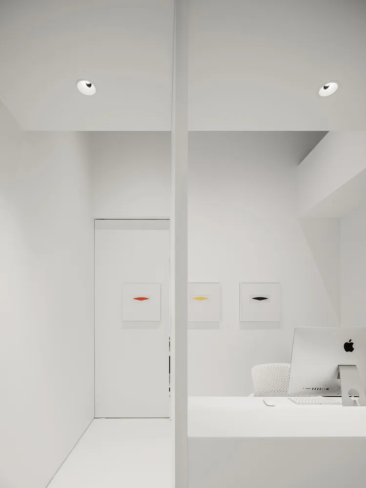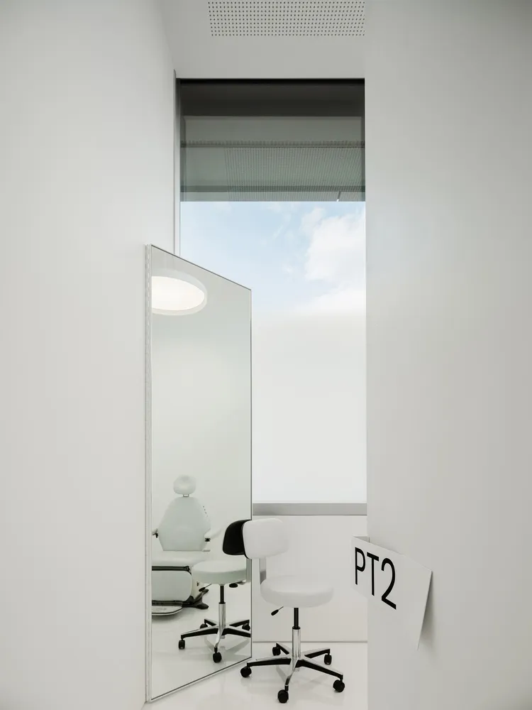 平面图的中心是辅助空间,正面是一面入口采光墙。白色的中性色调呈现出自然光不断变化的色彩,通过软硬(隔音)家具,包括吸顶灯和精心策划的艺术项目,俏皮地强调了这一点。白色也是为女病人提供的黑色丝质长袍的中性背景。这种图案也成为大门的图案。SWBA 的室内设计旨在延伸/放大光线(色彩),将每位患者的旅程都包裹在一种恢复活力的氛围中。
