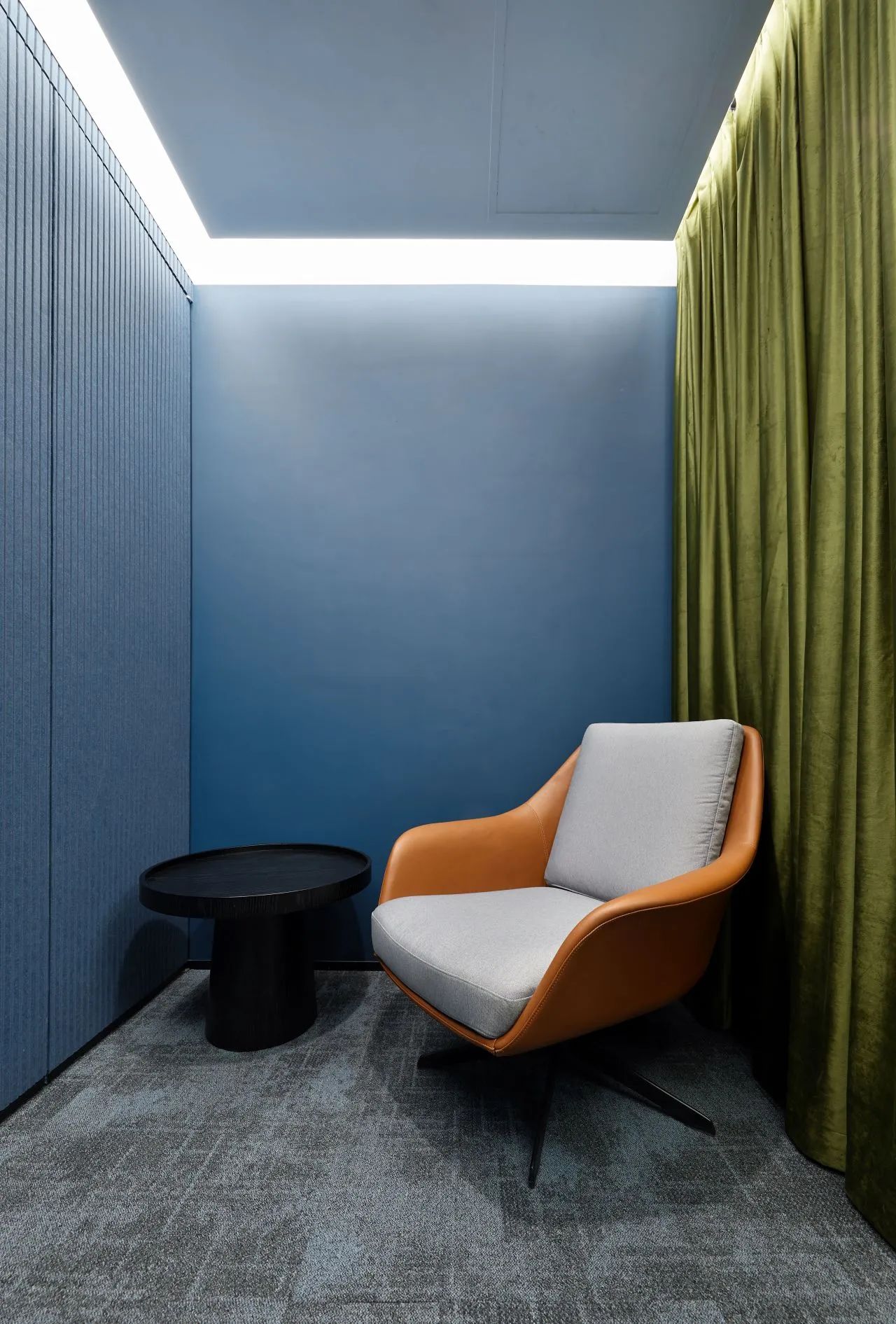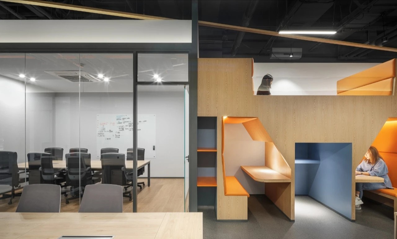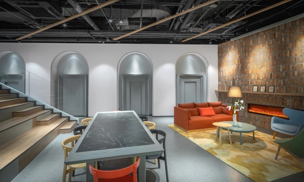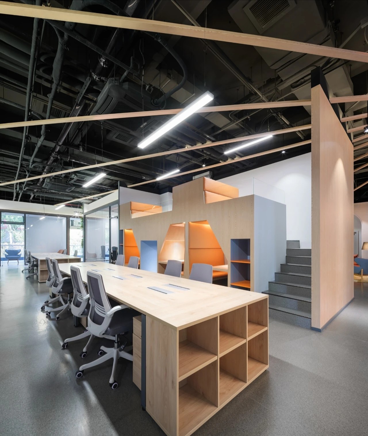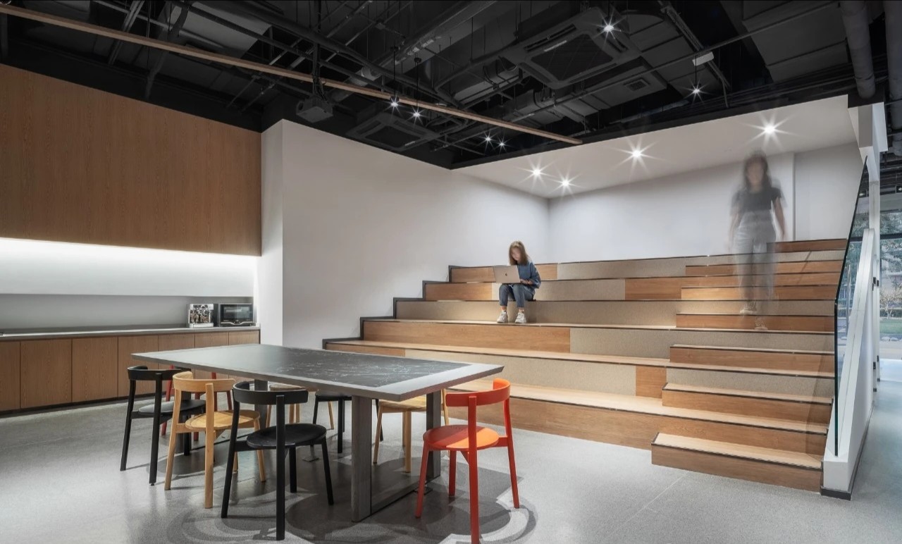 传统的独立办公室为一些工作提供了相对私密的空间。开放办公及双层办公空间则创造了轻松活跃的工作氛围,并使办公区变得更加开阔。场地南侧墙体为玻璃幕墙,不仅为对应的办公室提供充足的采光,同时也为室内与室外创建了视觉上的交流,充分体现“开放办公”的概念。一体式双层办公区为空间的纵向增添层次感,并与其身后的大台阶相呼应。利用人体工学及坐姿产生的高差,上下办公空间交错排布,保证了舒适的使用感受,并在下方切割出梯形边框的独立的办公空间,为办公区添加了几何感。上方是开放型办公桌,可作为少数人使用的的小组讨论空间。