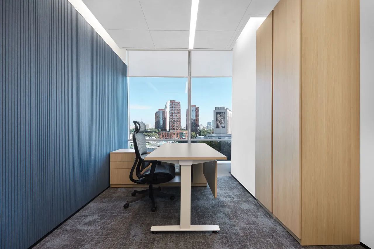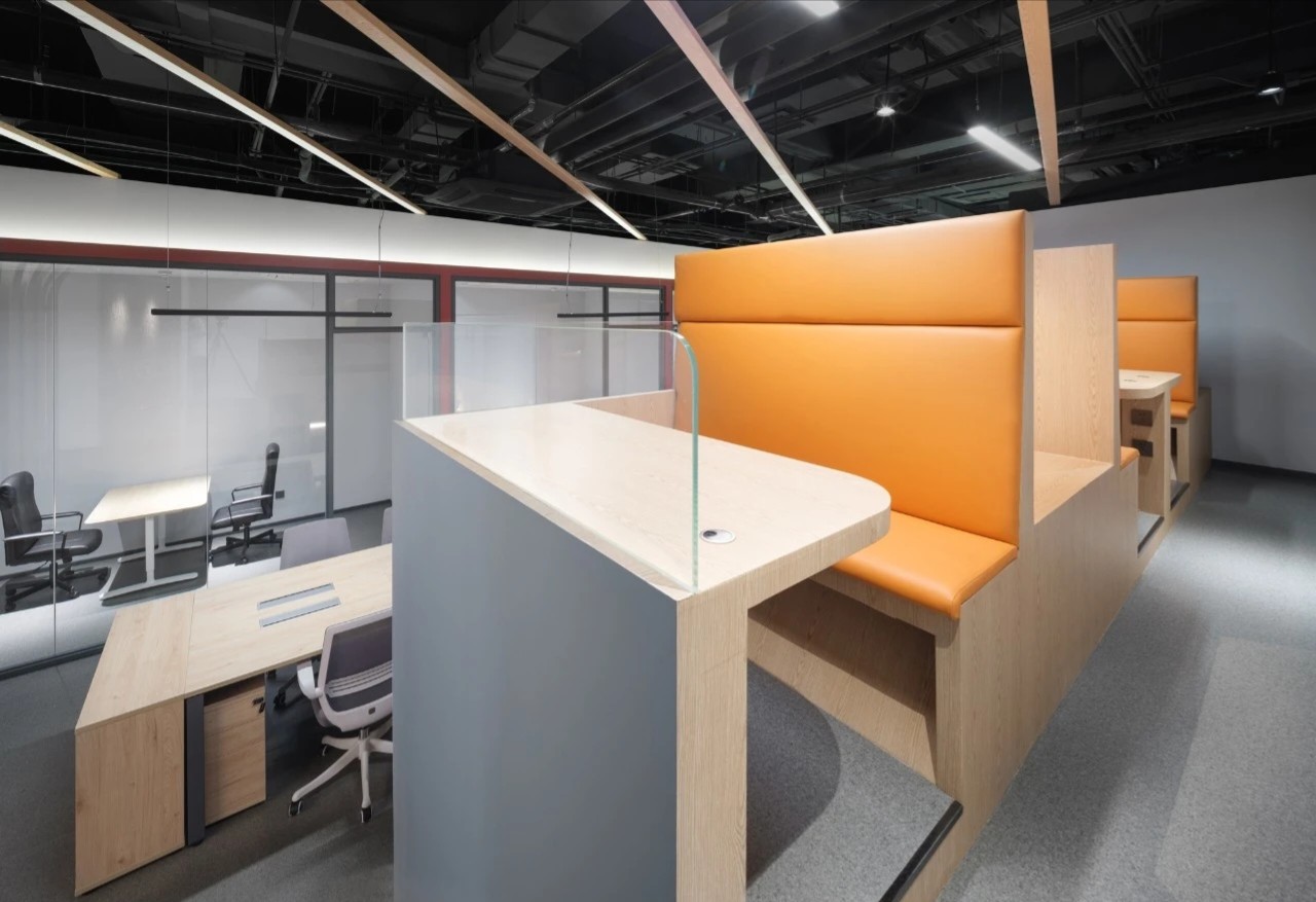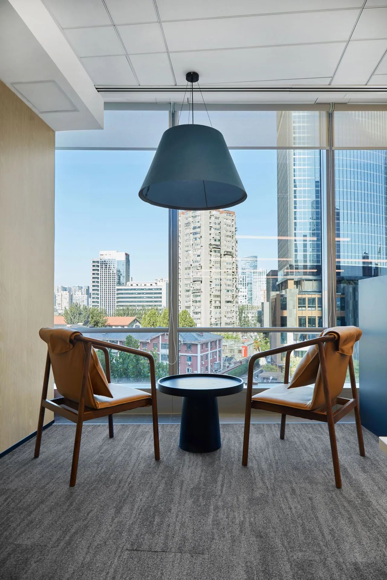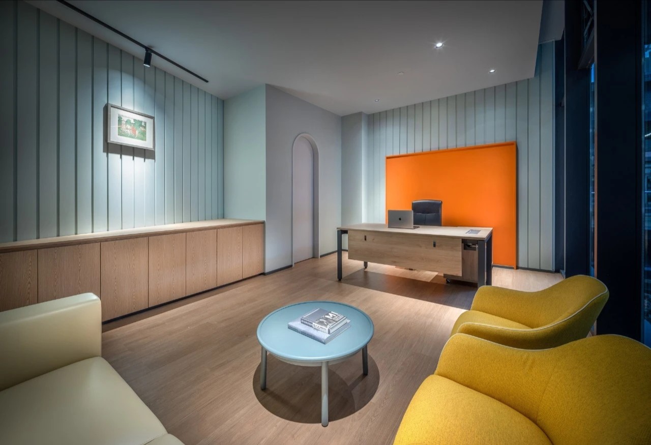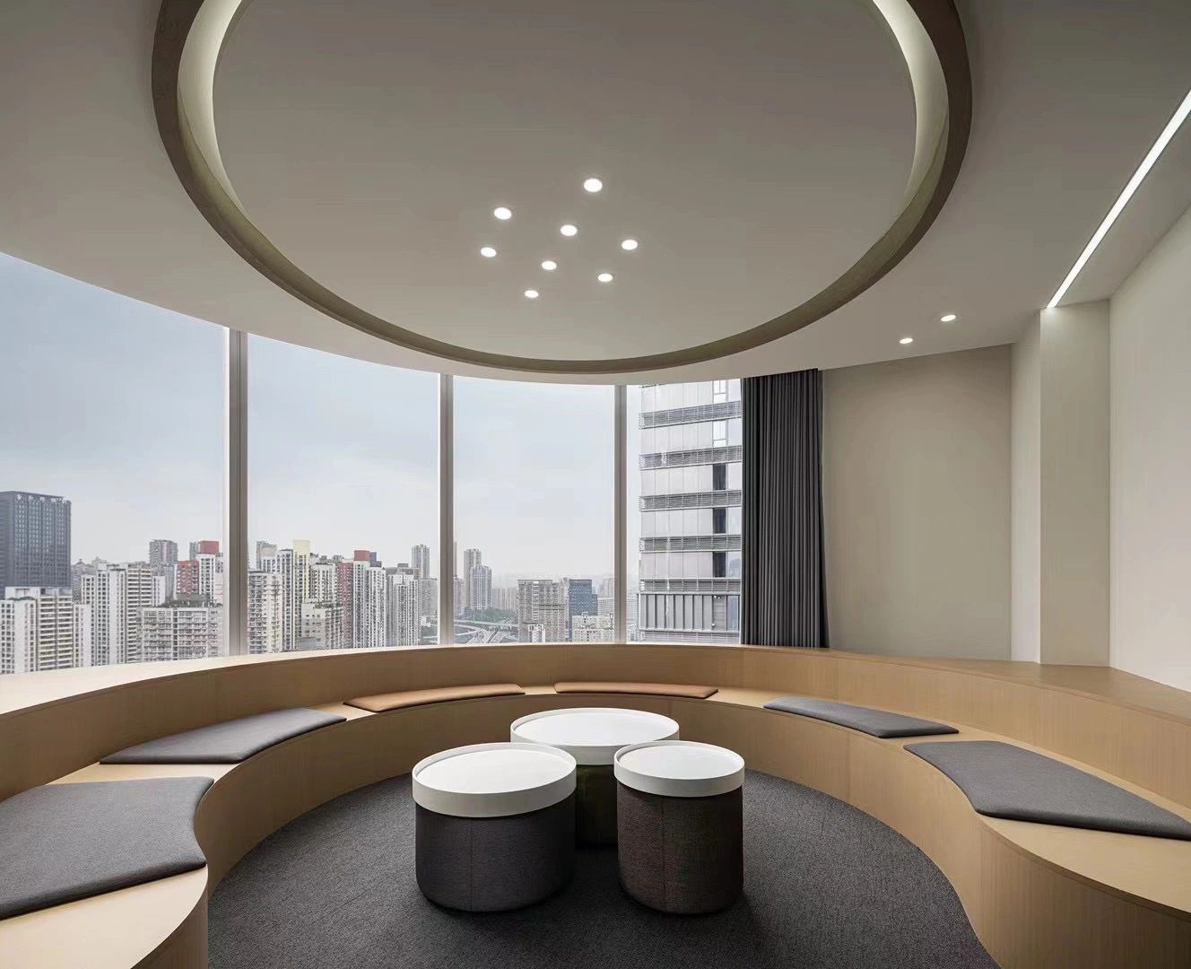 传统的独立办公室为一些工作提供了相对私密的空间。开放办公及双层办公空间则创造了轻松活跃的工作氛围,并使办公区变得更加开阔。场地南侧墙体为玻璃幕墙,不仅为对应的办公室提供充足的采光,同时也为室内与室外创建了视觉上的交流,充分体现“开放办公”的概念。一体式双层办公区为空间的纵向增添层次感,并与其身后的大台阶相呼应。利用人体工学及坐姿产生的高差,上下办公空间交错排布,保证了舒适的使用感受,并在下方切割出梯形边框的独立的办公空间,为办公区添加了几何感。上方是开放型办公桌,可作为少数人使用的的小组讨论空间。