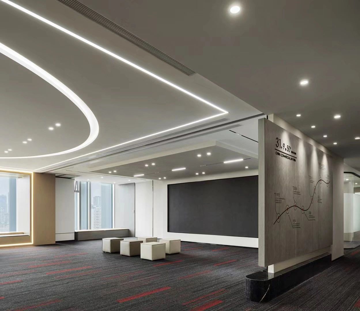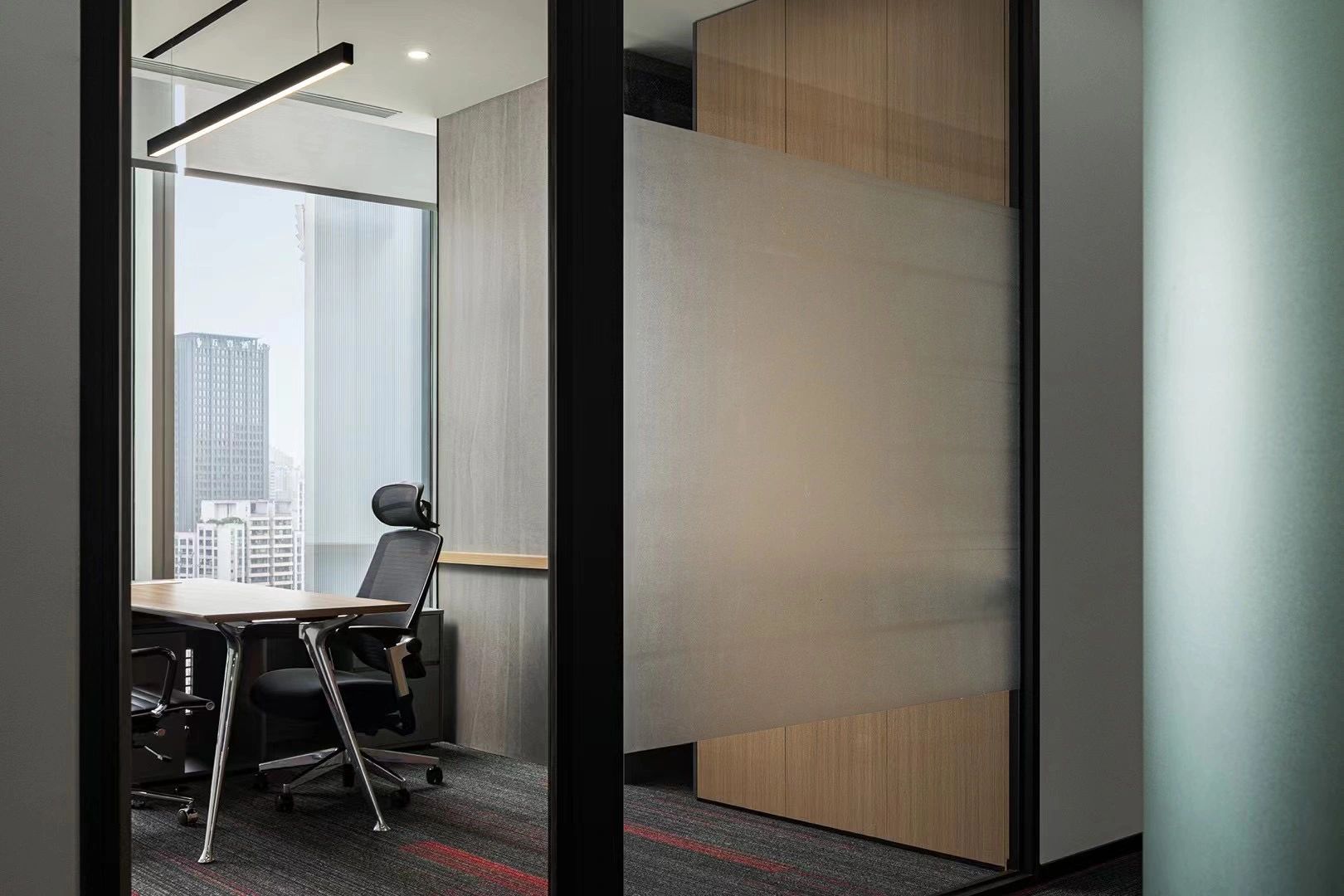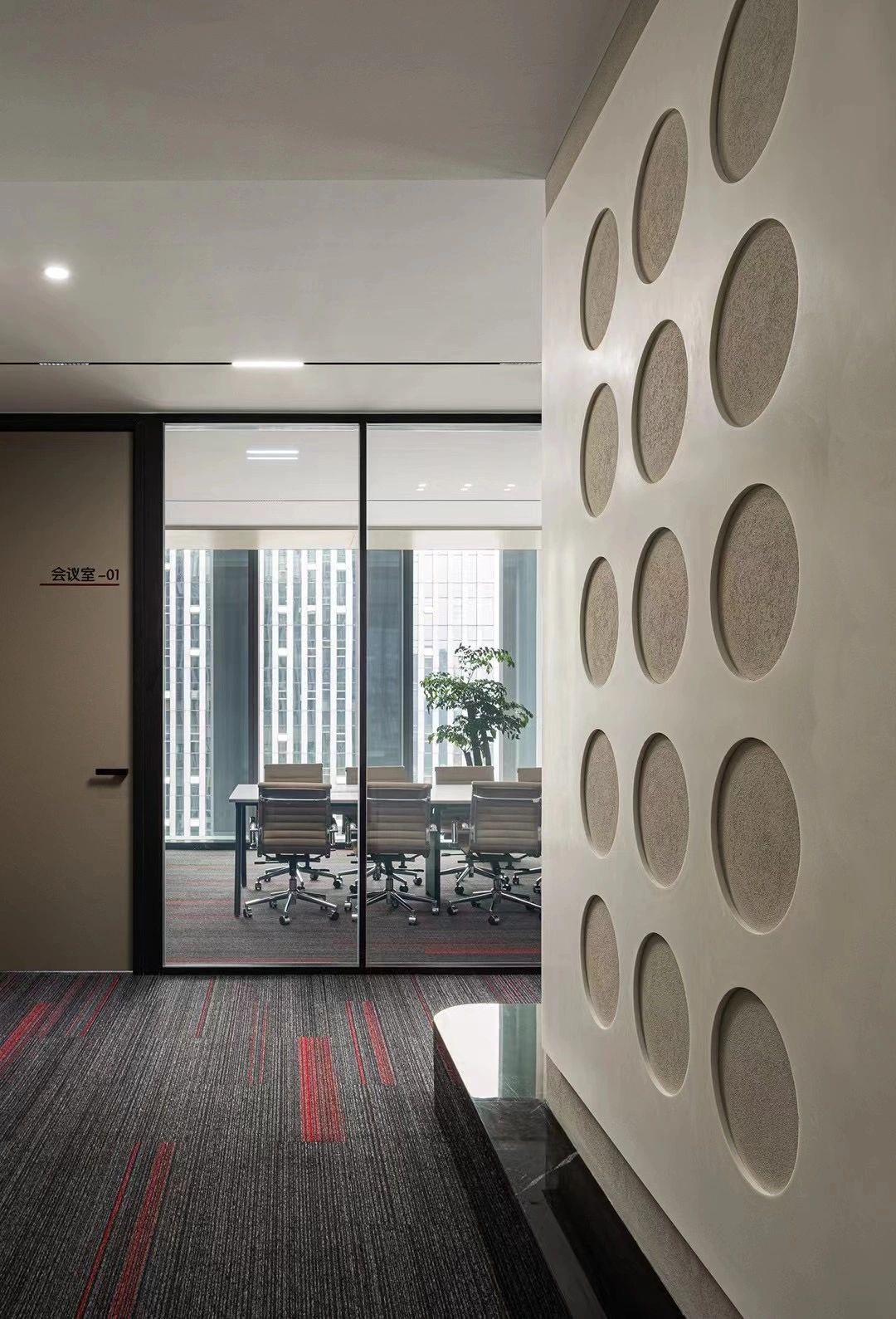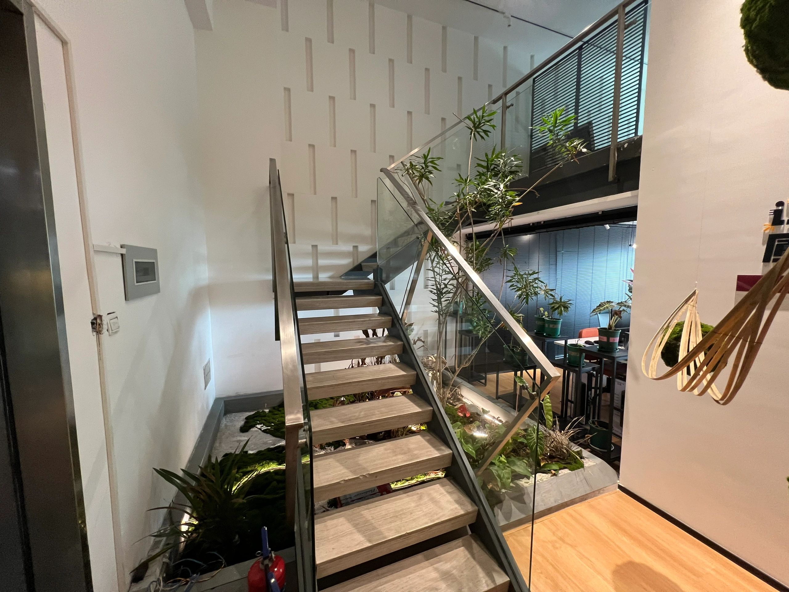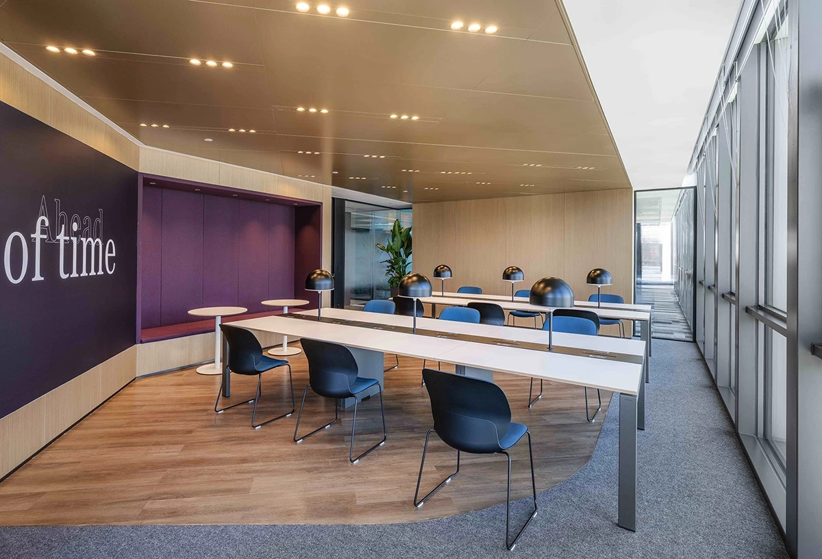 传统的独立办公室为一些工作提供了相对私密的空间。开放办公及双层办公空间则创造了轻松活跃的工作氛围,并使办公区变得更加开阔。场地南侧墙体为玻璃幕墙,不仅为对应的办公室提供充足的采光,同时也为室内与室外创建了视觉上的交流,充分体现“开放办公”的概念。一体式双层办公区为空间的纵向增添层次感,并与其身后的大台阶相呼应。利用人体工学及坐姿产生的高差,上下办公空间交错排布,保证了舒适的使用感受,并在下方切割出梯形边框的独立的办公空间,为办公区添加了几何感。上方是开放型办公桌,可作为少数人使用的的小组讨论空间。