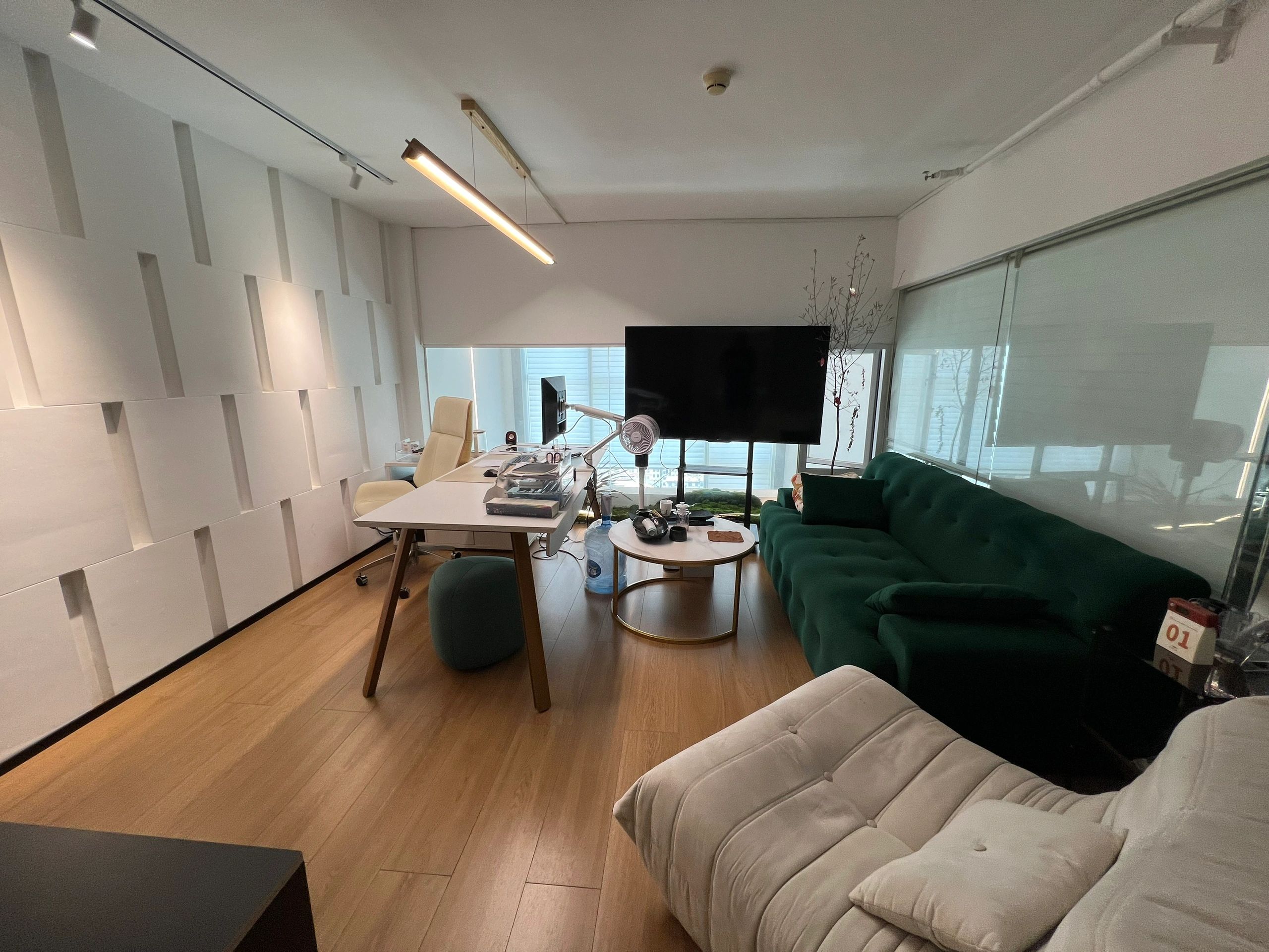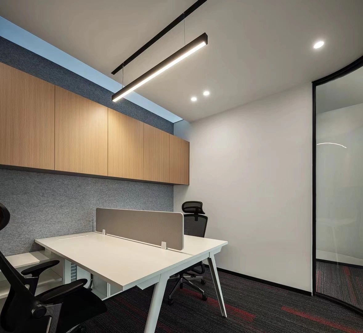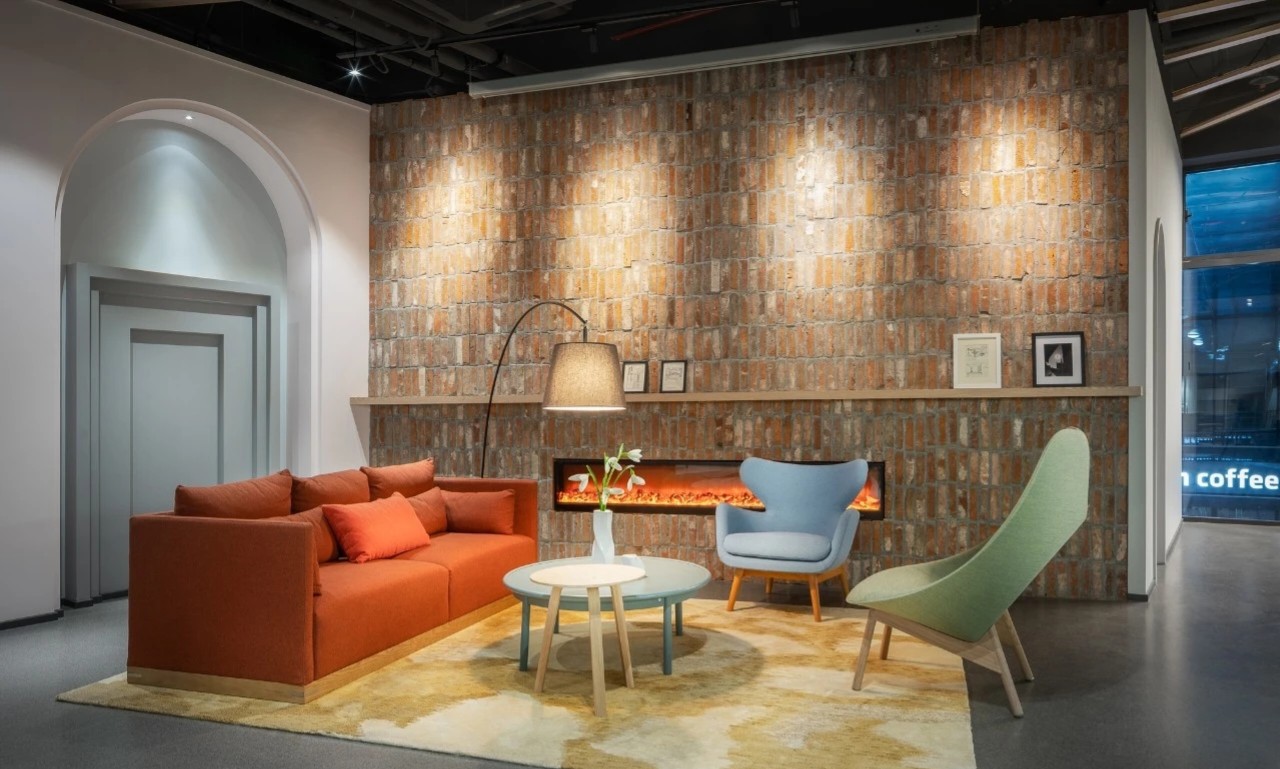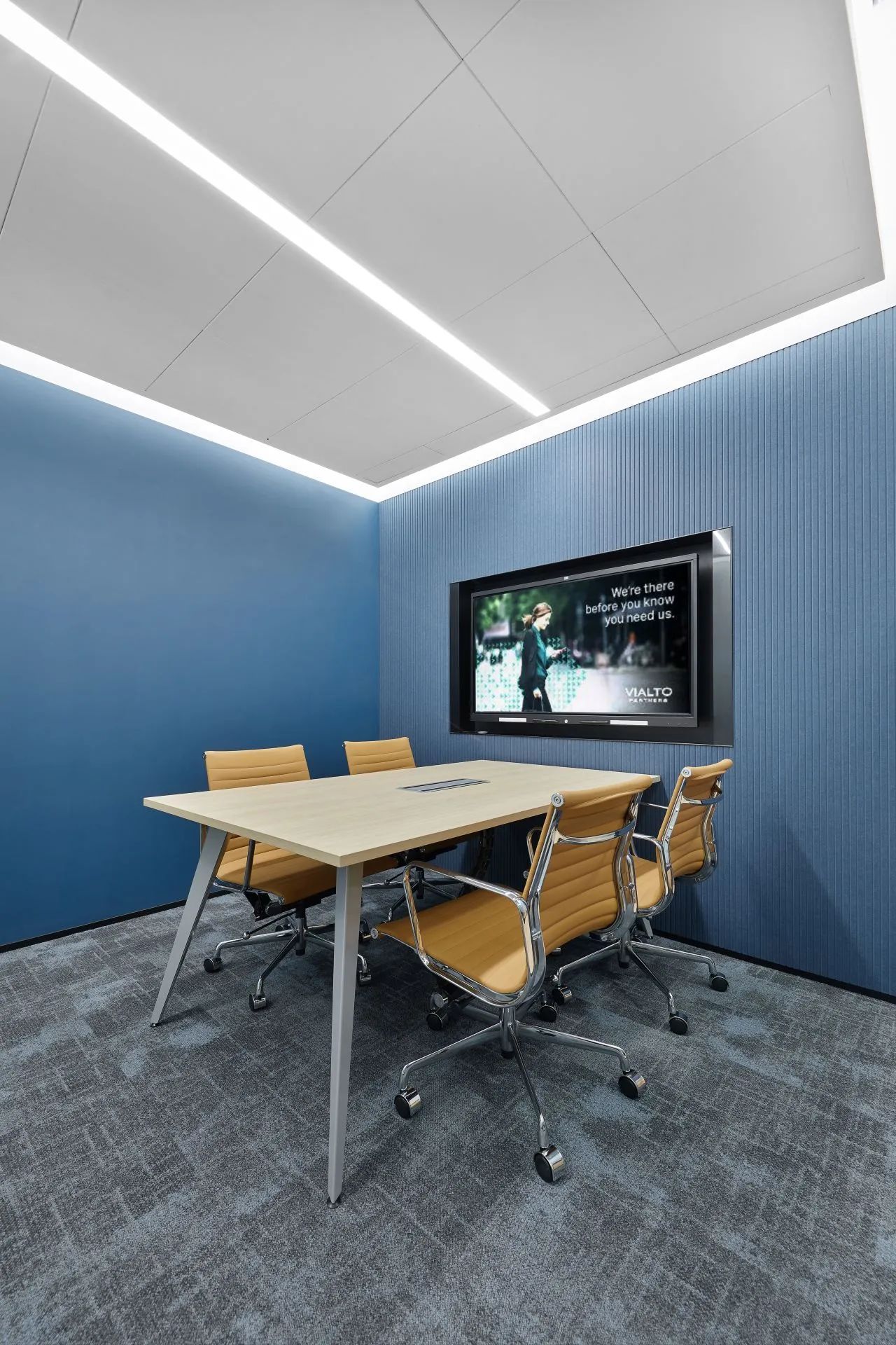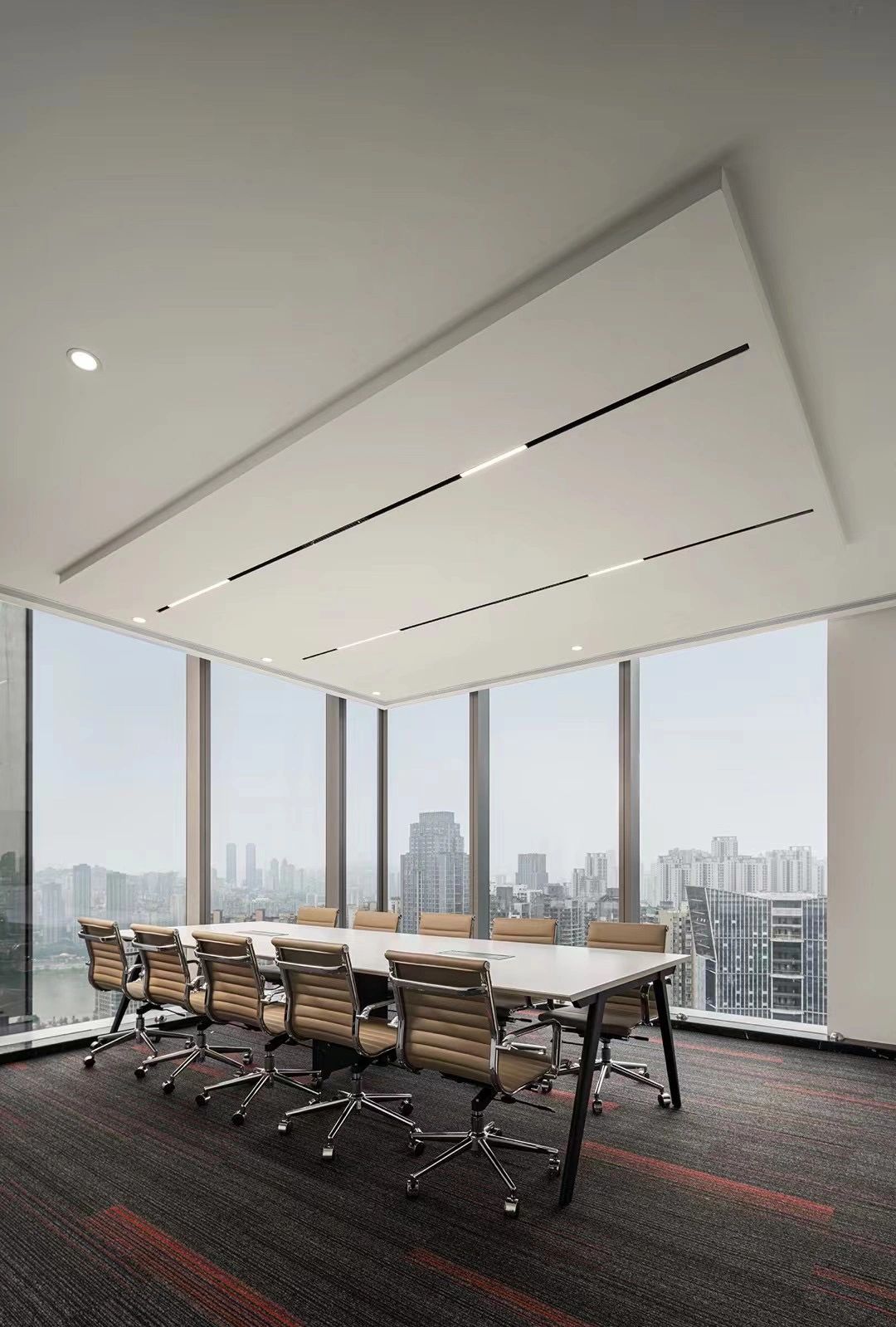 传统的独立办公室为一些工作提供了相对私密的空间。开放办公及双层办公空间则创造了轻松活跃的工作氛围,并使办公区变得更加开阔。场地南侧墙体为玻璃幕墙,不仅为对应的办公室提供充足的采光,同时也为室内与室外创建了视觉上的交流,充分体现“开放办公”的概念。一体式双层办公区为空间的纵向增添层次感,并与其身后的大台阶相呼应。利用人体工学及坐姿产生的高差,上下办公空间交错排布,保证了舒适的使用感受,并在下方切割出梯形边框的独立的办公空间,为办公区添加了几何感。上方是开放型办公桌,可作为少数人使用的的小组讨论空间。