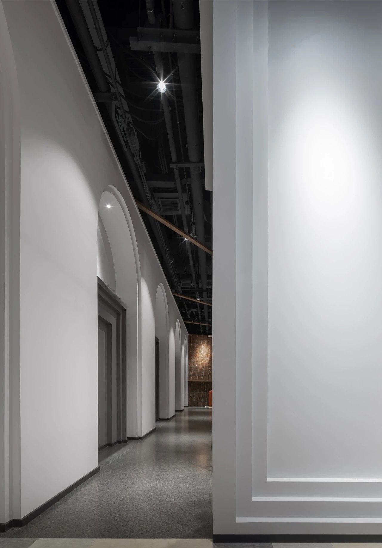 入口处,建筑外观,将意大利文艺复兴三杰之一的达芬奇的哈默手稿作为起点;入口门厅,用意大利古典主义美学元素作为入口空间的视觉引领。古罗马输水道的连续拱券,构成设计灵感,抽象成为连接入口与室内主要空间的过渡画廊。
