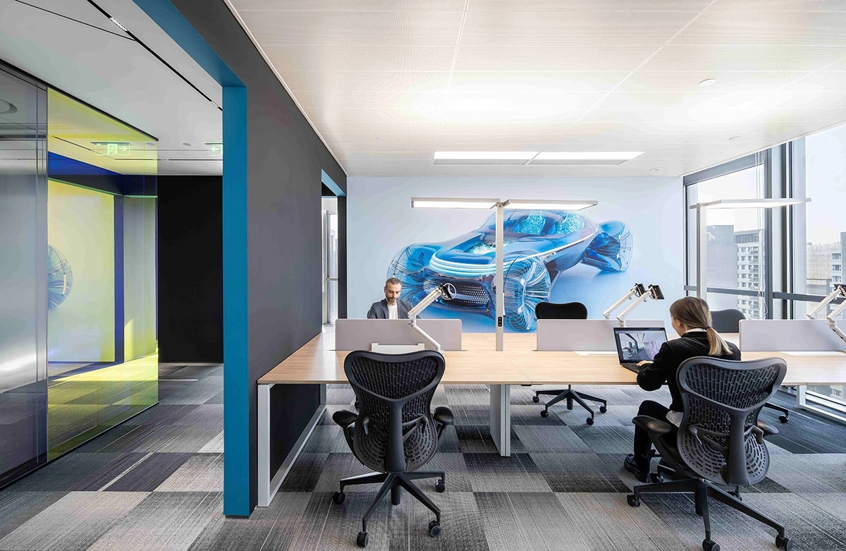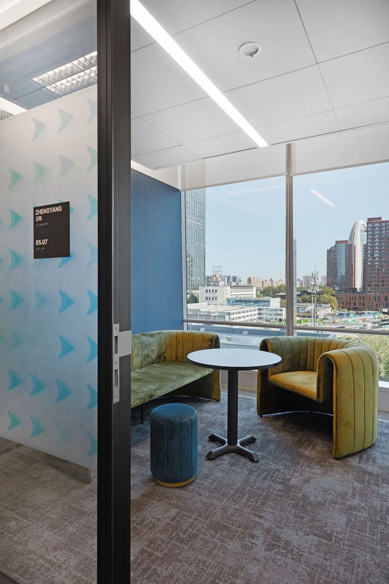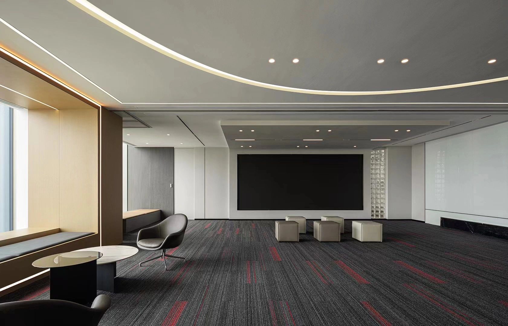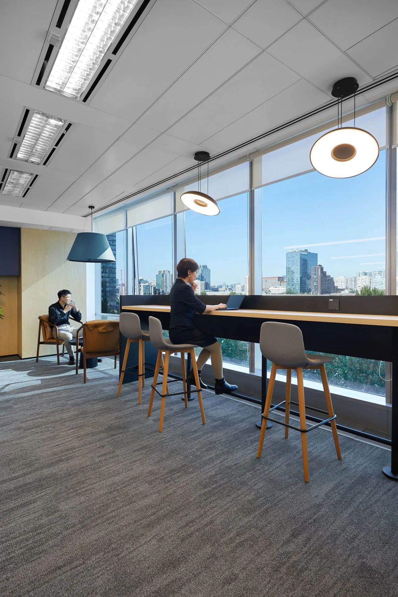 项目采用“数字河流”的设计理念,借鉴了上海历史悠久的水道和不断流动的数字信息之间,将其转化为诗意的平行,象征着物理和虚拟领域的连接。这个概念基础通过一系列的设计元素被赋予了新的生命延展性:地毯图案模仿了海滨和河流的聚汇,天花造型设计的灵感来自河流的节奏,让人漫步其中感受到到音乐作品的流动以渐强和停顿为标志。为了满足分隔专注性办公区域和配套独立功能需求,公共走道设计灵感来自石库门附近的老上海元素:上海的鲜明特征,标志性的门户元素,给现代工作场所一种地域文化归属感。办公场所包括3层,每层1150平方米,平面功能经过整体规划和布局,充分利用自然光线,混合了开放工作区、协作区和专注工作间。为了加强团队的沟通和协作的需求,每个工作组除了固定工位还布局了指定协作区域。这确保了每工位的最佳间隔,为团队合作创造了有利的环境和舒适度。总的来说,办公场所包括一流的设施,如一站式共享服务中心、图书区、冥想室、瑜伽室、健身室,以有助于在梅赛德斯一奔驰上海研发中心工作的员工健康和福祉的打造。此外,Gensler团队还对卫生间进行了扩建和重新设计,以符合公司的高标准和舒适度要求。