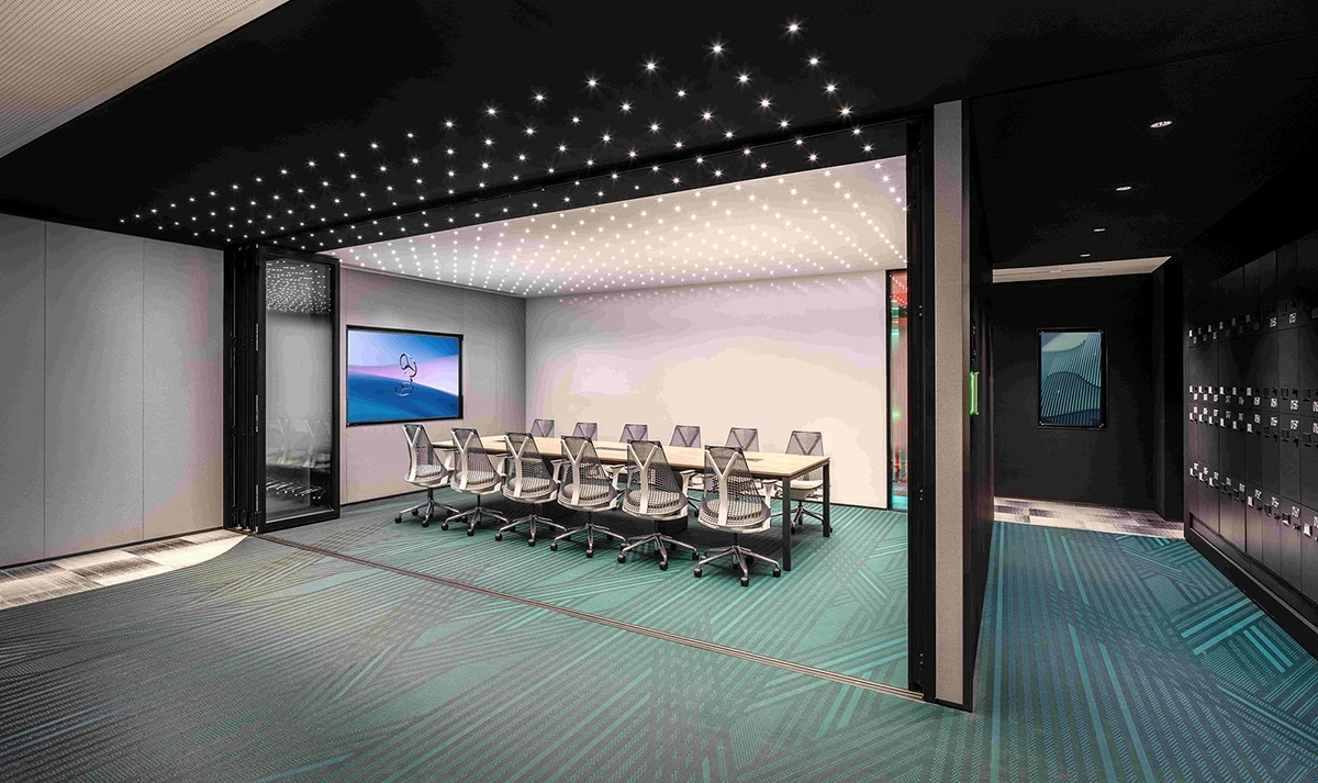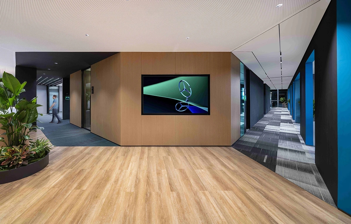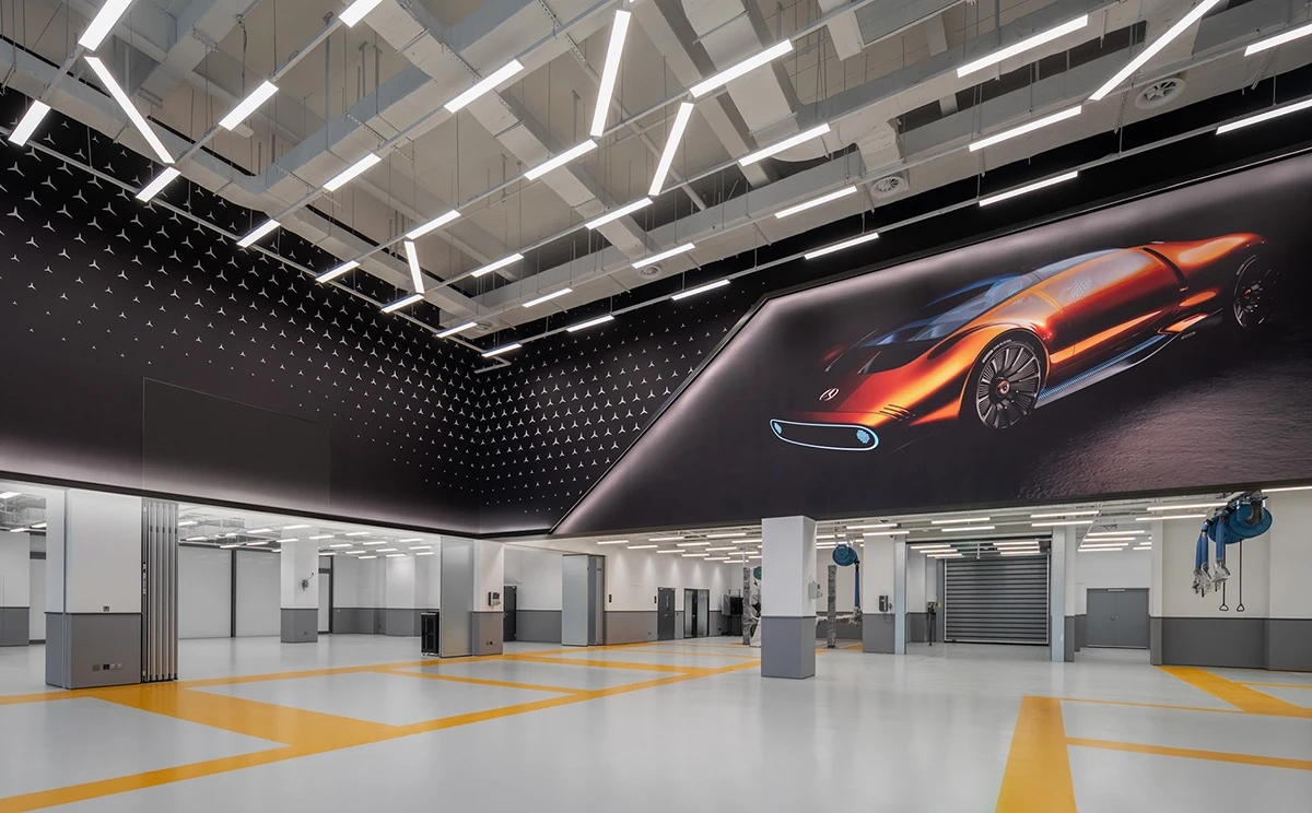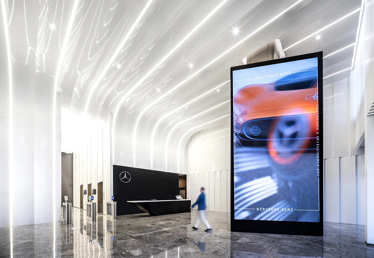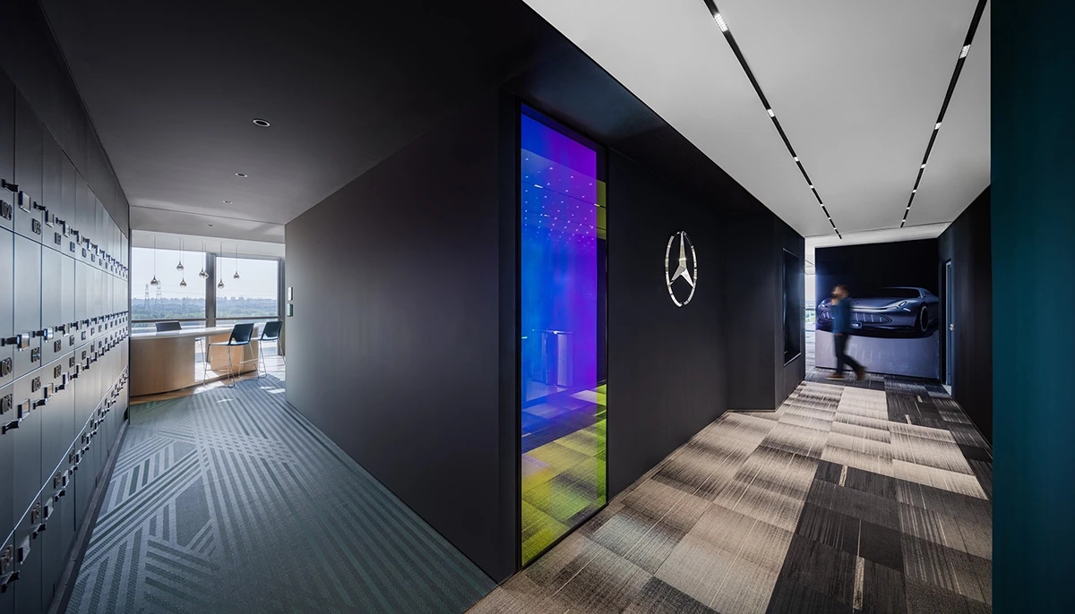 设计团队也对大堂进入和电梯首层进行升级改造,在不拆改现有空间的情况下,采用合理的方法赋予一个独特而令人难忘的达到体验。设计手法巧妙的将现有三角形的圆柱重塑为一个欢迎访客的大型LED屏幕,提供数字体验化氛围。定制化的图案图形巧妙地融合了抽象、科技和汽车主题,强化了空间的独特身份。