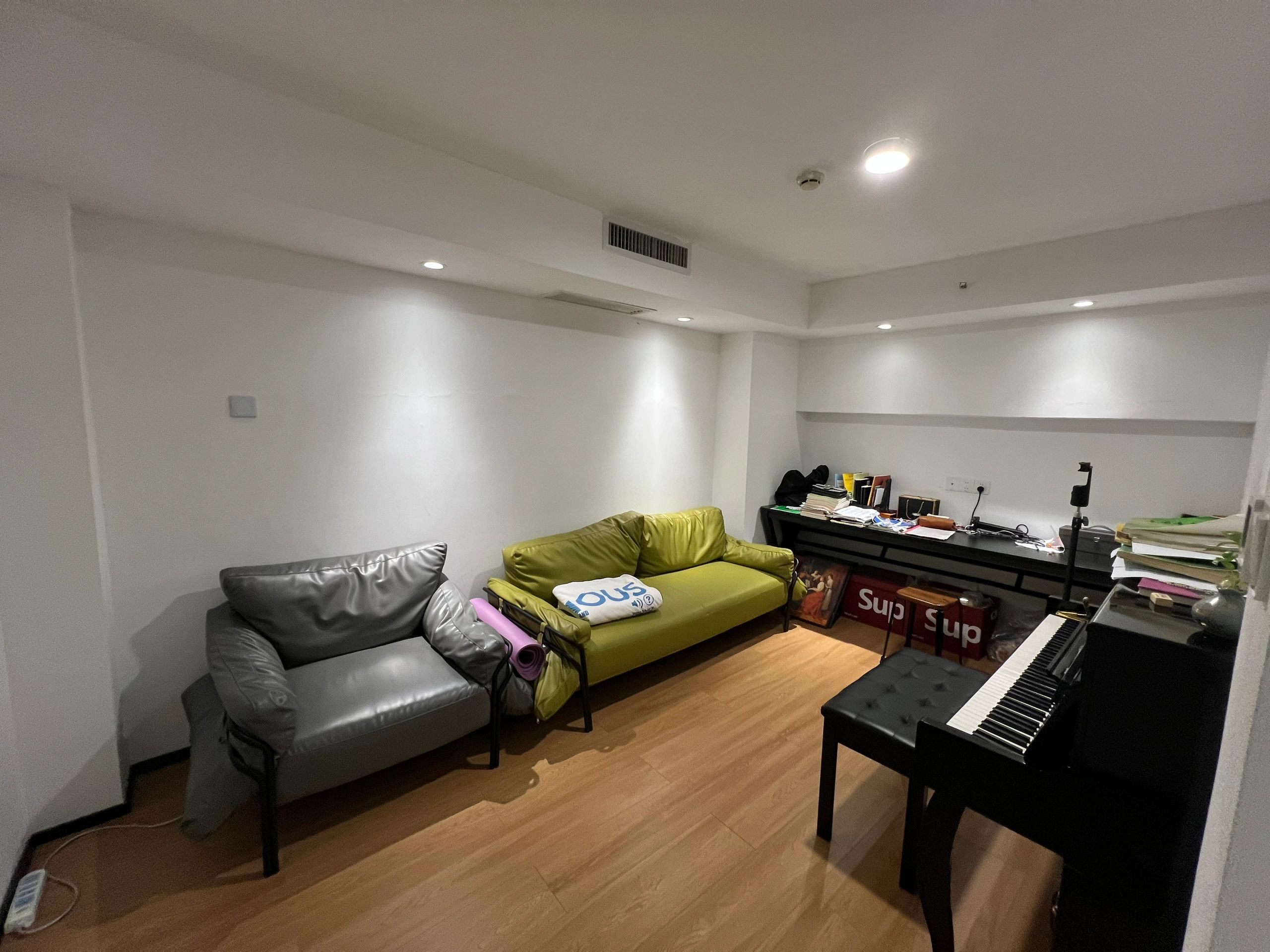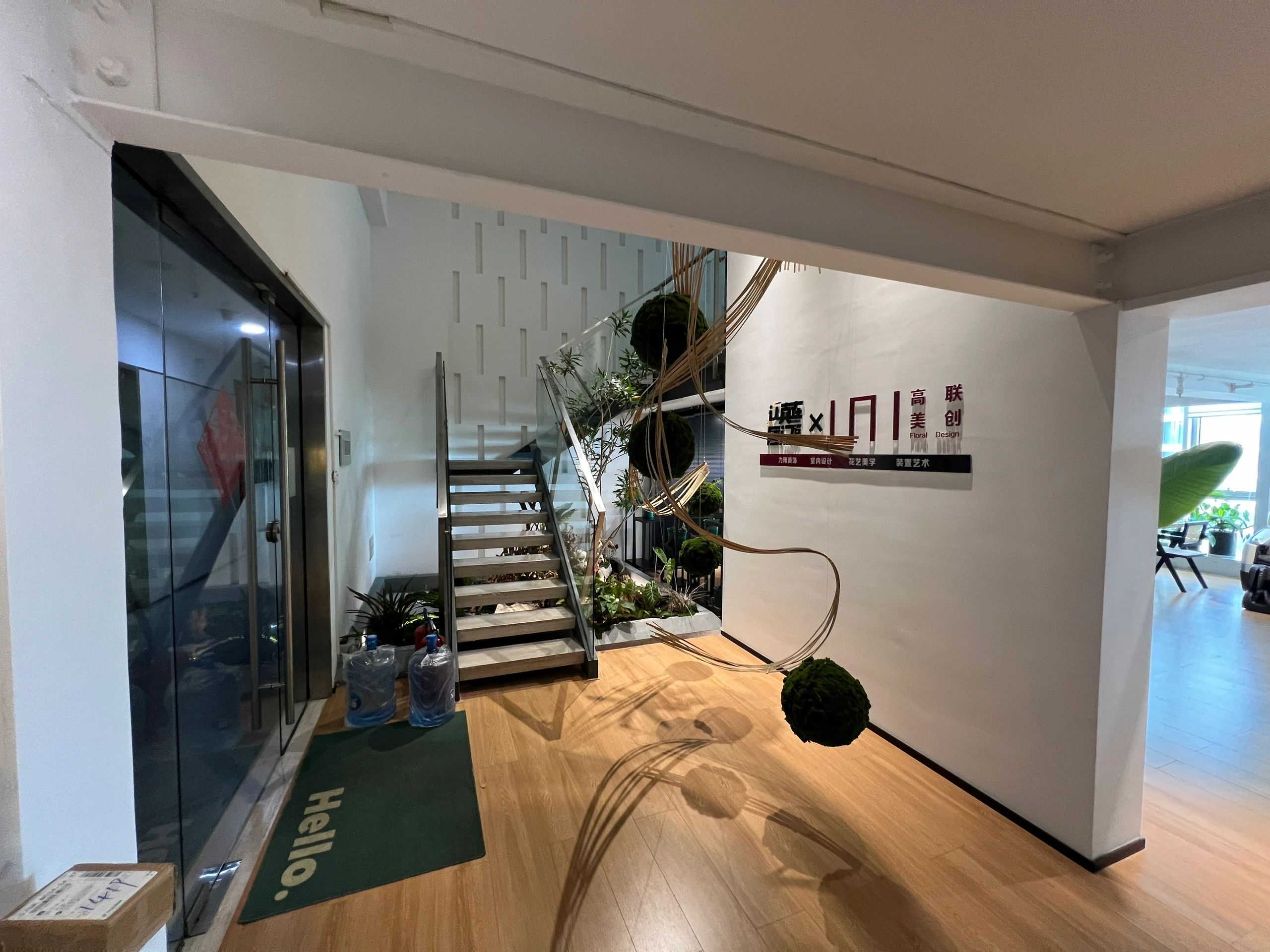 大门入口处对应着木质展示柜及绿植墙。通向储物间的入口也隐藏其中。