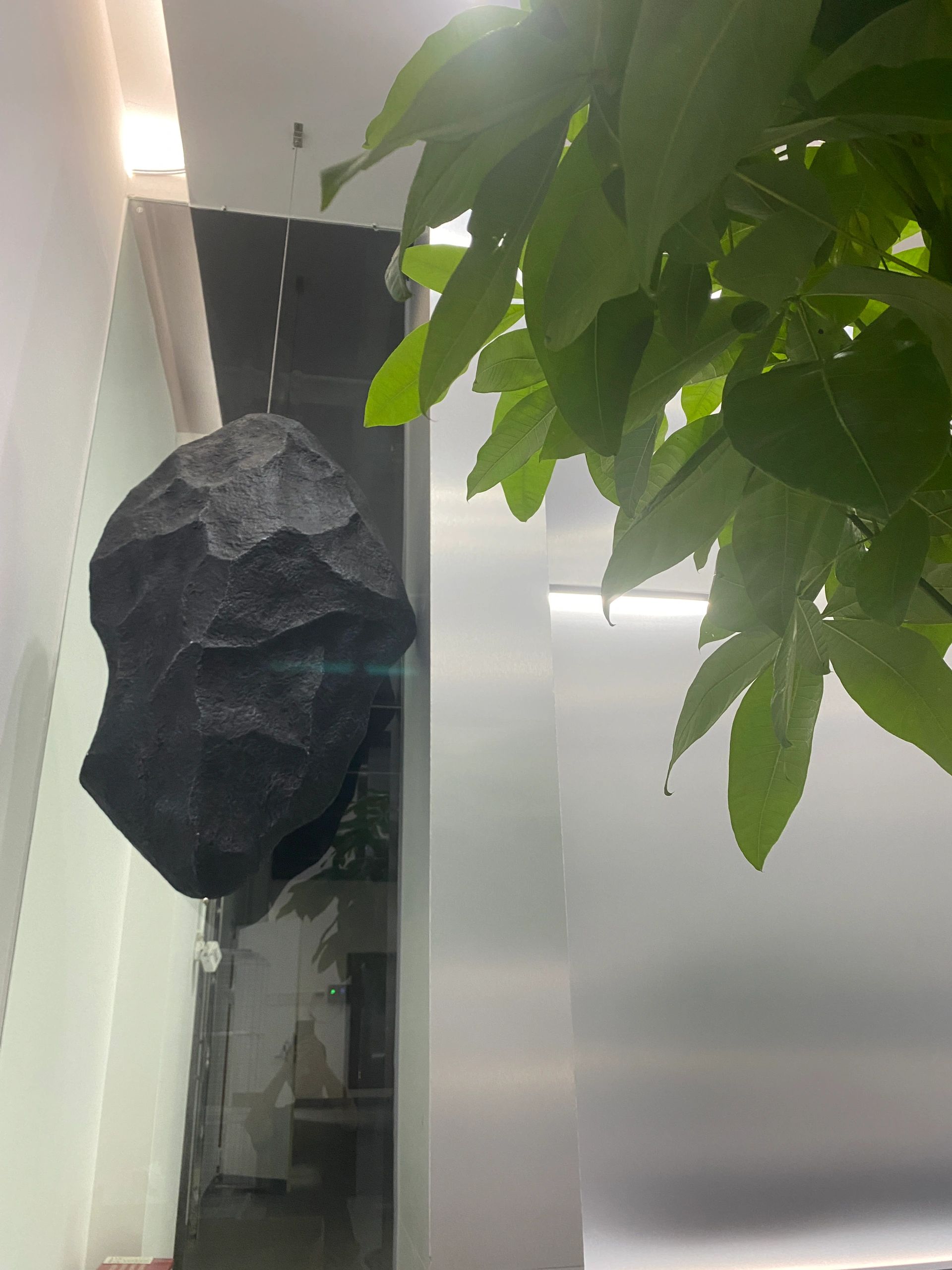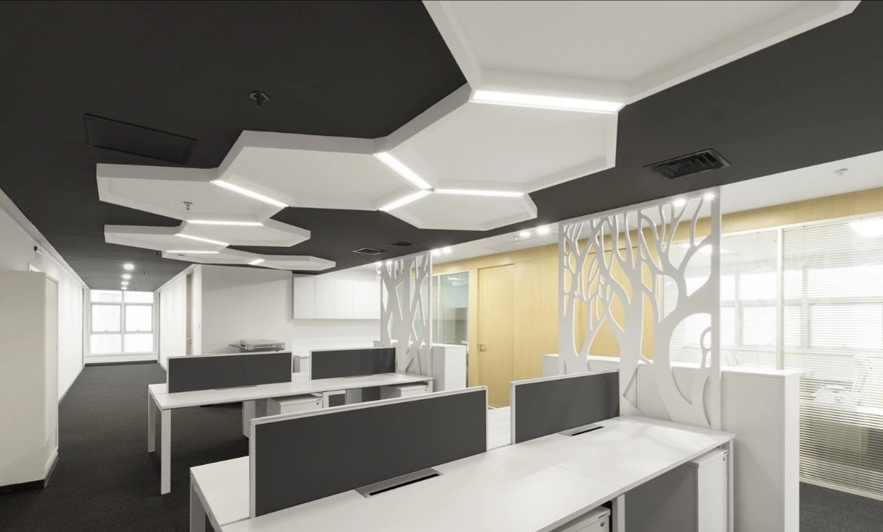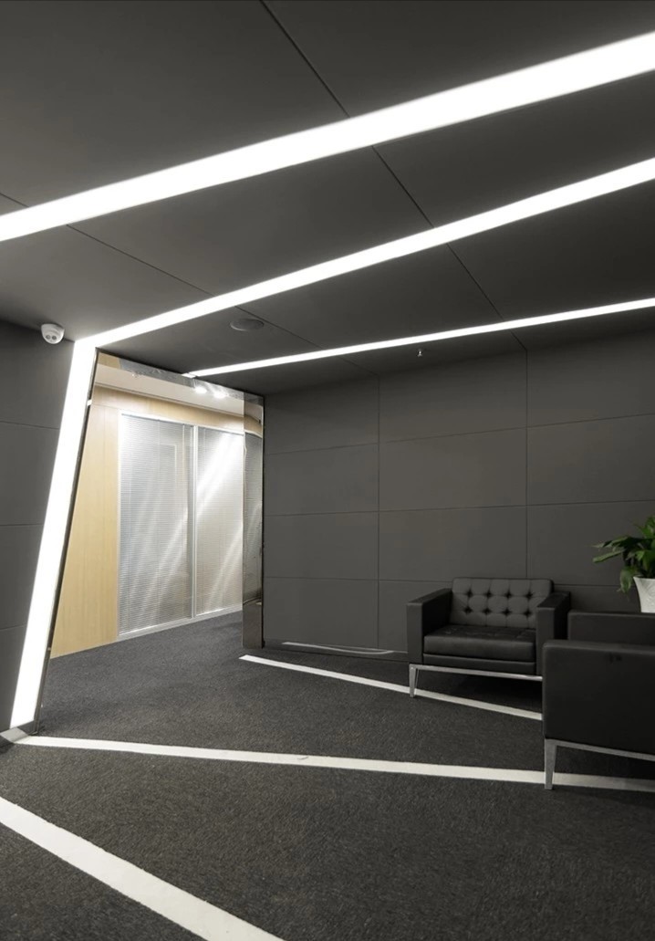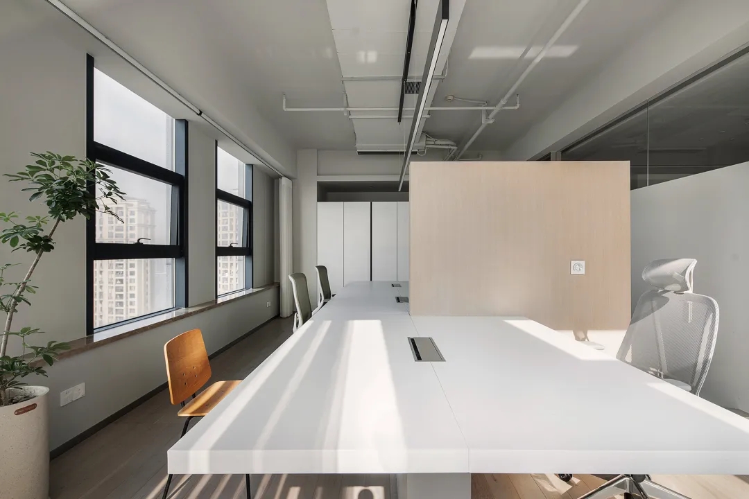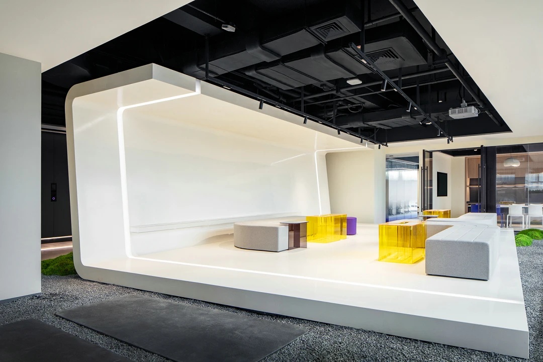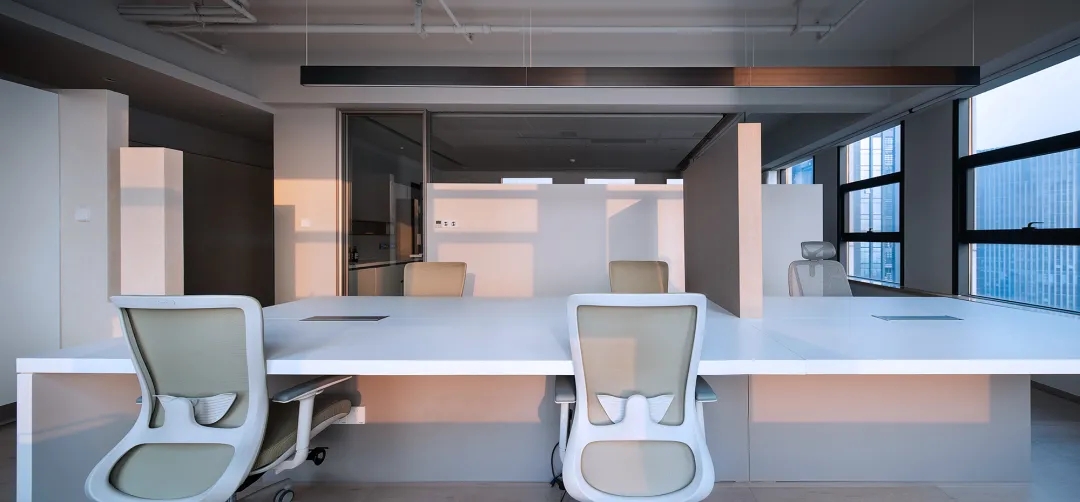 场地南侧两个办公室中间为一个开放式小型洽谈区。由于原始建筑结构的排布,其中一个结构柱暴露在这个开放空间中心的位置,影响了视觉美观,也影响了流线。我们由此联想到了一颗位于意大利南部Pollino国家公园里的一棵叫做Italus巨树。我们以此为切入点,利用这棵柱子创造一棵“大树”作为视觉终点。同时也是但丁神曲中亚当支树的演绎,意味着意大利机构在中国落地生根,茁壮成长。在设计过程中我们引入并结合了树的形态与含义,将柱体隐藏在树干中。顶部树枝则随着天花板向室内四周呈星状散开并持续延伸。树枝内侧装有隐藏灯带,在提供照明的同时起到美化的效果,为空间增加流动性。