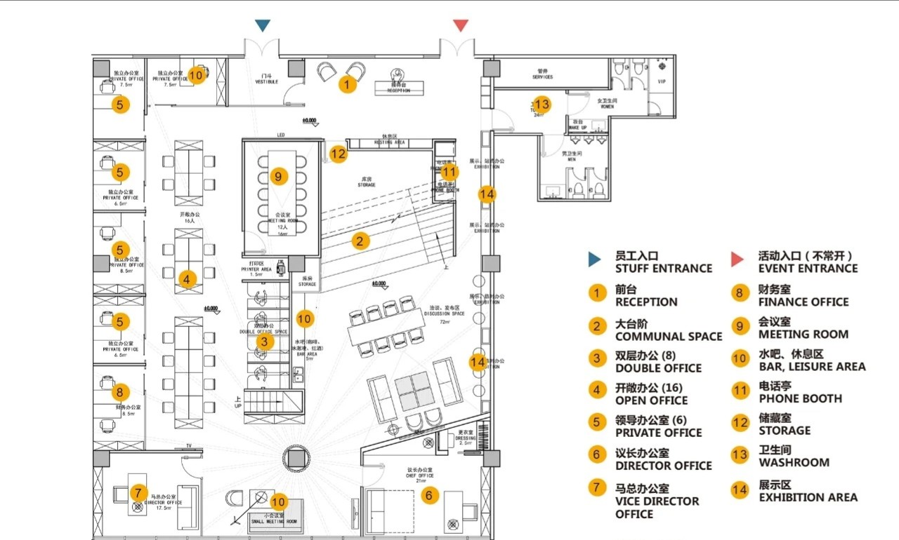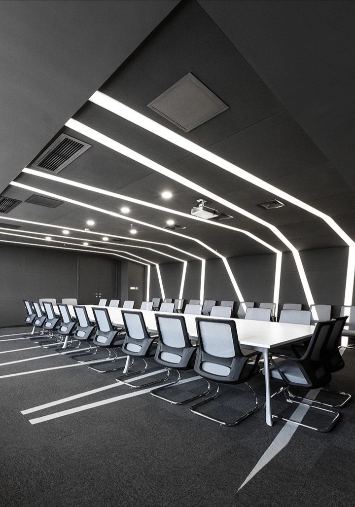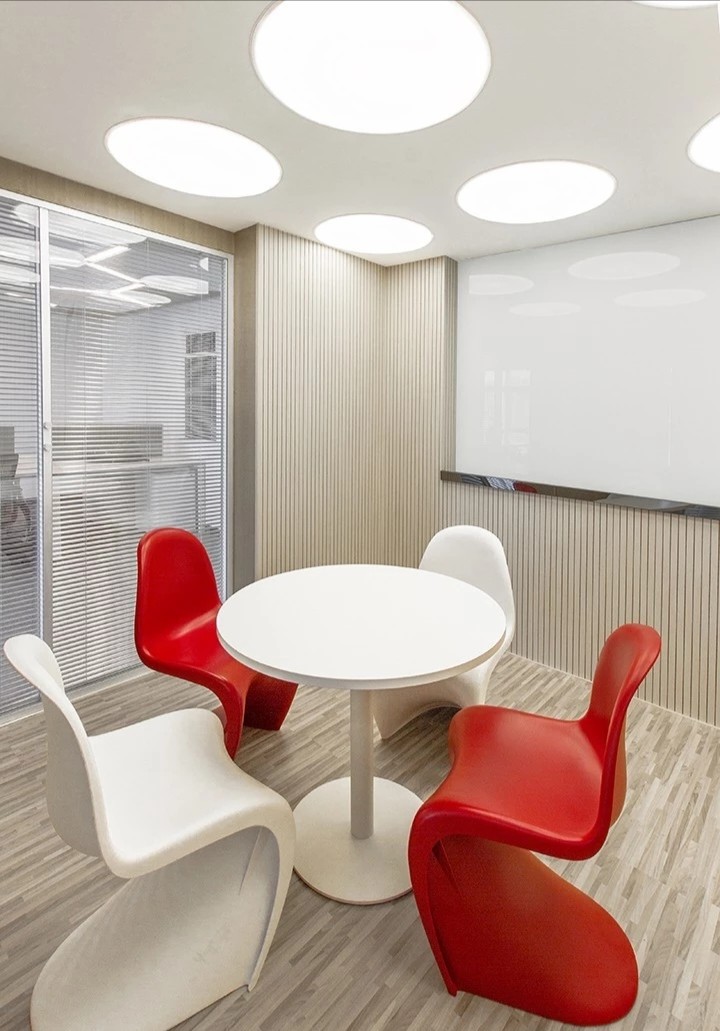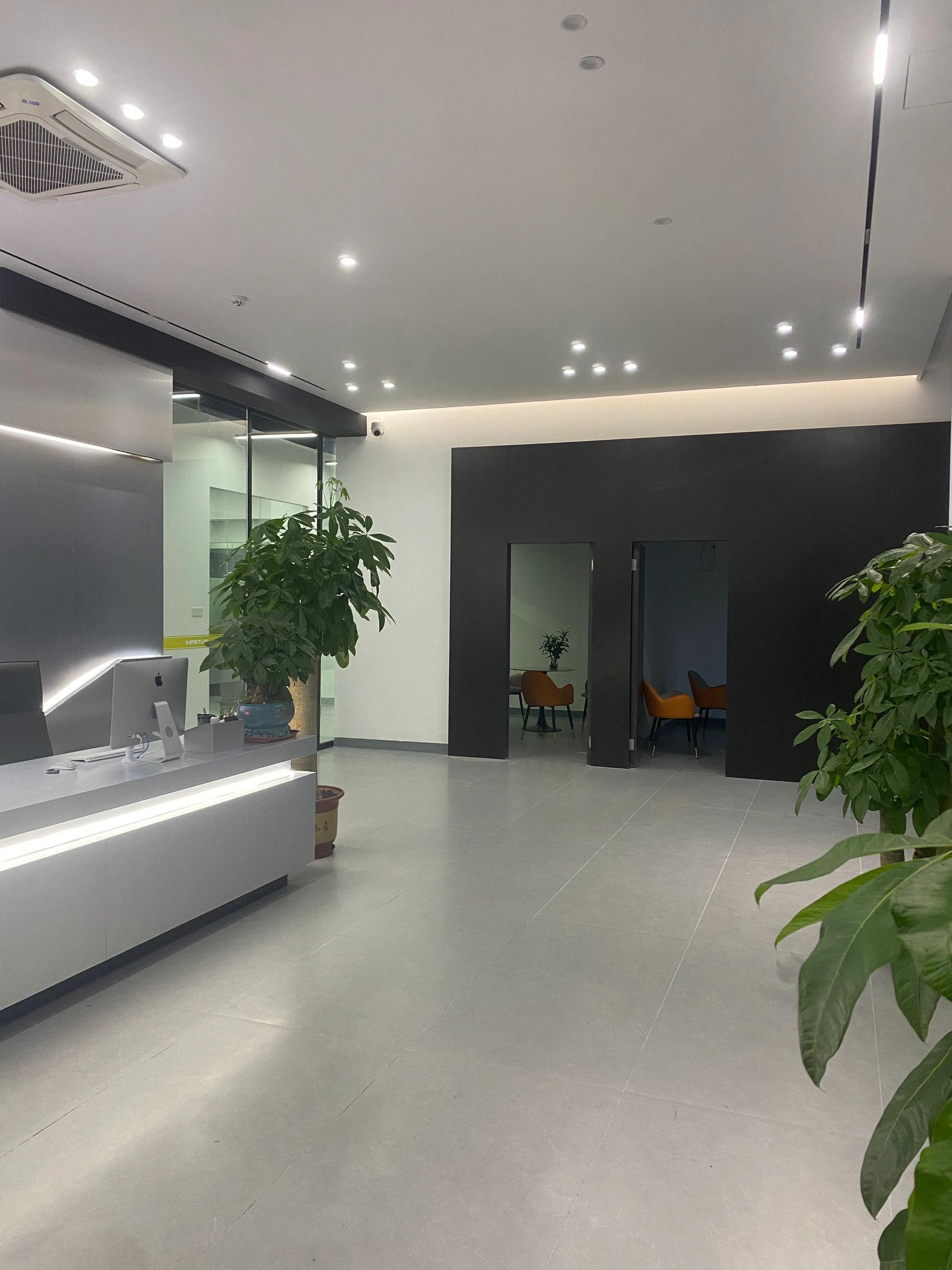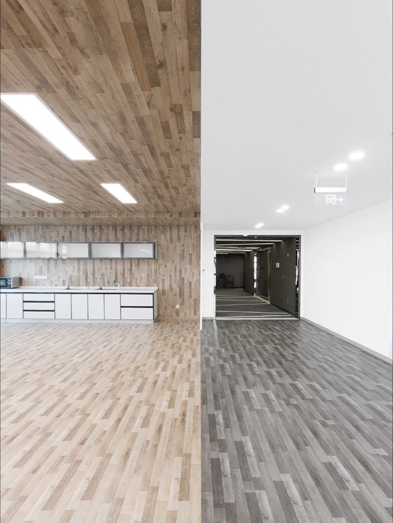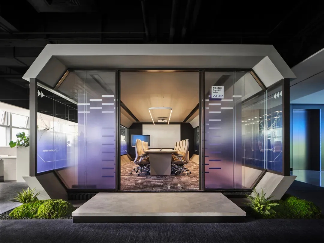 场地南侧两个办公室中间为一个开放式小型洽谈区。由于原始建筑结构的排布,其中一个结构柱暴露在这个开放空间中心的位置,影响了视觉美观,也影响了流线。我们由此联想到了一颗位于意大利南部Pollino国家公园里的一棵叫做Italus巨树。我们以此为切入点,利用这棵柱子创造一棵“大树”作为视觉终点。同时也是但丁神曲中亚当支树的演绎,意味着意大利机构在中国落地生根,茁壮成长。在设计过程中我们引入并结合了树的形态与含义,将柱体隐藏在树干中。顶部树枝则随着天花板向室内四周呈星状散开并持续延伸。树枝内侧装有隐藏灯带,在提供照明的同时起到美化的效果,为空间增加流动性。