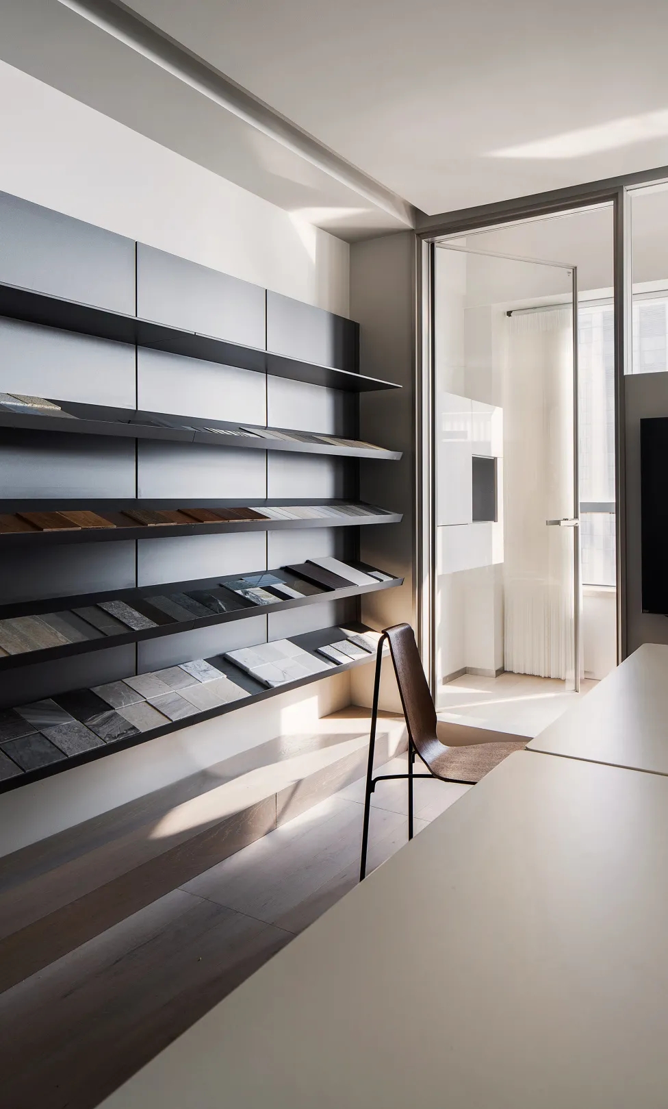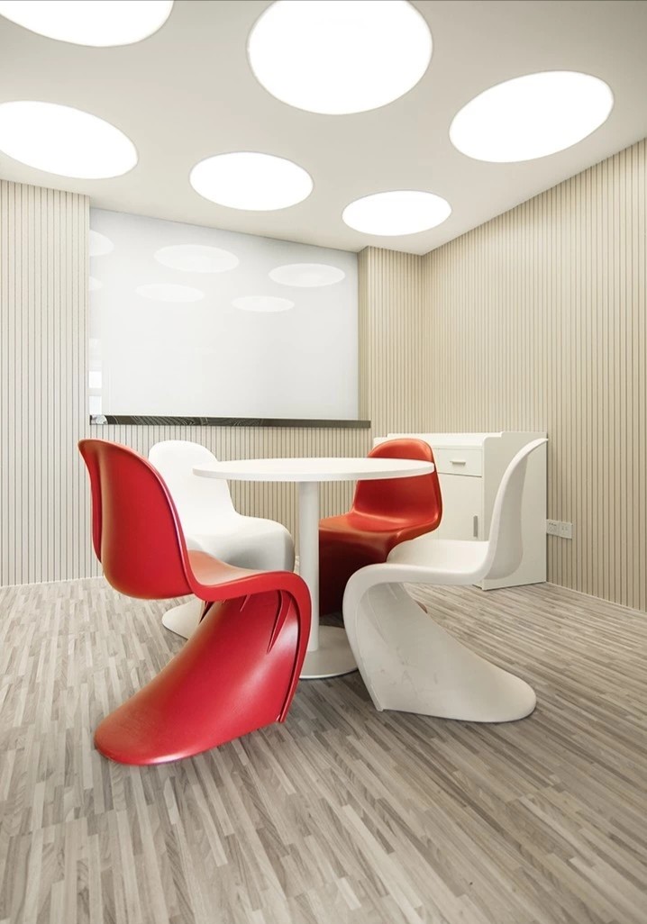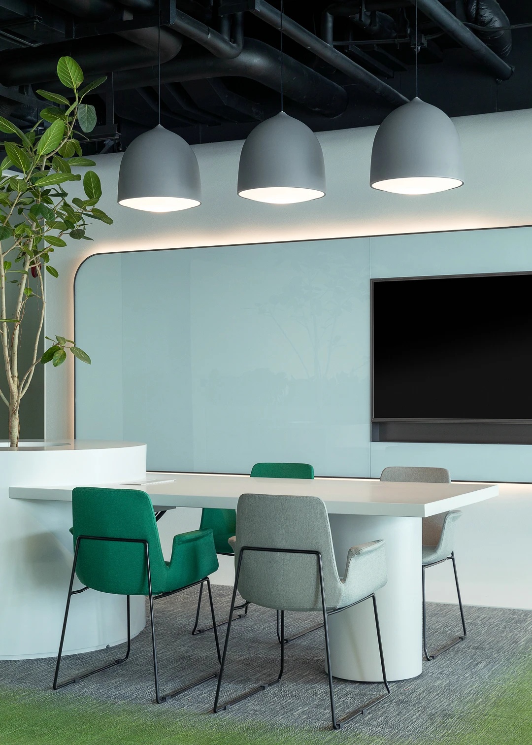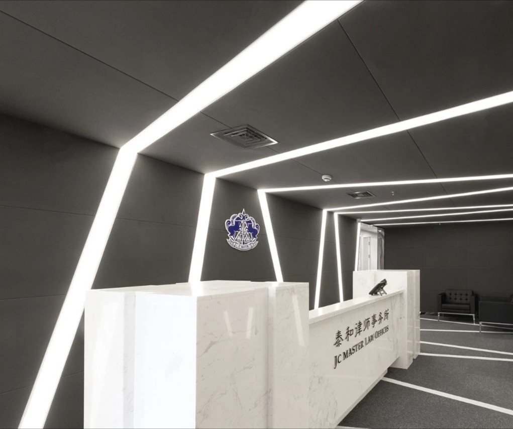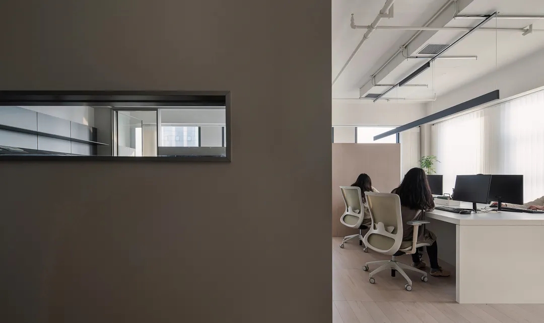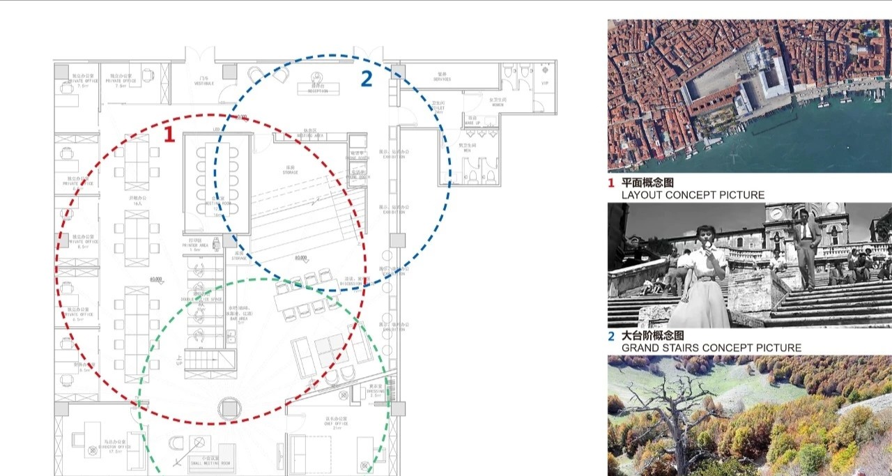 场地南侧两个办公室中间为一个开放式小型洽谈区。由于原始建筑结构的排布,其中一个结构柱暴露在这个开放空间中心的位置,影响了视觉美观,也影响了流线。我们由此联想到了一颗位于意大利南部Pollino国家公园里的一棵叫做Italus巨树。我们以此为切入点,利用这棵柱子创造一棵“大树”作为视觉终点。同时也是但丁神曲中亚当支树的演绎,意味着意大利机构在中国落地生根,茁壮成长。在设计过程中我们引入并结合了树的形态与含义,将柱体隐藏在树干中。顶部树枝则随着天花板向室内四周呈星状散开并持续延伸。树枝内侧装有隐藏灯带,在提供照明的同时起到美化的效果,为空间增加流动性。