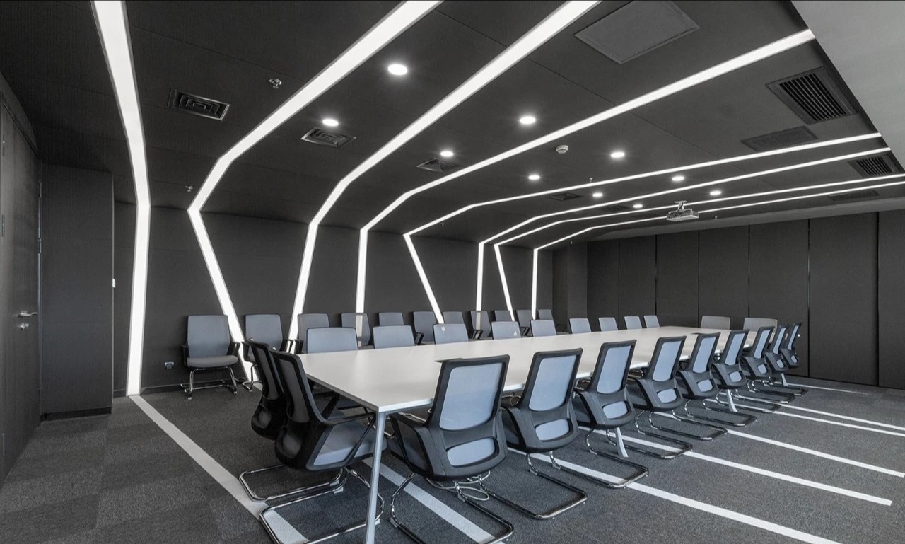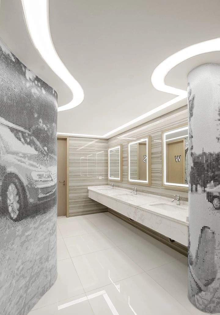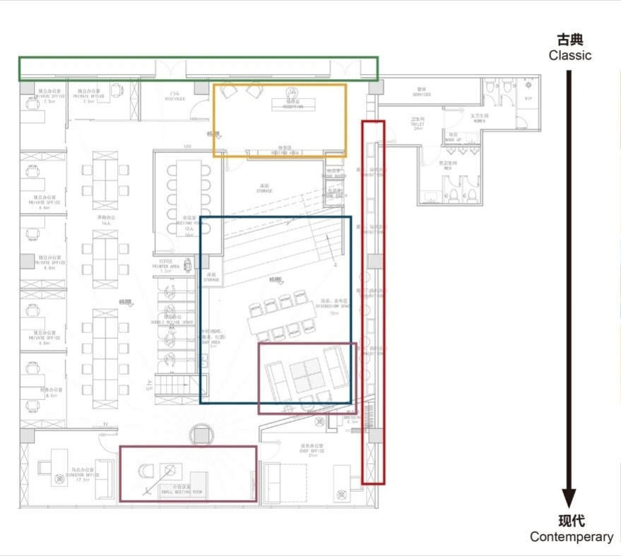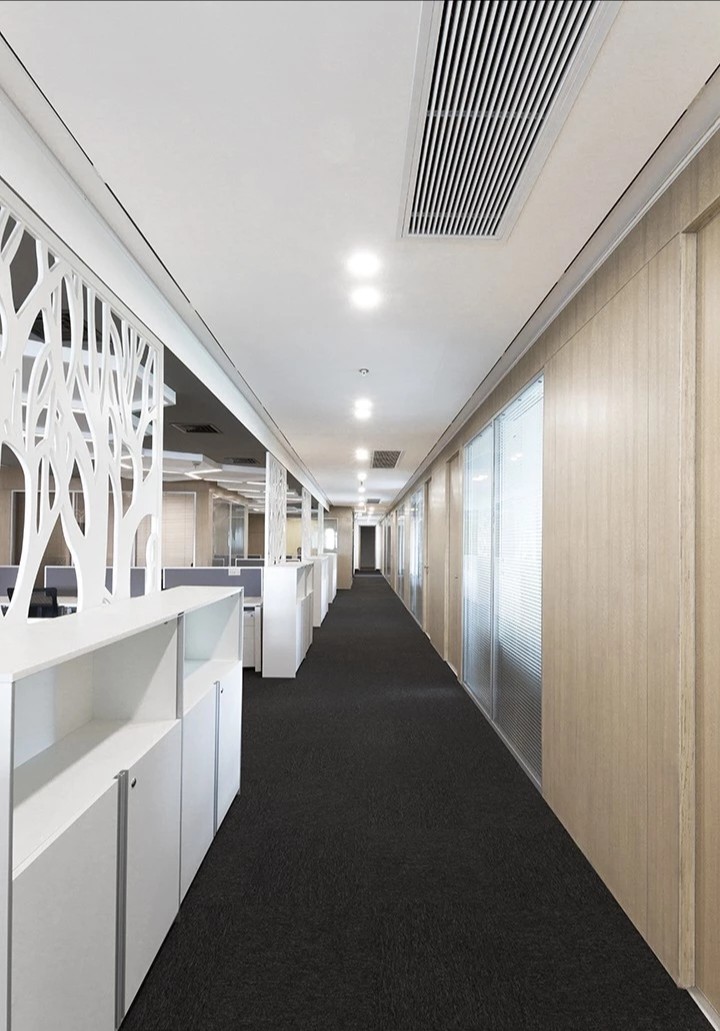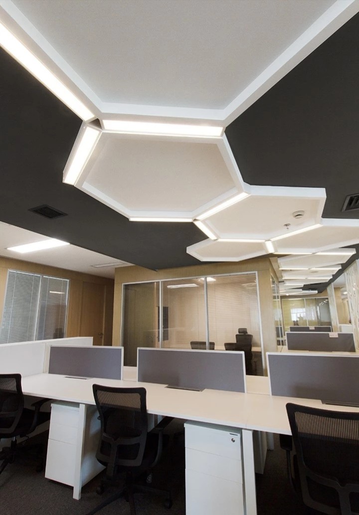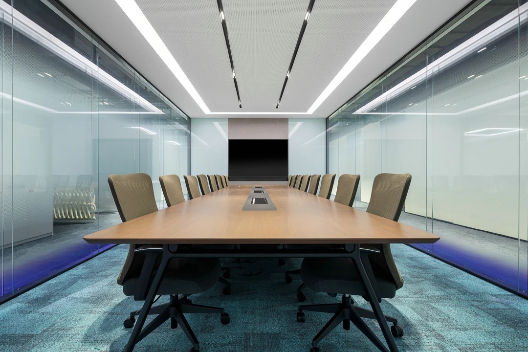 场地南侧两个办公室中间为一个开放式小型洽谈区。由于原始建筑结构的排布,其中一个结构柱暴露在这个开放空间中心的位置,影响了视觉美观,也影响了流线。我们由此联想到了一颗位于意大利南部Pollino国家公园里的一棵叫做Italus巨树。我们以此为切入点,利用这棵柱子创造一棵“大树”作为视觉终点。同时也是但丁神曲中亚当支树的演绎,意味着意大利机构在中国落地生根,茁壮成长。在设计过程中我们引入并结合了树的形态与含义,将柱体隐藏在树干中。顶部树枝则随着天花板向室内四周呈星状散开并持续延伸。树枝内侧装有隐藏灯带,在提供照明的同时起到美化的效果,为空间增加流动性。