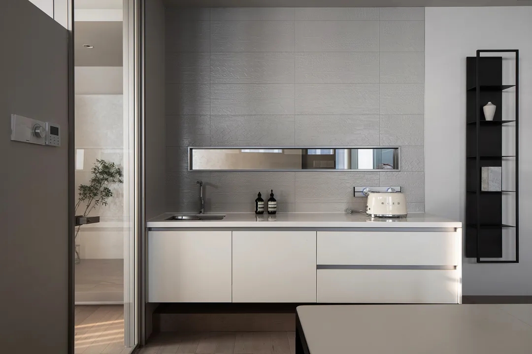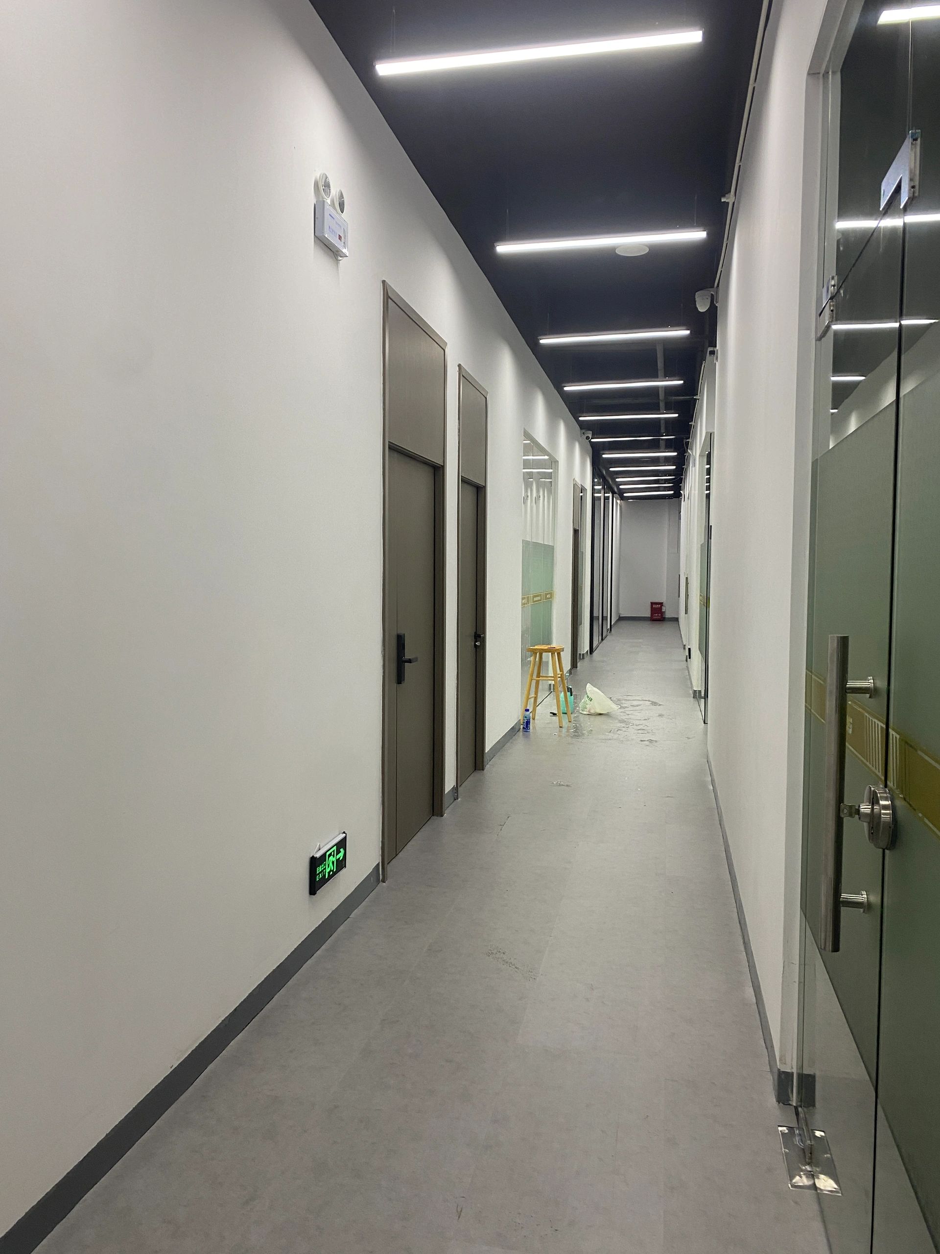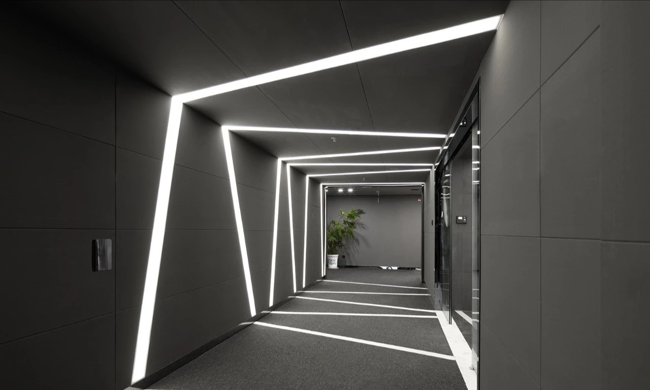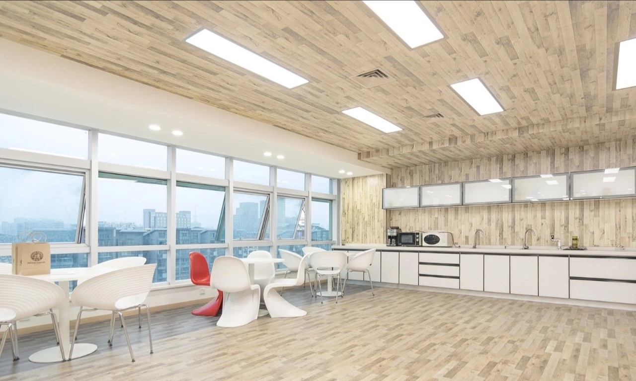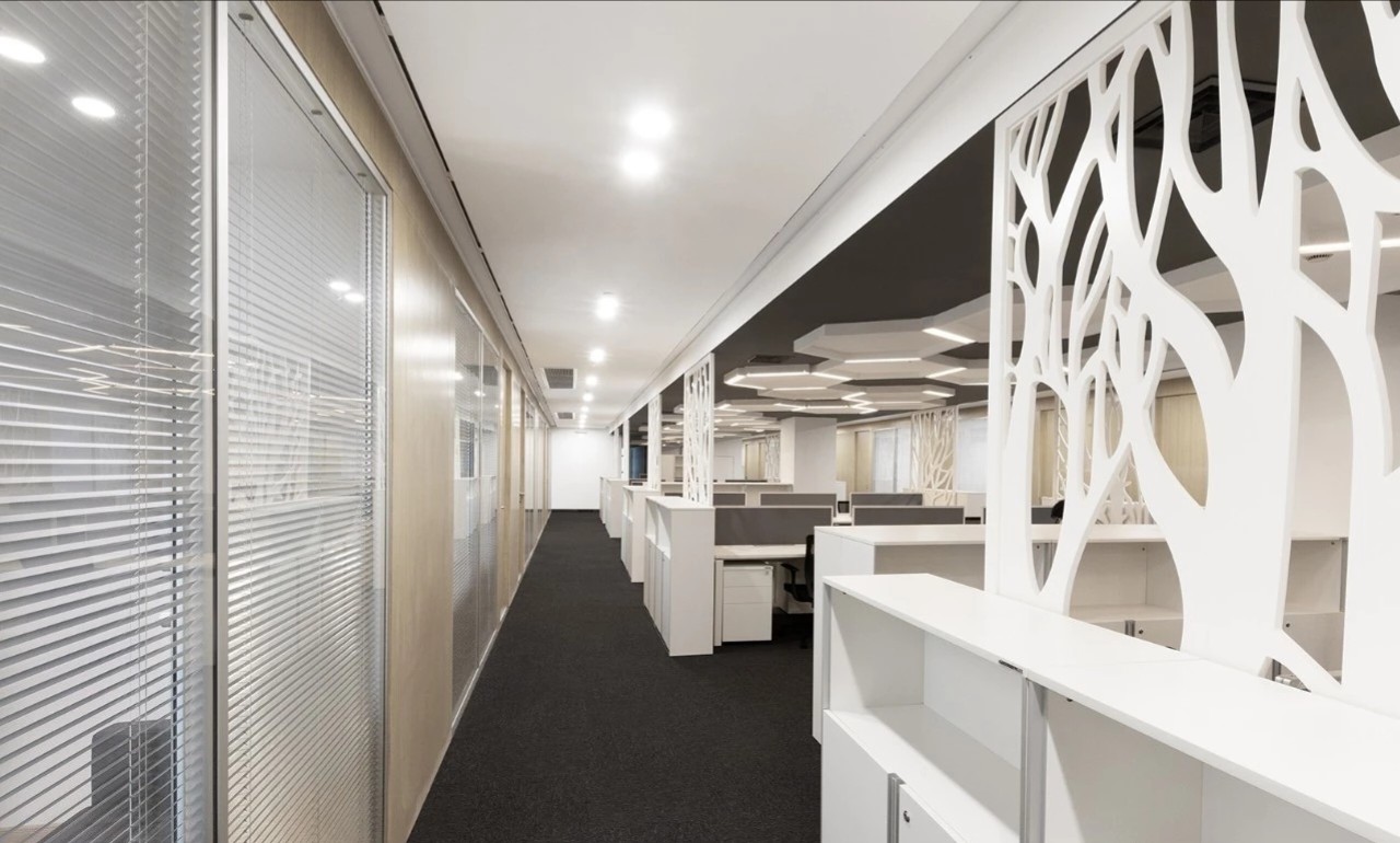 场地南侧两个办公室中间为一个开放式小型洽谈区。由于原始建筑结构的排布,其中一个结构柱暴露在这个开放空间中心的位置,影响了视觉美观,也影响了流线。我们由此联想到了一颗位于意大利南部Pollino国家公园里的一棵叫做Italus巨树。我们以此为切入点,利用这棵柱子创造一棵“大树”作为视觉终点。同时也是但丁神曲中亚当支树的演绎,意味着意大利机构在中国落地生根,茁壮成长。在设计过程中我们引入并结合了树的形态与含义,将柱体隐藏在树干中。顶部树枝则随着天花板向室内四周呈星状散开并持续延伸。树枝内侧装有隐藏灯带,在提供照明的同时起到美化的效果,为空间增加流动性。