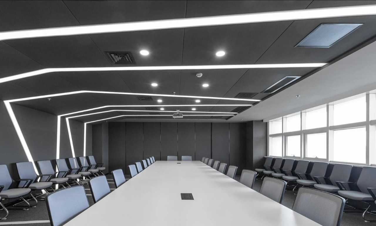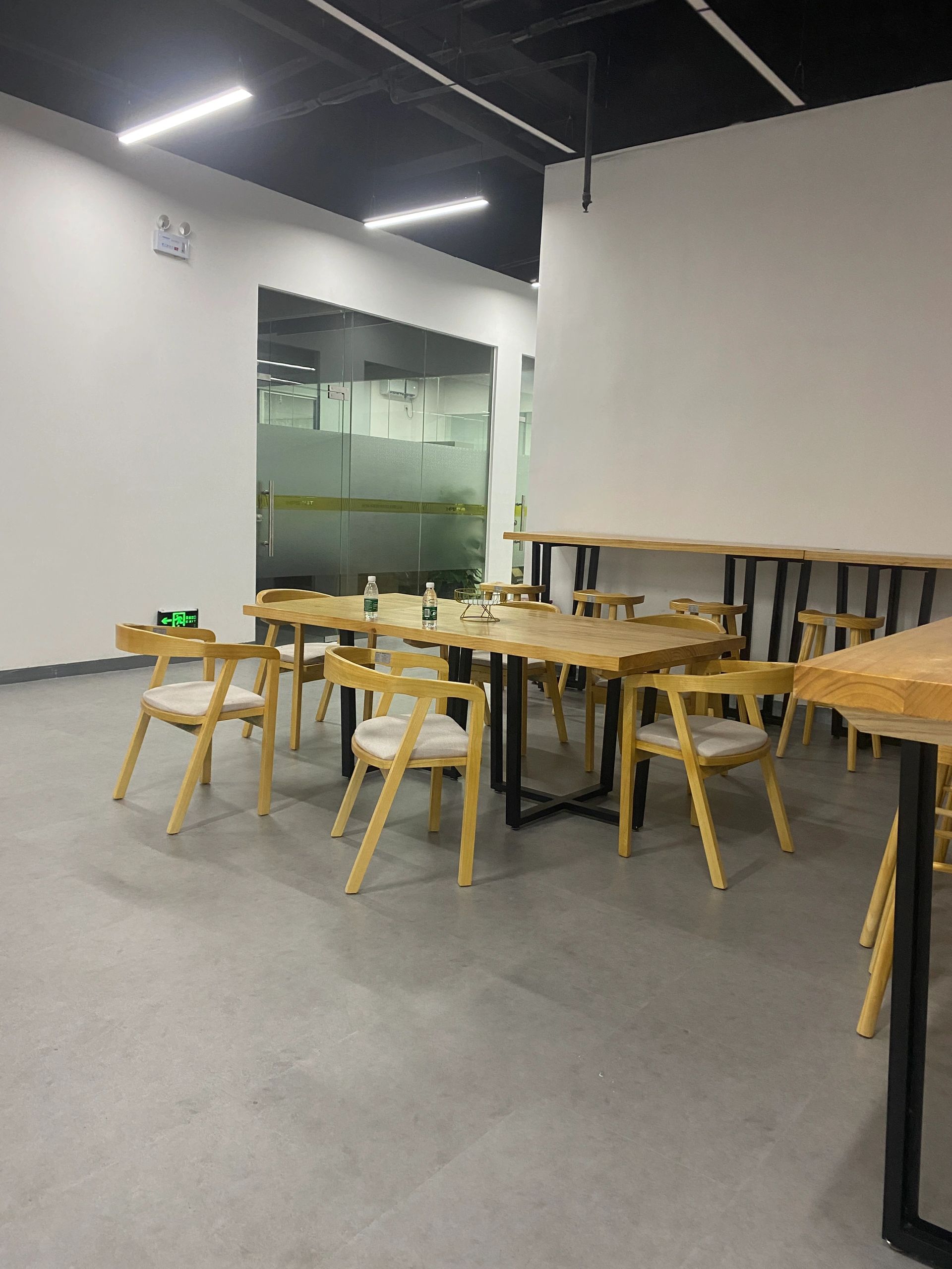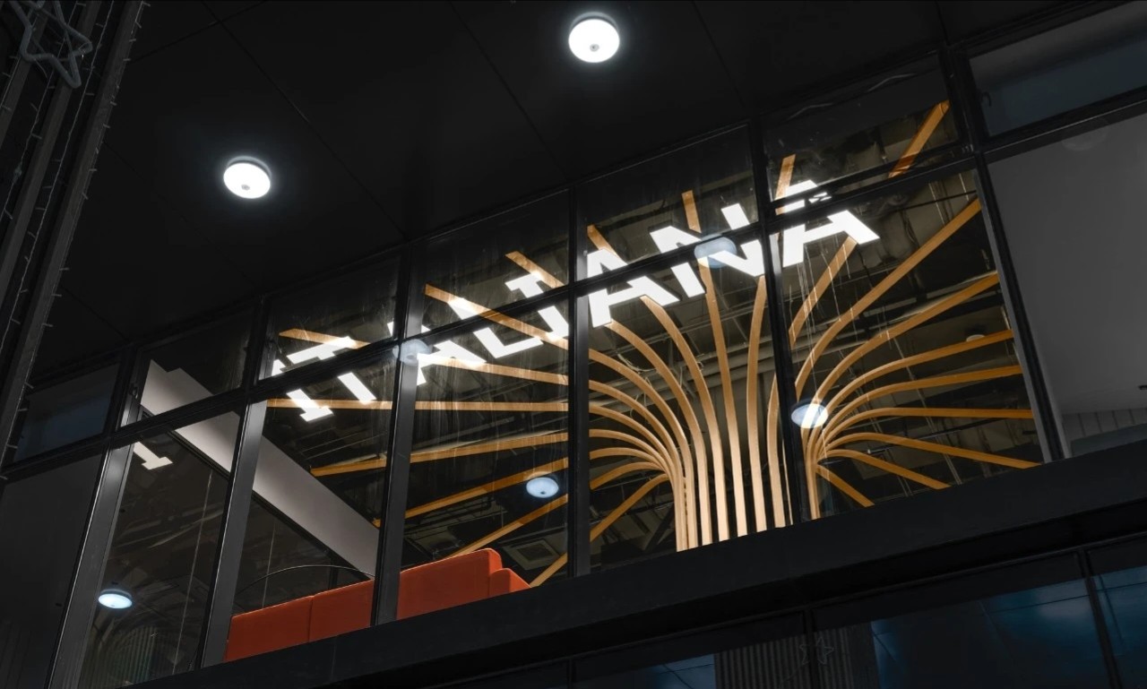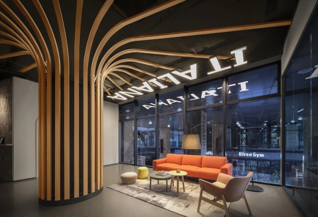 小洽谈区上方悬挂代表意大利对华友好协会的英文标识字母灯牌——“ITALIANA”。由于南侧玻璃幕墙面向园区的下沉庭院,从外部仰望正好可以看到此正向的标识。从室内看,灯牌的光映射在玻璃上,也可清晰地展示出标识。
