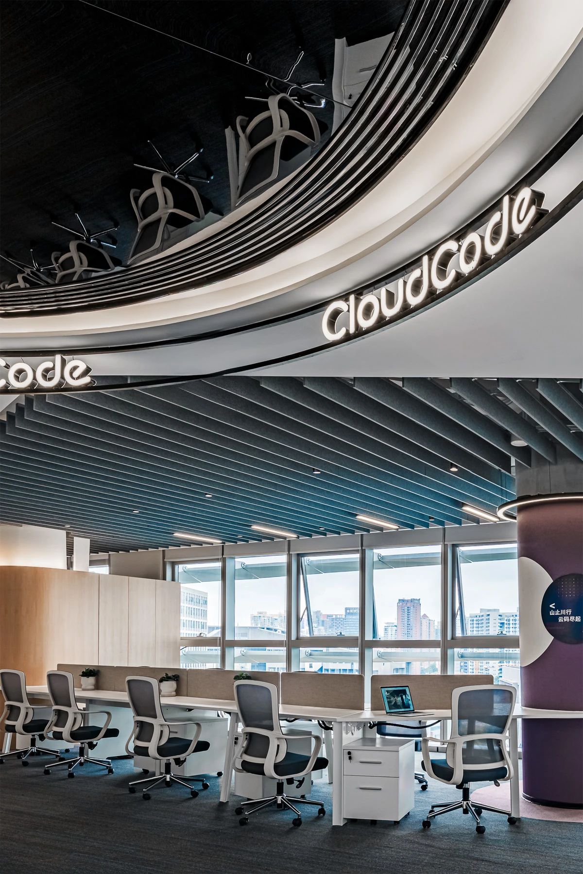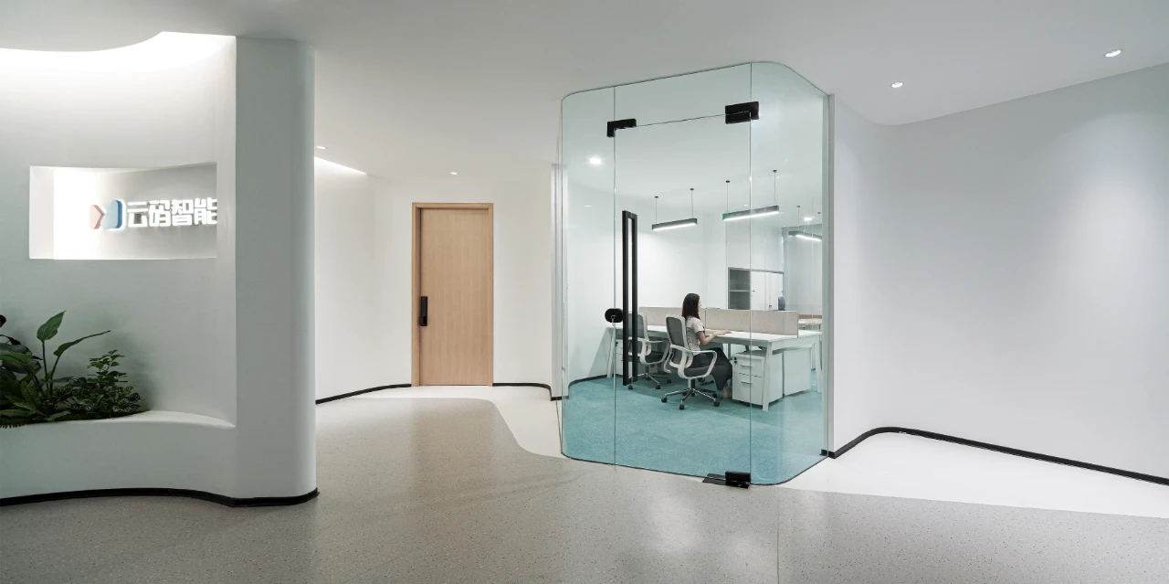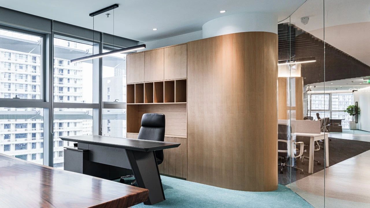 不规则异形吧台,与现有流线型几何空间相辅相成,采用玻璃砖作为与多功能区间的软性隔断,保障办公私密性的同时也实现了空间通透性。