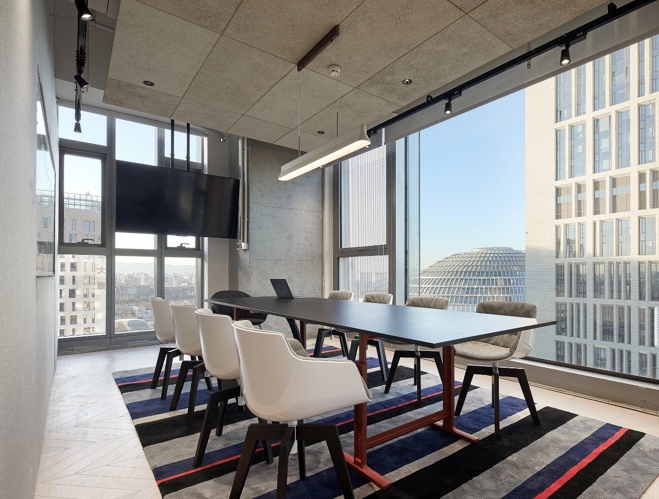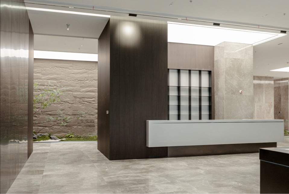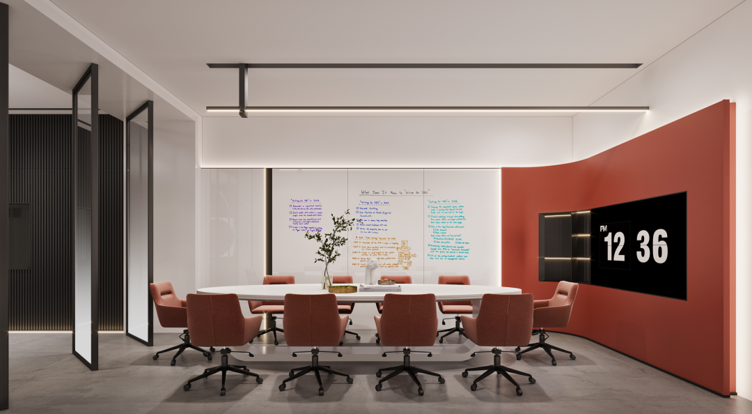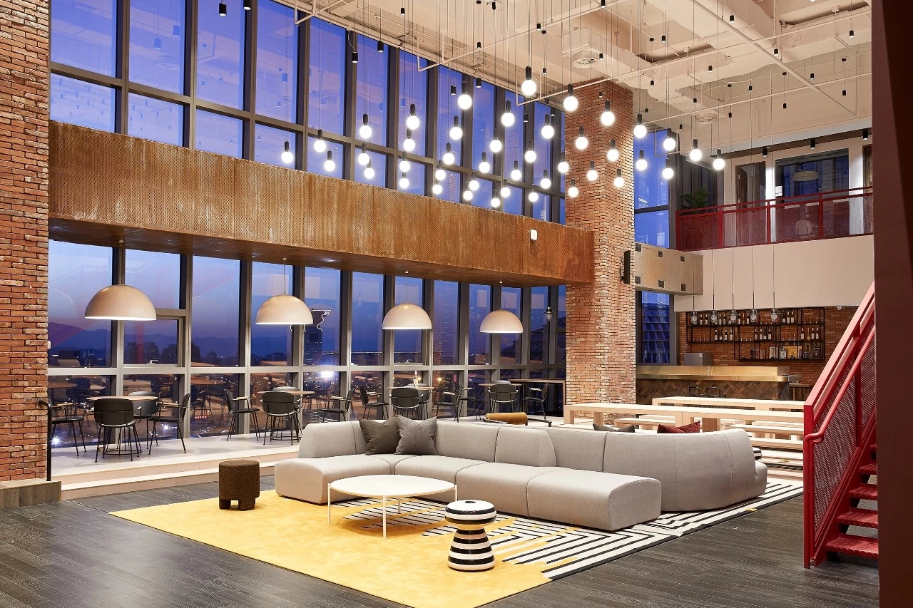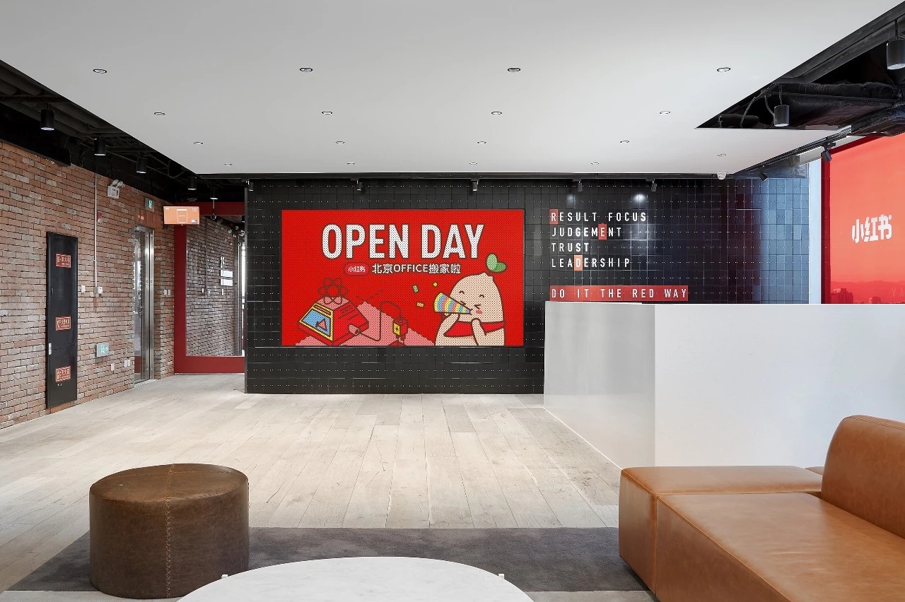 踏入北京小红书的办公室,前台区域正红色透明玻璃墙醒目且低调地将“小红书”镶嵌其中,维持了空间视觉的通透感,也暗示着小红书与外部世界的紧密连接。在前台采光极好的落地玻璃窗右侧,做锈铁板墙与对面整面无修饰的砖墙将工业风的元素很直接地呈现了出来,但与光泽温润的牛皮沙发和经典拼色的地毯,从质地上和谐地碰撞到色彩上恰到好处地融合,让工业风的演绎地并不显得粗犷,反而充满现代个性。更加有趣的是前台左侧的整面黑色有机玻璃墙,一半做为电子屏幕,可以随时为员工及到访客户播放公司相关影像;另一半做为企业文化墙,用来展示小红书独特的文化魅力及个性slogan,设计师巧妙地将展示形式设计为可以灵活移动的字母贴,恰好吻合了现代互联网公司与时俱进的快节奏和富含创意的企业理念。