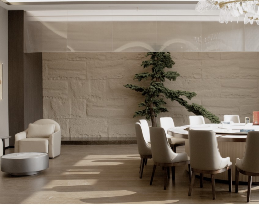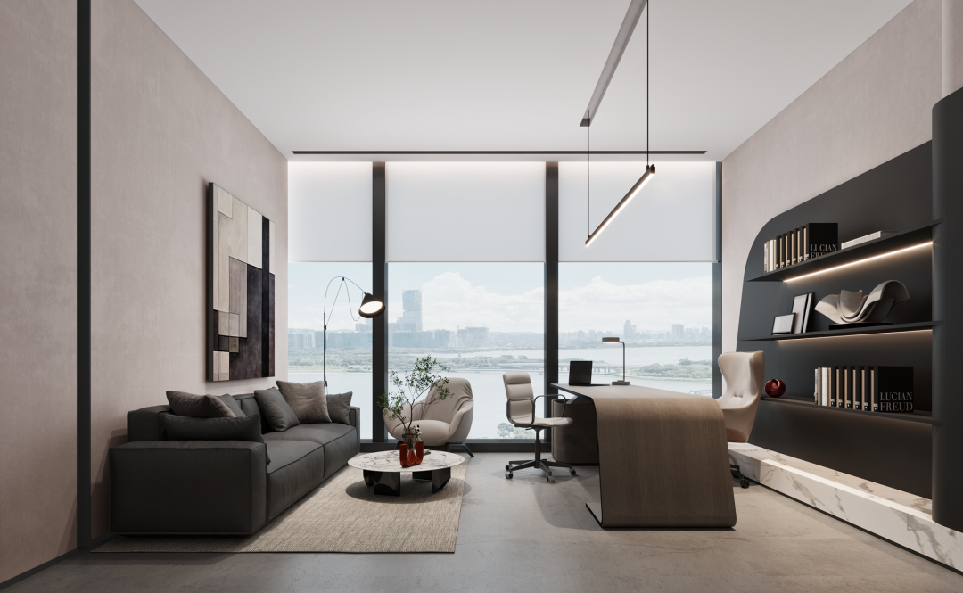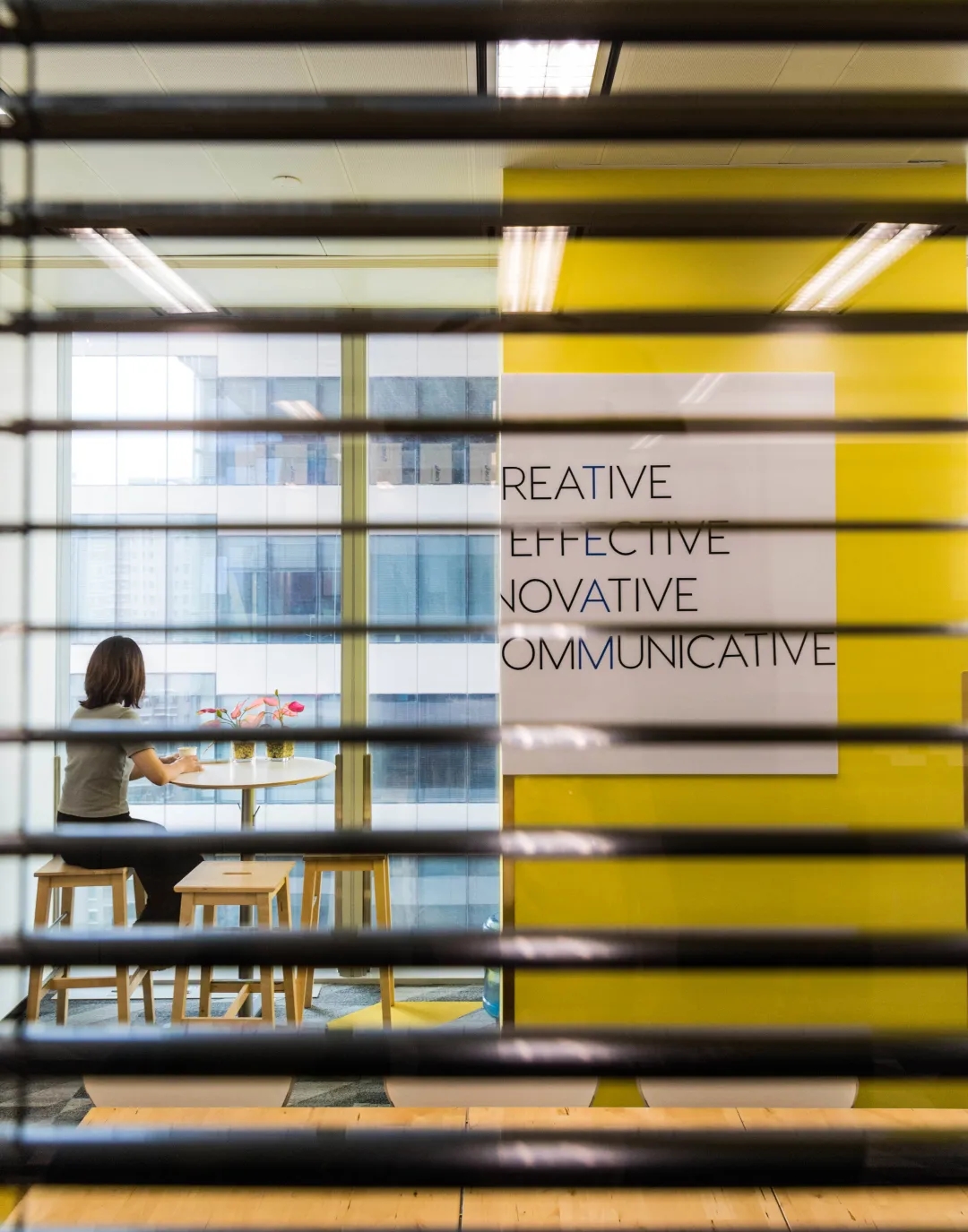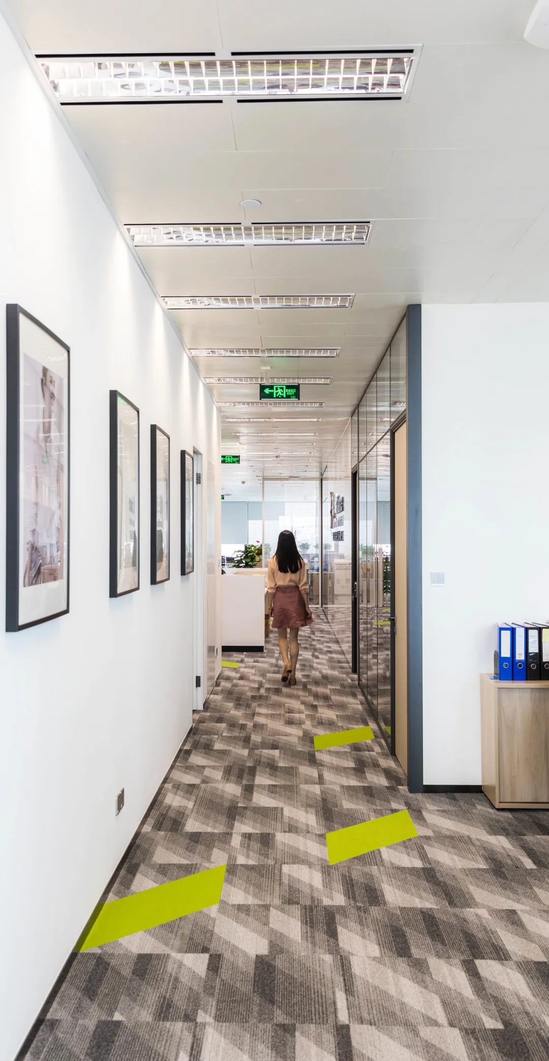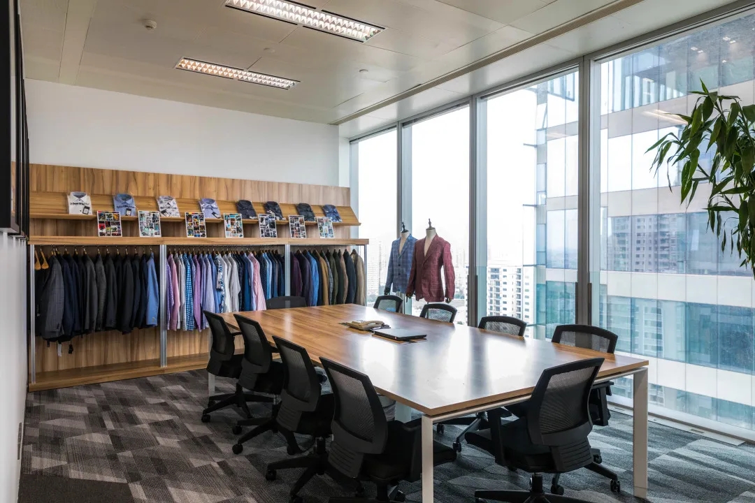 踏入北京小红书的办公室,前台区域正红色透明玻璃墙醒目且低调地将“小红书”镶嵌其中,维持了空间视觉的通透感,也暗示着小红书与外部世界的紧密连接。在前台采光极好的落地玻璃窗右侧,做锈铁板墙与对面整面无修饰的砖墙将工业风的元素很直接地呈现了出来,但与光泽温润的牛皮沙发和经典拼色的地毯,从质地上和谐地碰撞到色彩上恰到好处地融合,让工业风的演绎地并不显得粗犷,反而充满现代个性。更加有趣的是前台左侧的整面黑色有机玻璃墙,一半做为电子屏幕,可以随时为员工及到访客户播放公司相关影像;另一半做为企业文化墙,用来展示小红书独特的文化魅力及个性slogan,设计师巧妙地将展示形式设计为可以灵活移动的字母贴,恰好吻合了现代互联网公司与时俱进的快节奏和富含创意的企业理念。
