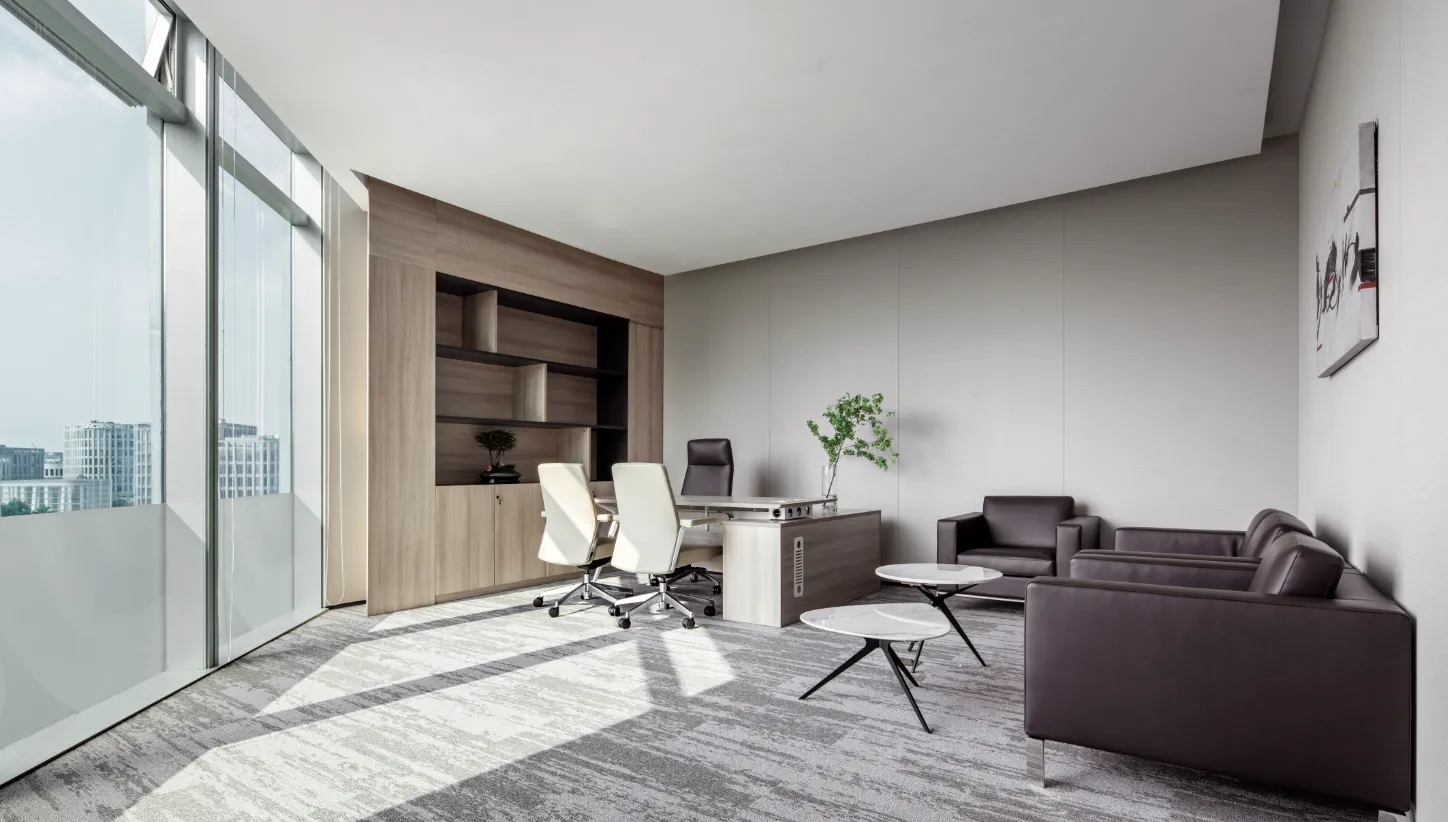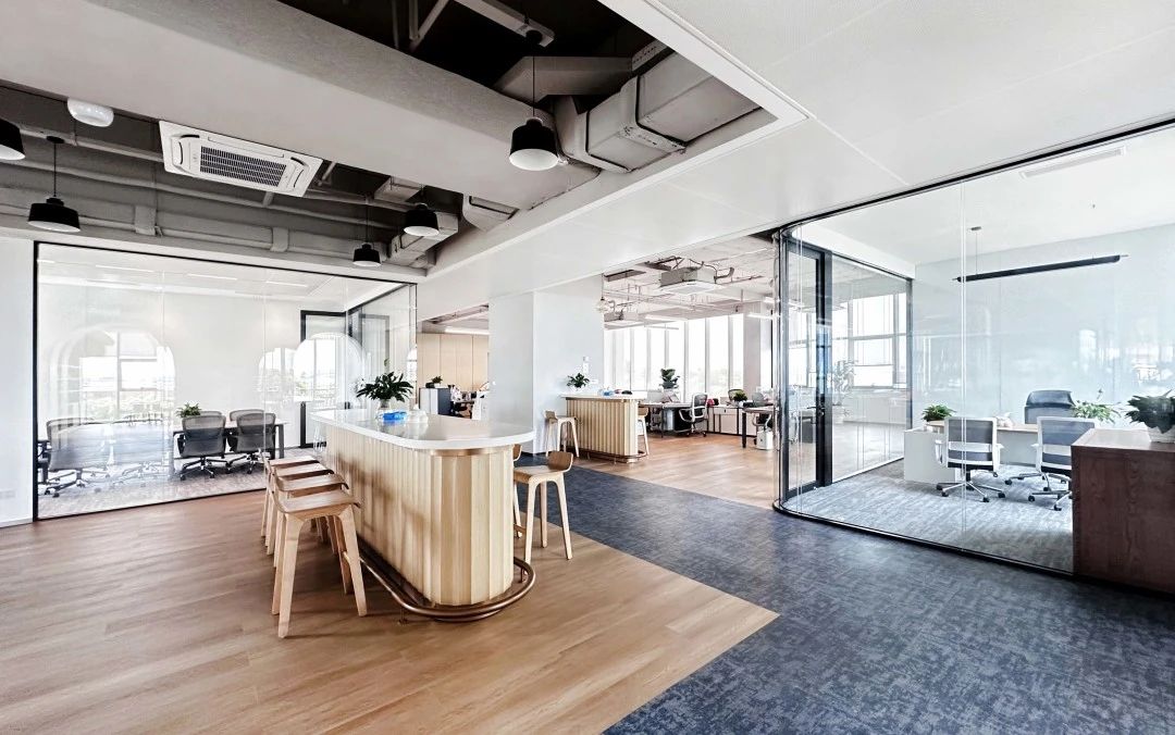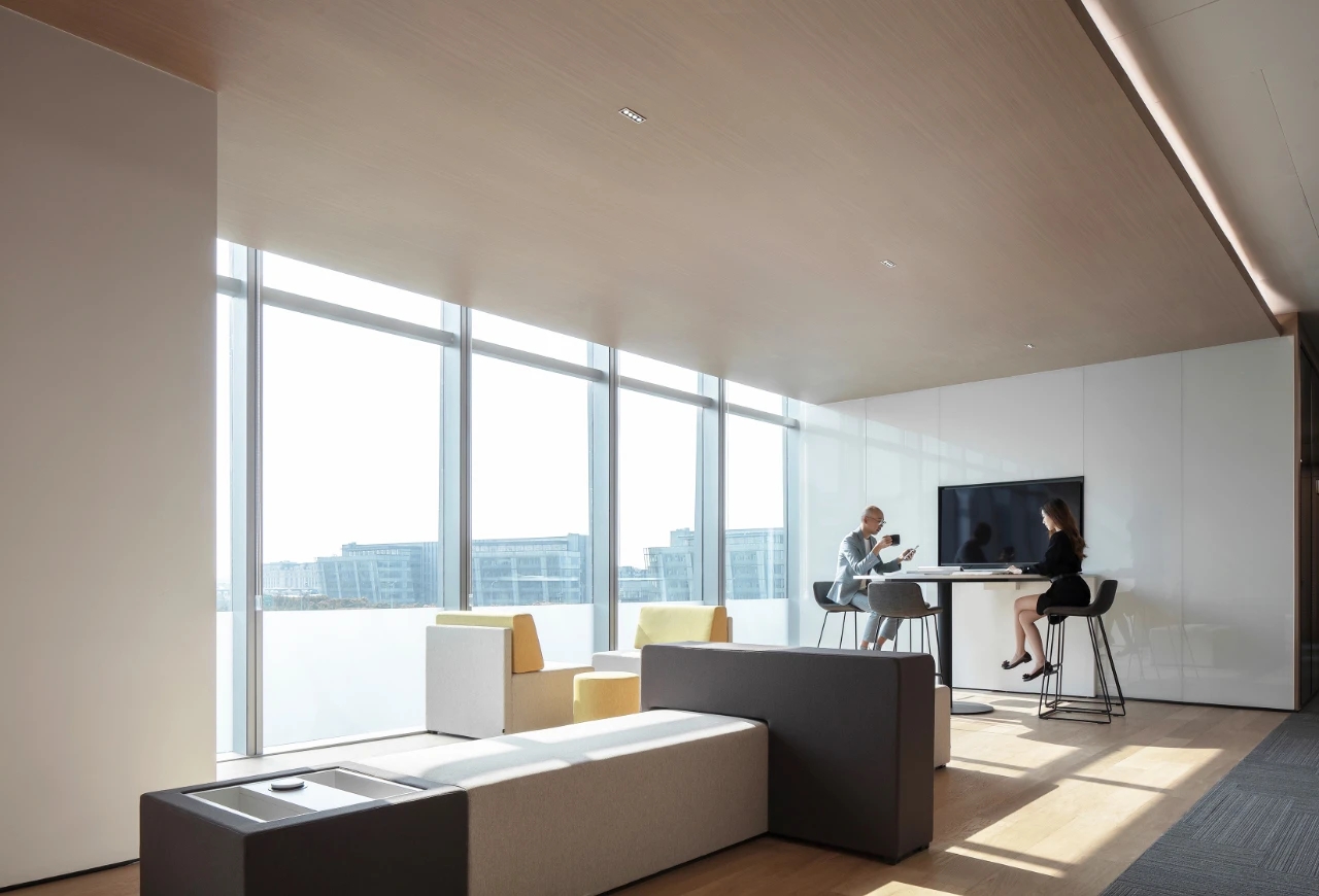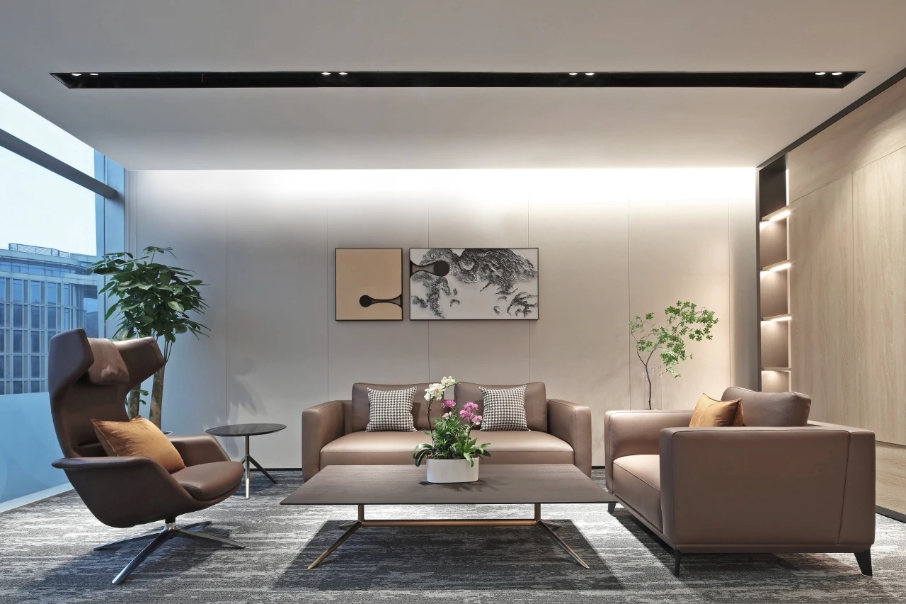 高层办公室采用简约现代的开间布局,宽敞开阔的待客区与工作区域层次分明,既是办公空间亦可承载社交空间属性。