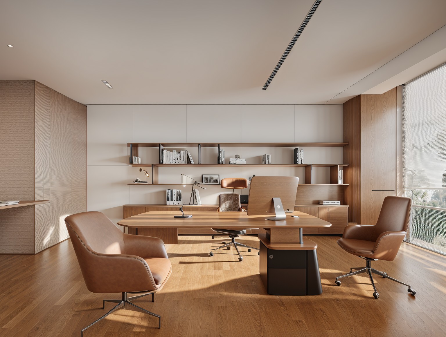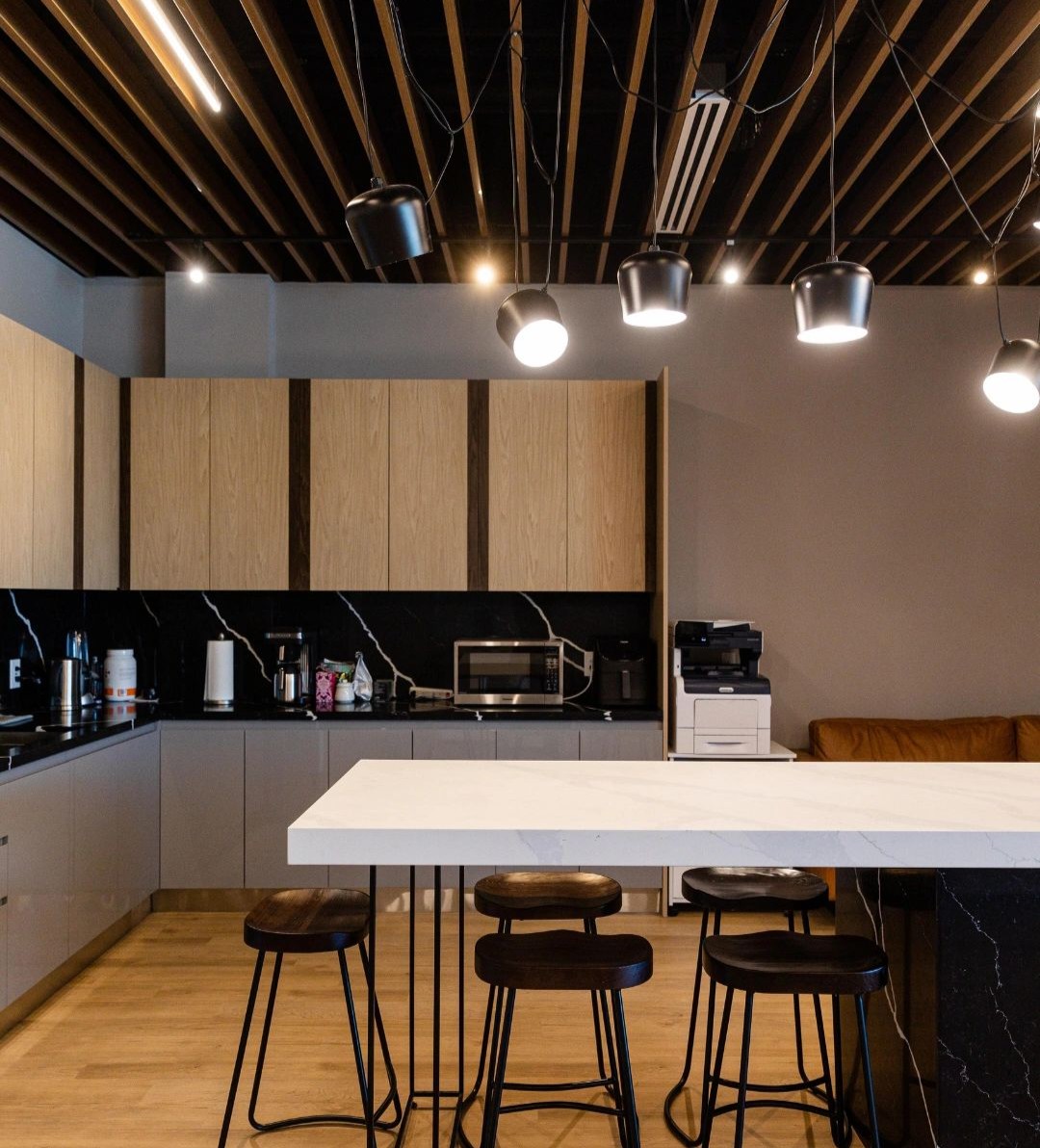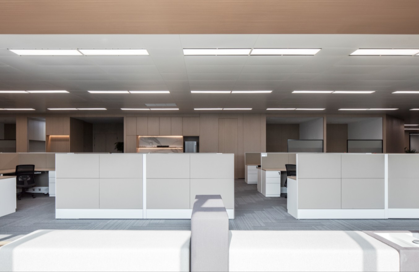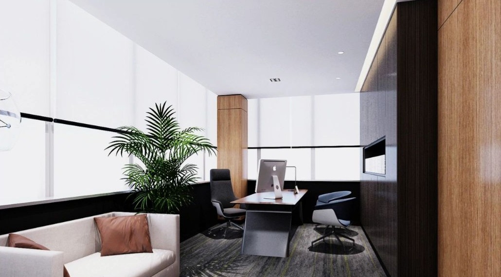高层办公室采用简约现代的开间布局,宽敞开阔的待客区与工作区域层次分明,既是办公空间亦可承载社交空间属性。
