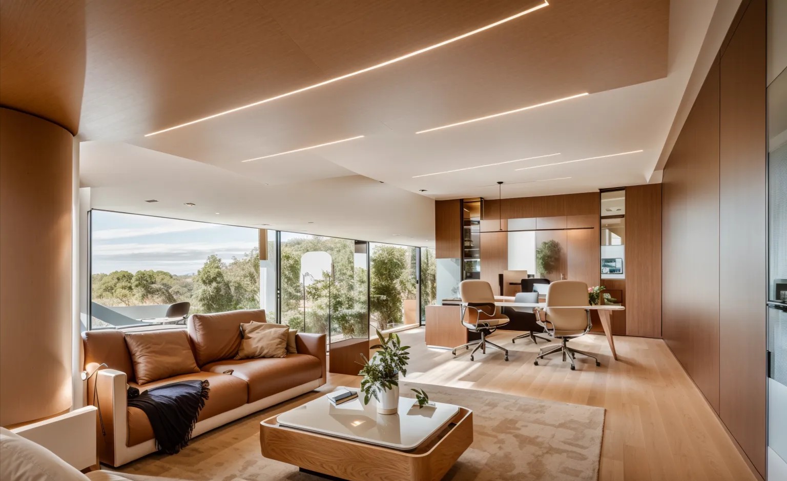 玻璃幕墙使光线与空气饱满通畅,再结合温润的木色与简洁轻快的设计色彩,使空间与自然的相连之际带来无边的宁静与质感,在光的配合下,显得更加安静舒适,进而营造出了一个灵活、功能、可持续性的工作空间。如果说色彩是人为的造作,那么光的出现则点亮了整个空间。