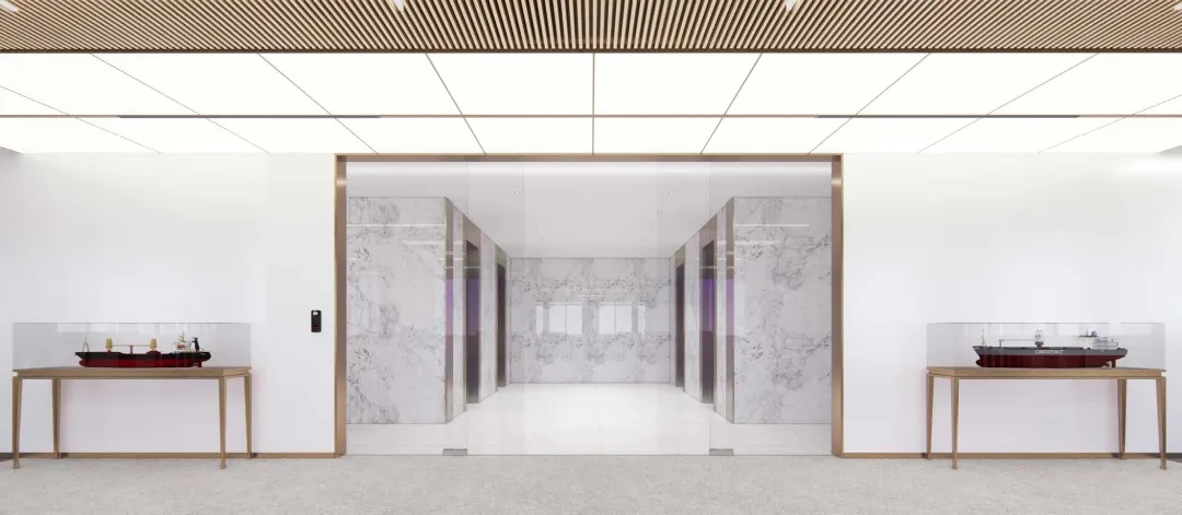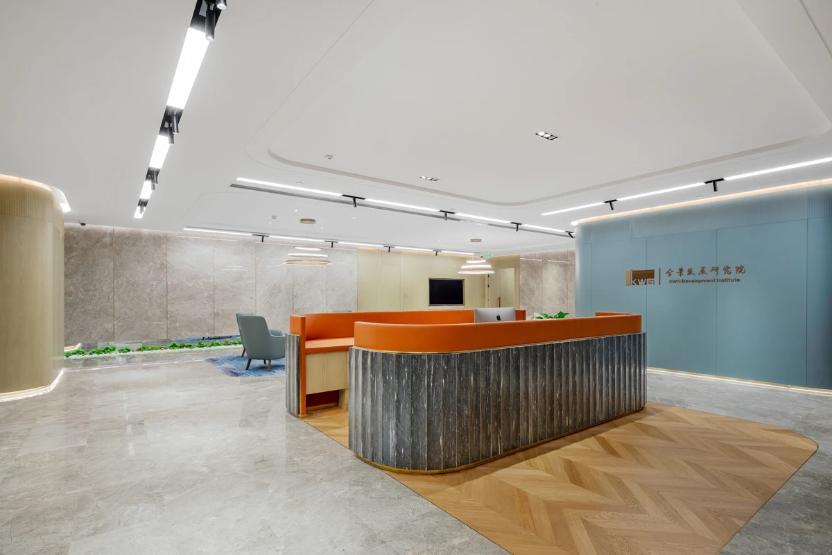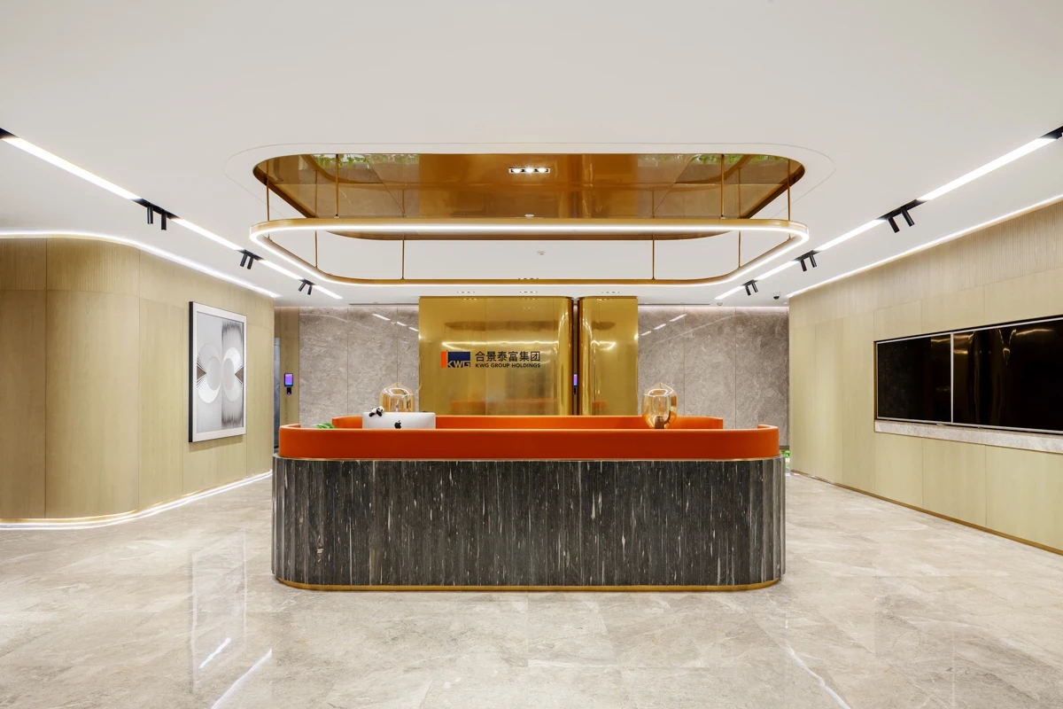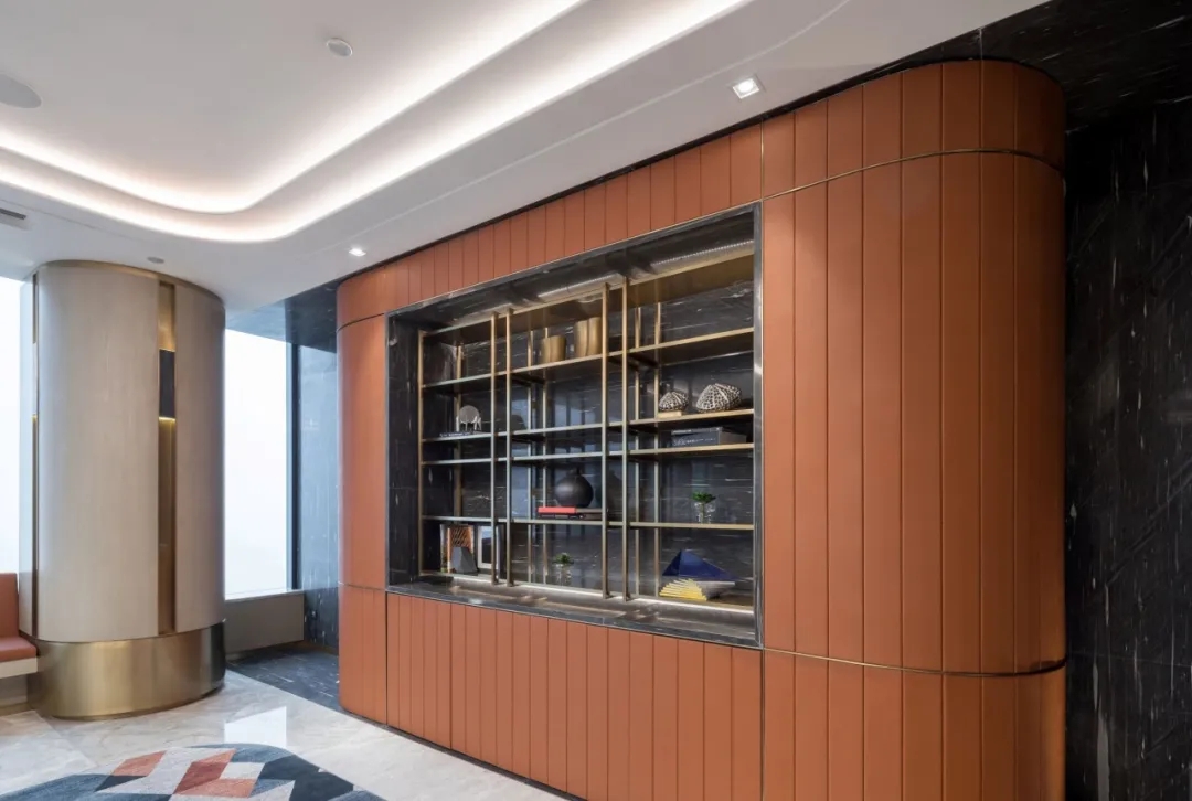 在接待区,选用的是石材加地毯地面,在施工过程中由于考虑到传统回填层重量较大,楼板无法承受该部分重量,项目部采用新工艺在架空地板基层上直接铺贴石材,既保证了面层效果,又解决了装饰层自重问题,方便了地面桥架布设,同时也为后期二次改造提供了便利。黄铜色不锈钢、爱马仕橙皮革、蒂芙尼绿木饰面、檀香飞雪深色石材的运用为整个接待区烘托出精致、热情的感觉。