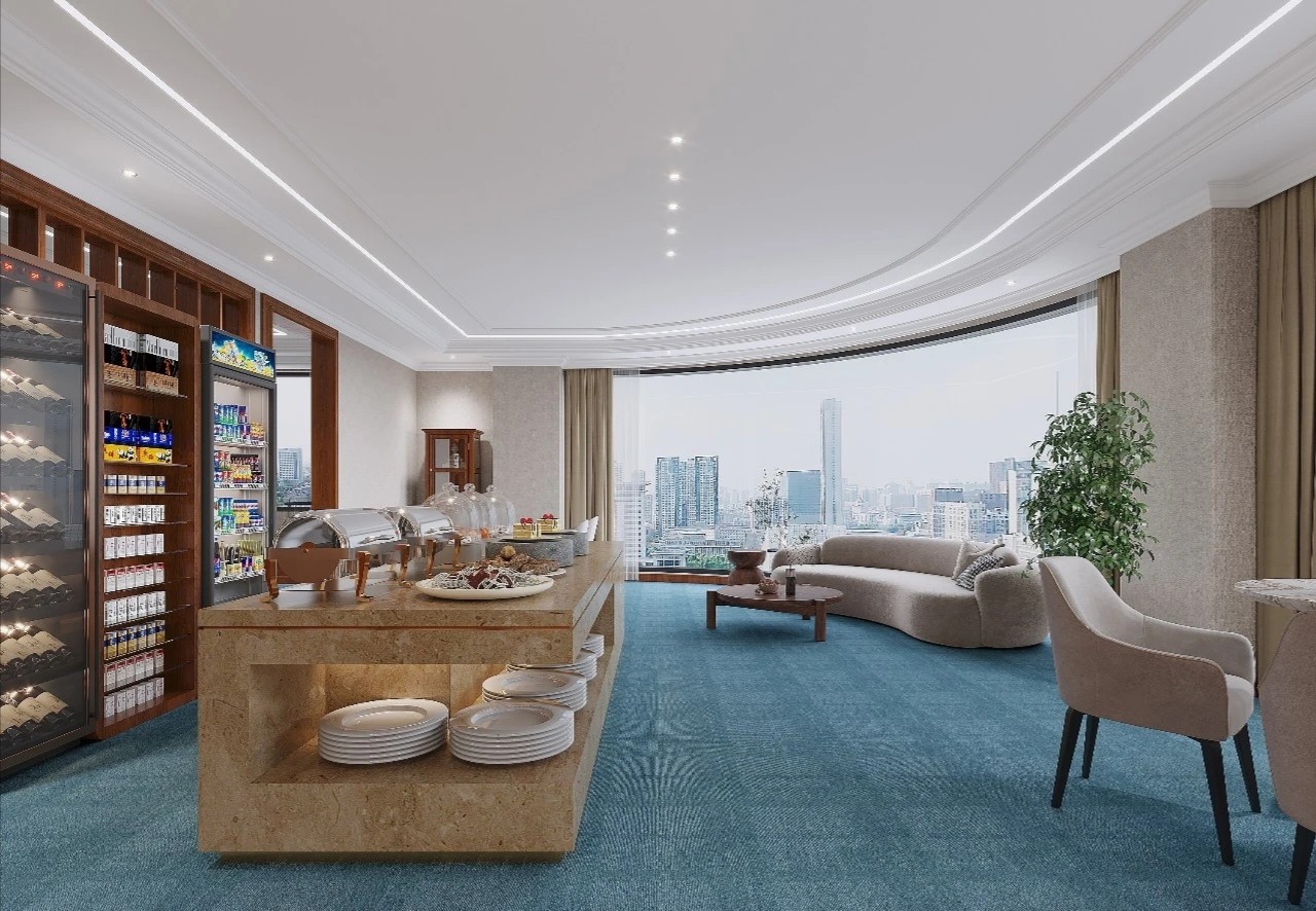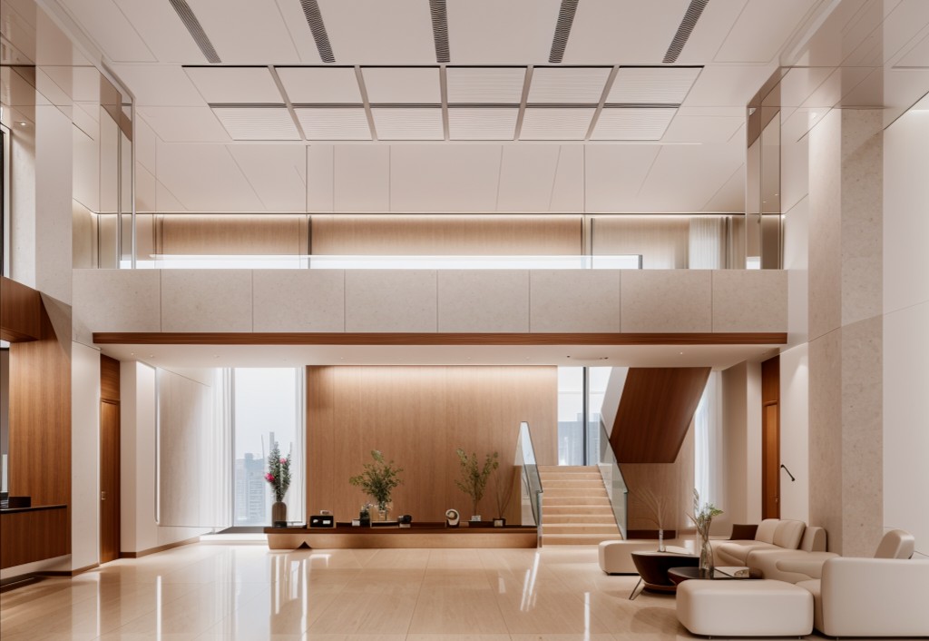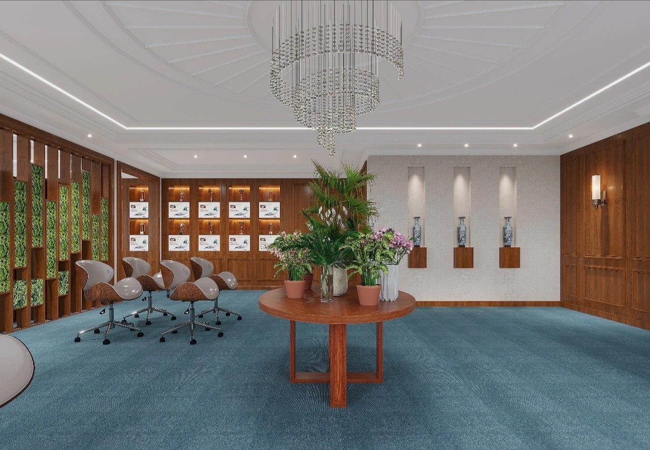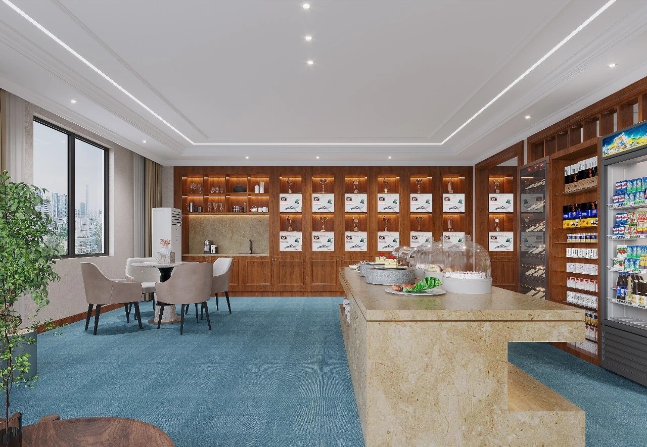 在接待区,选用的是石材加地毯地面,在施工过程中由于考虑到传统回填层重量较大,楼板无法承受该部分重量,项目部采用新工艺在架空地板基层上直接铺贴石材,既保证了面层效果,又解决了装饰层自重问题,方便了地面桥架布设,同时也为后期二次改造提供了便利。黄铜色不锈钢、爱马仕橙皮革、蒂芙尼绿木饰面、檀香飞雪深色石材的运用为整个接待区烘托出精致、热情的感觉。