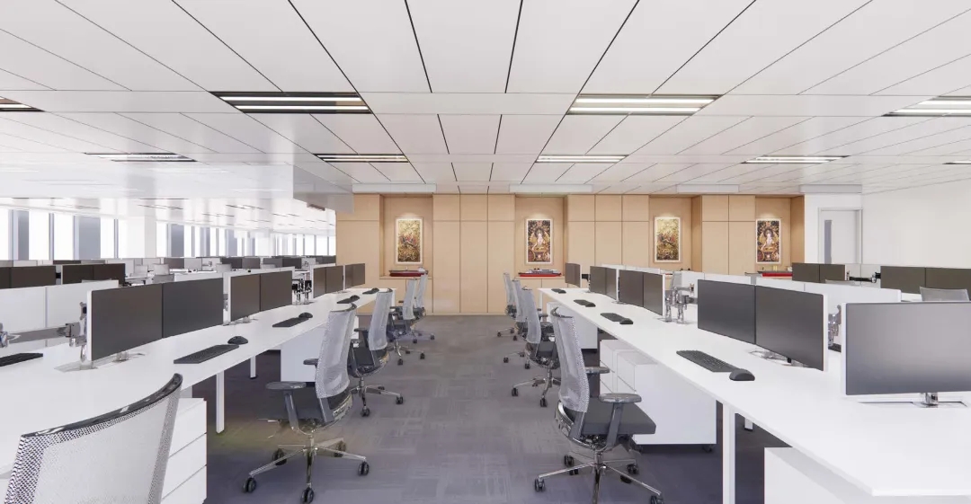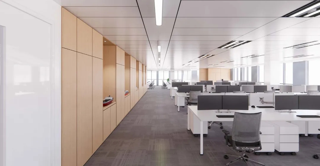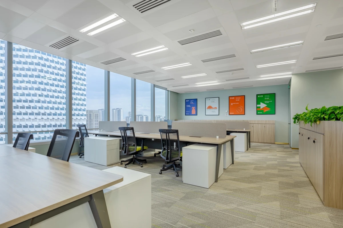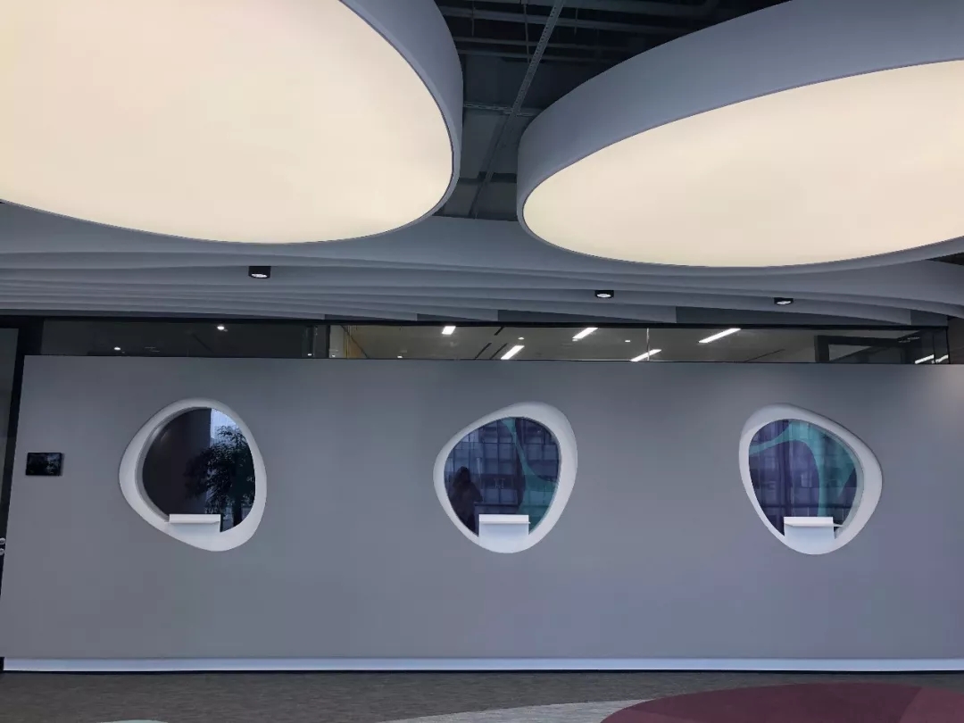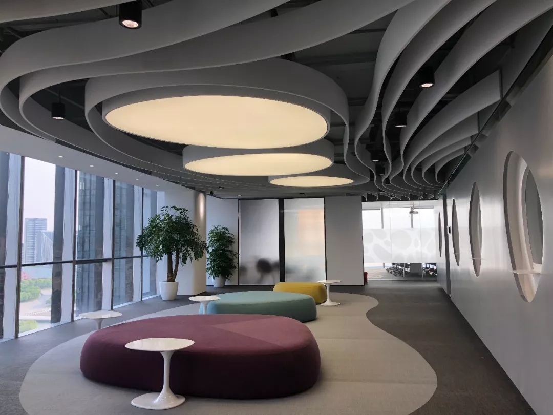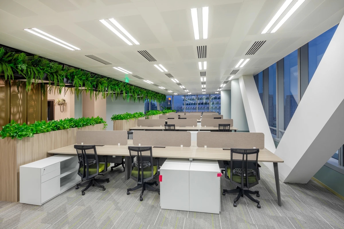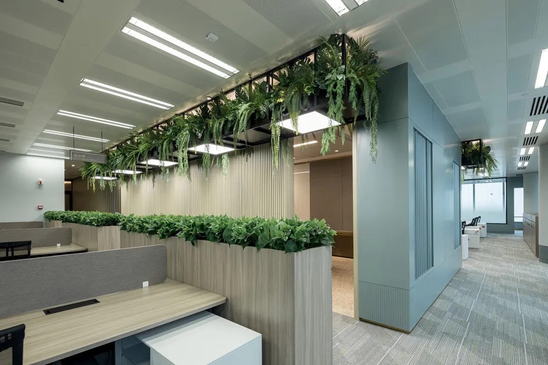整个公共办公区布置简约时尚,在吊架及边柜位置都加入了绿植元素,办公环境优雅温馨,同时还设有创意工作间,将传统墙面设计为可书写白色网格烤漆玻璃,为设计人员提供了更为休闲的创意中心。