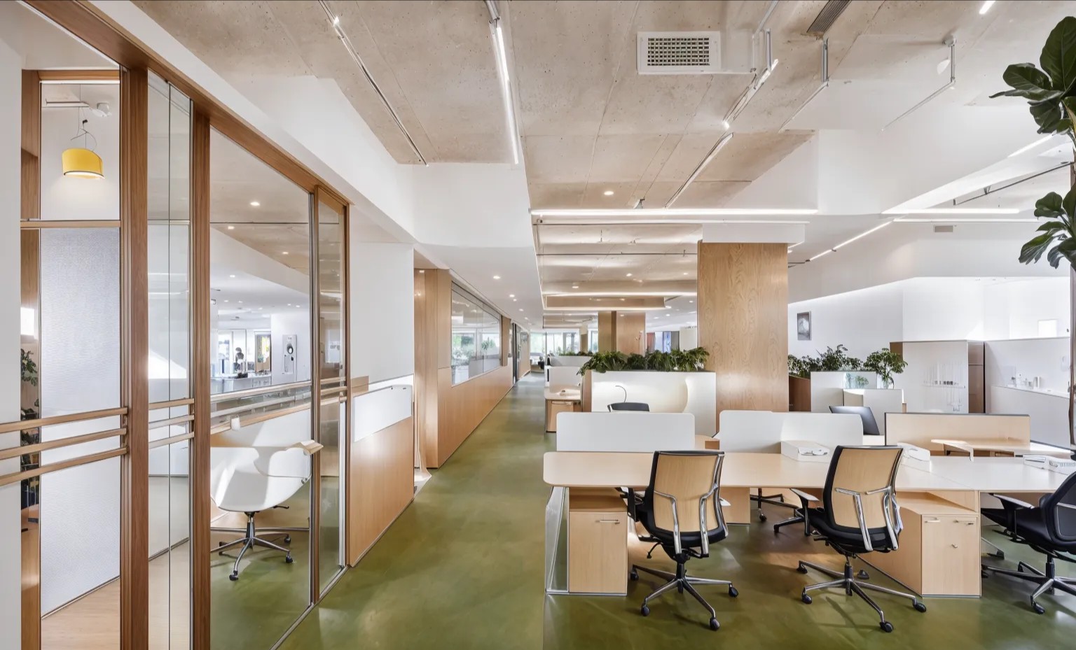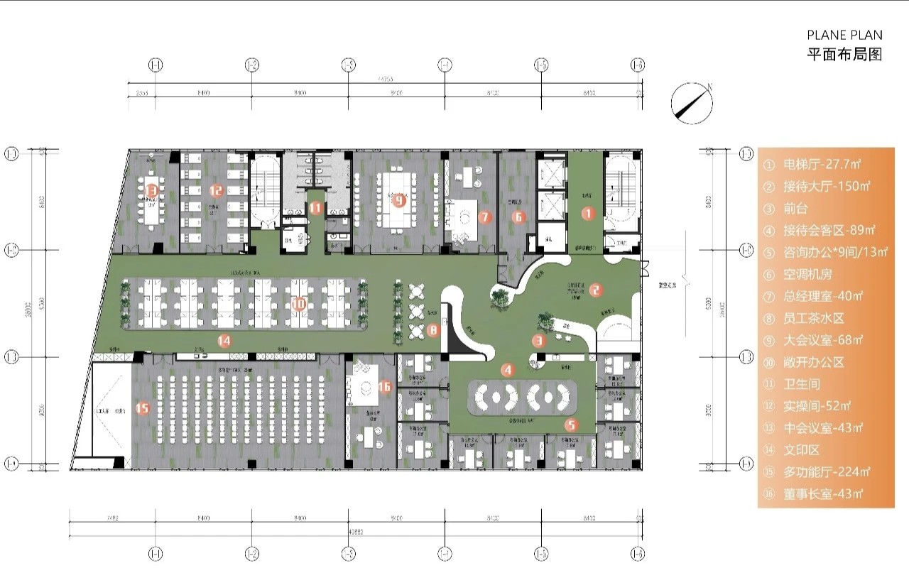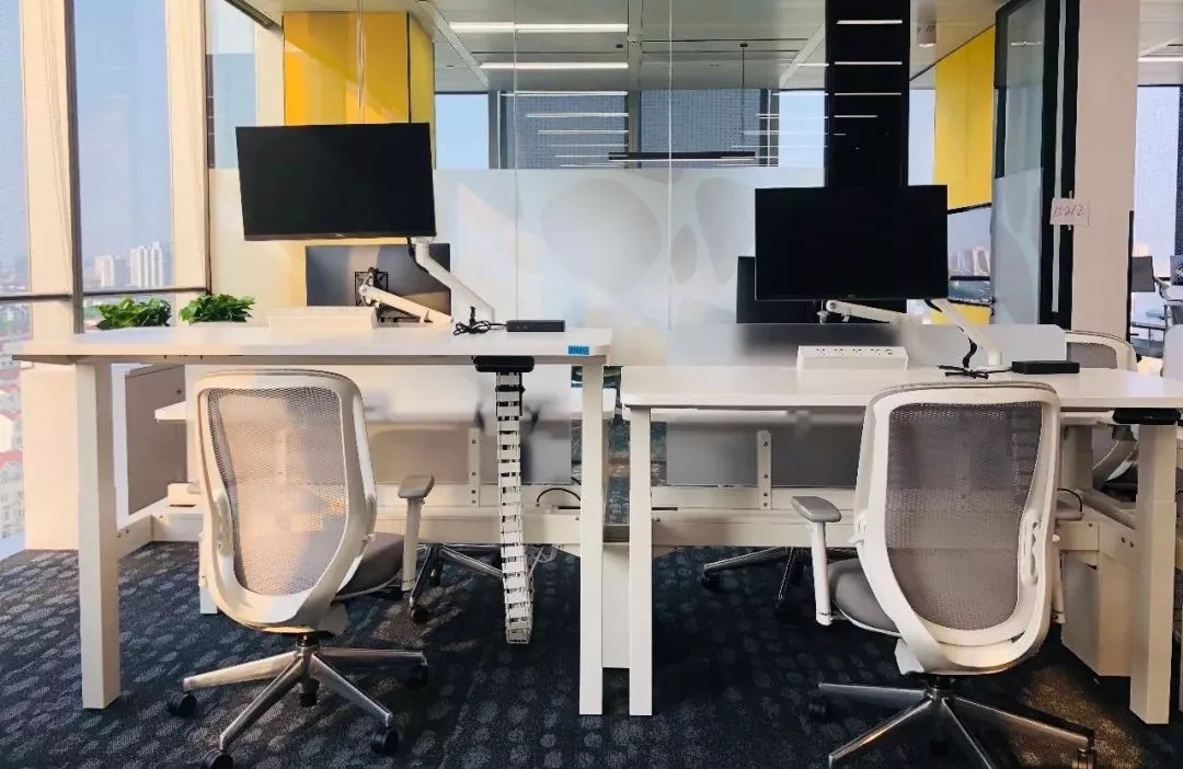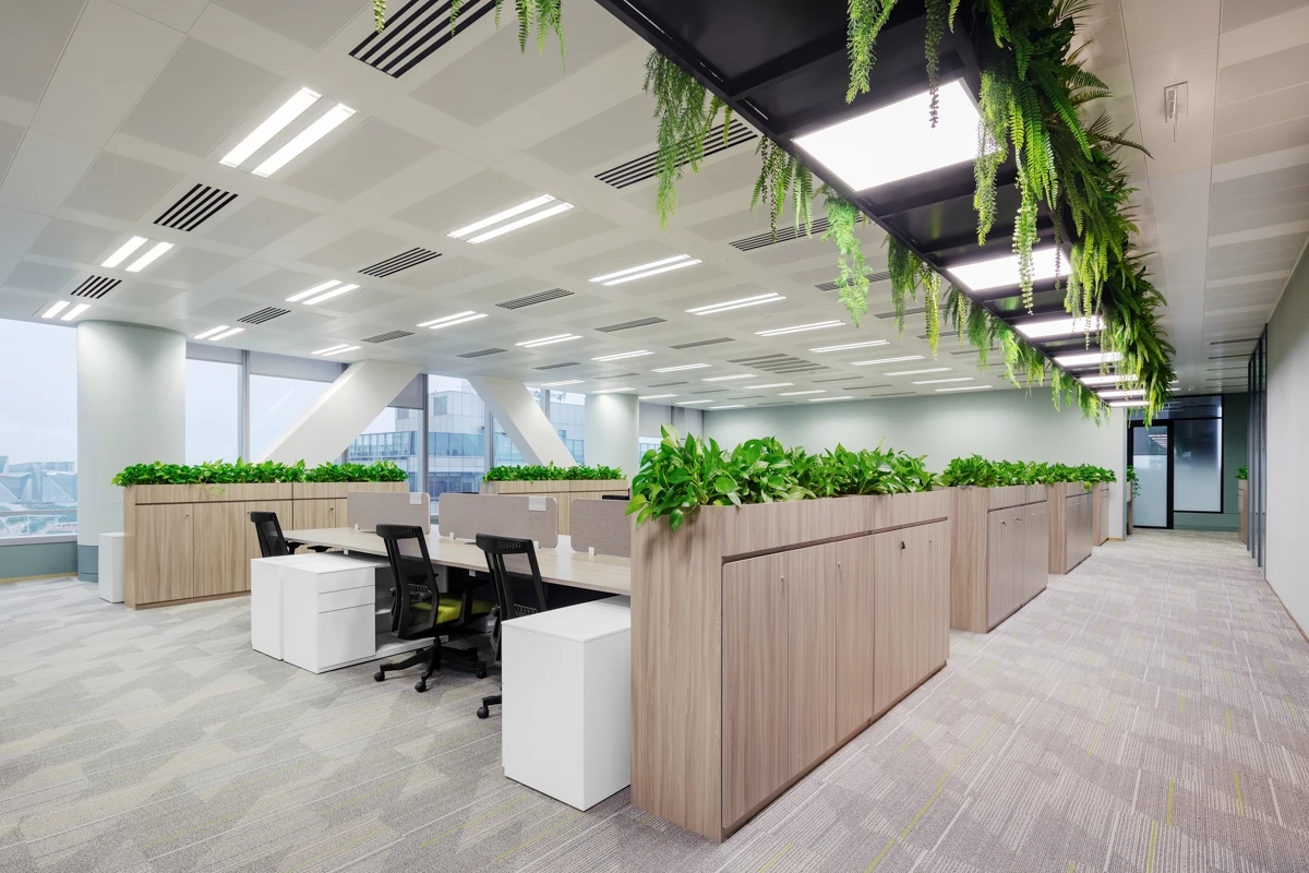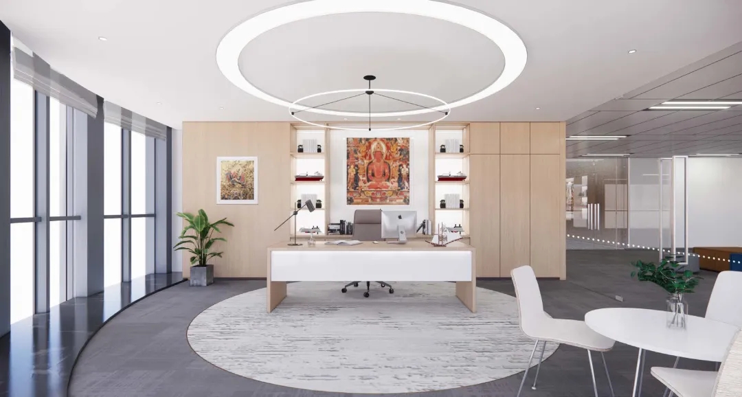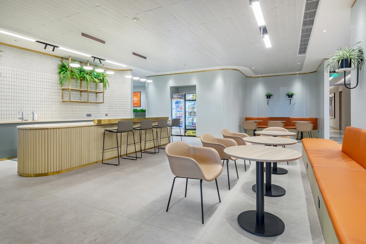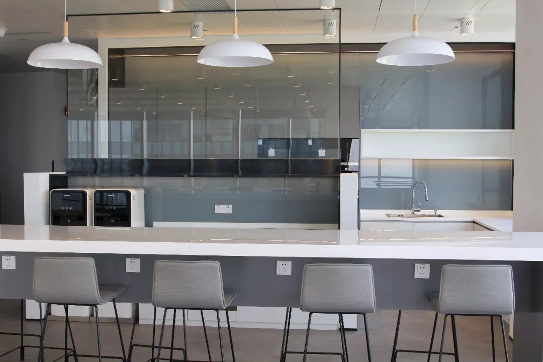 整个公共办公区布置简约时尚,在吊架及边柜位置都加入了绿植元素,办公环境优雅温馨,同时还设有创意工作间,将传统墙面设计为可书写白色网格烤漆玻璃,为设计人员提供了更为休闲的创意中心。