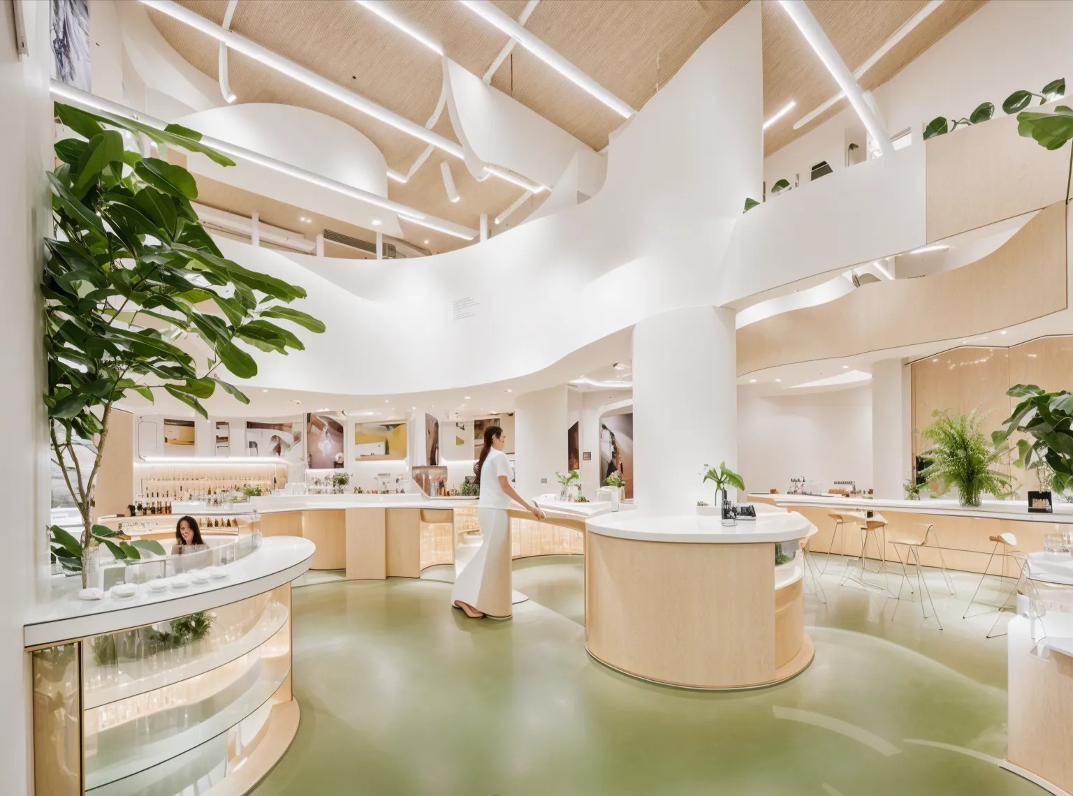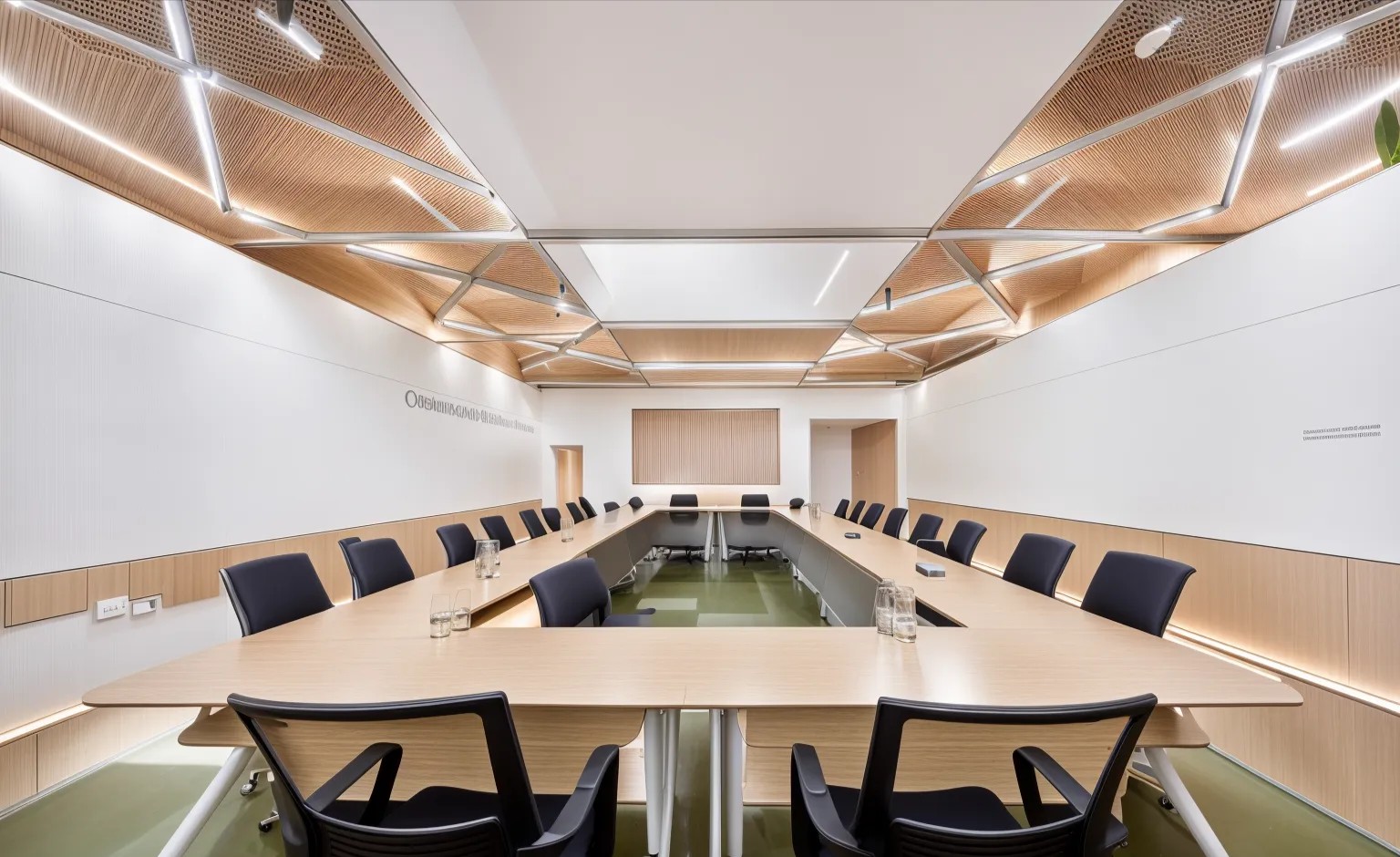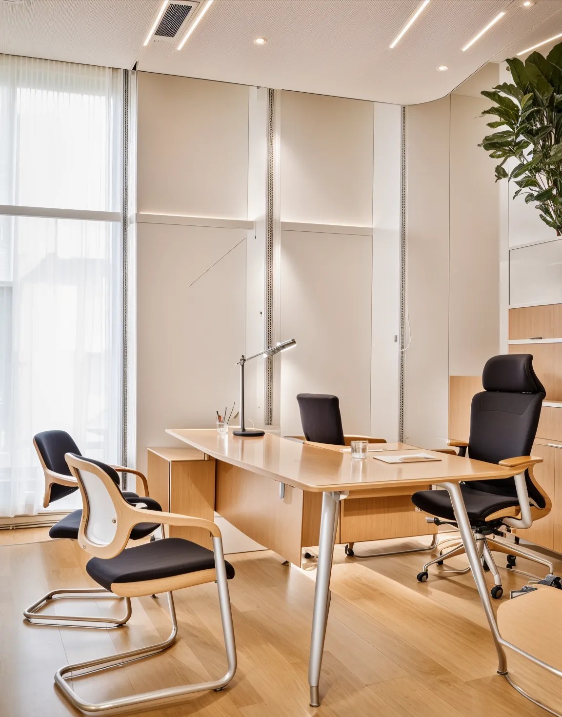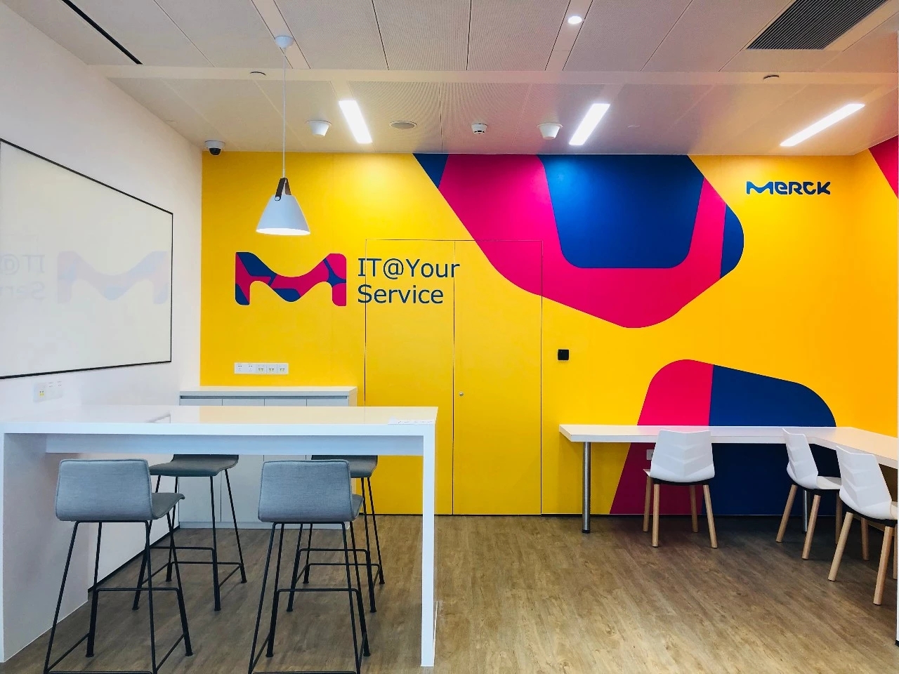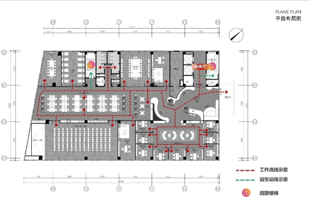 整个公共办公区布置简约时尚,在吊架及边柜位置都加入了绿植元素,办公环境优雅温馨,同时还设有创意工作间,将传统墙面设计为可书写白色网格烤漆玻璃,为设计人员提供了更为休闲的创意中心。