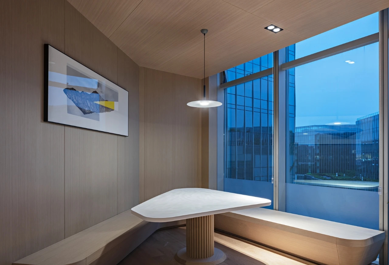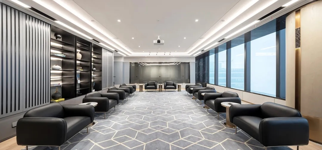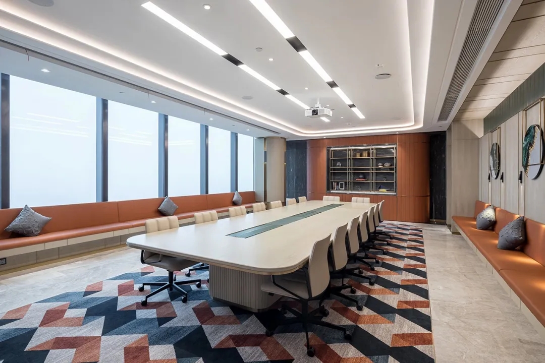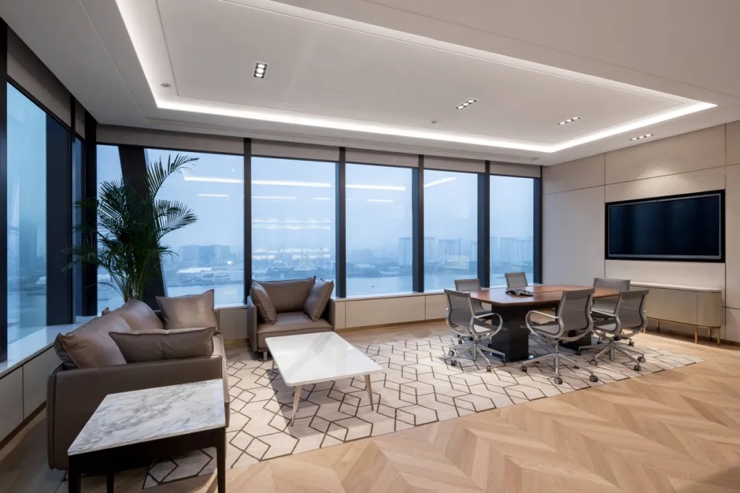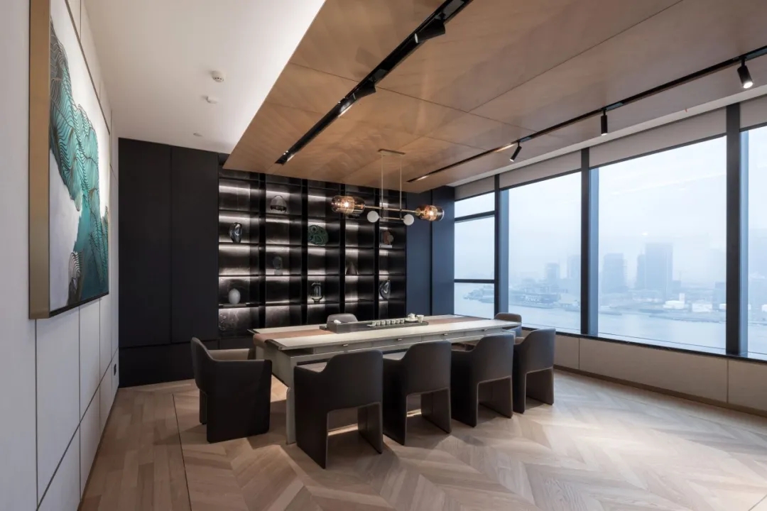 整个19-20层共设有11个大小会议室,且会议室风格多样,其中小会议室墙面采用的是整面灰色绒布硬包,手感舒适的同时兼顾隔音效果,再搭配上橙色真皮会议沙发,窗外黄浦江一线江景迎面而来,整个空间给人以大气、精致的氛围感。