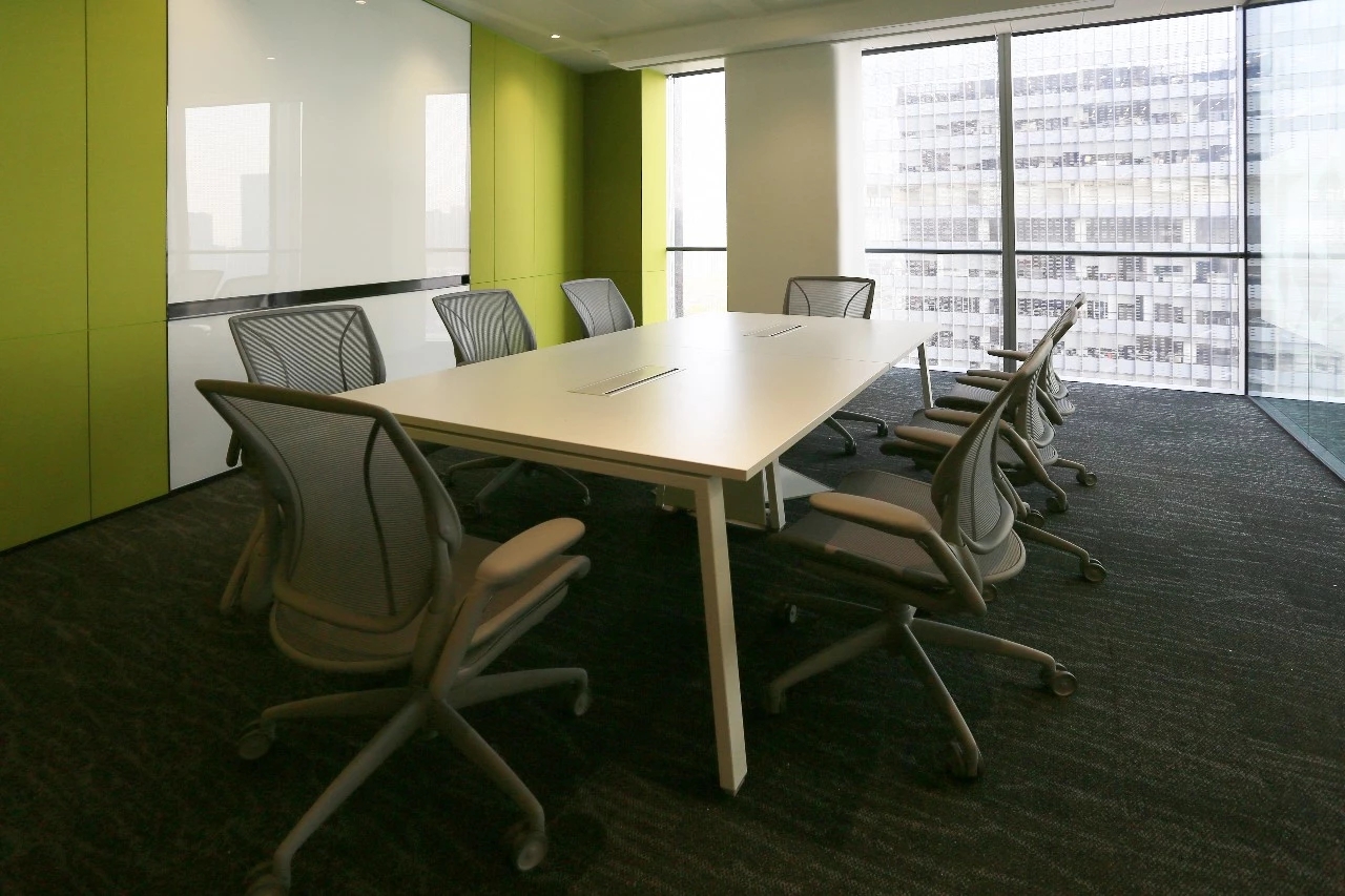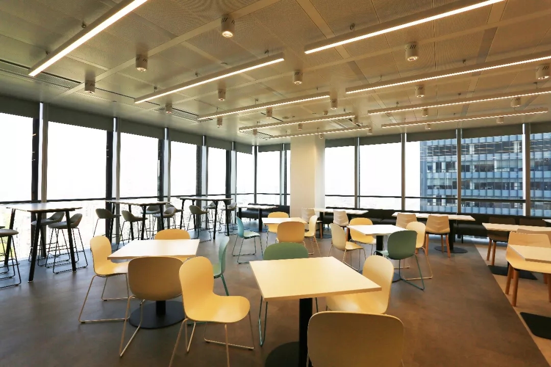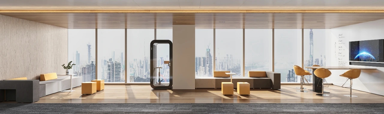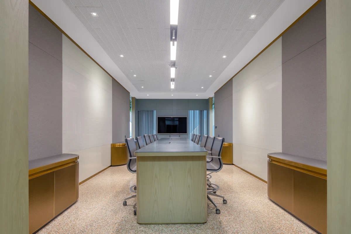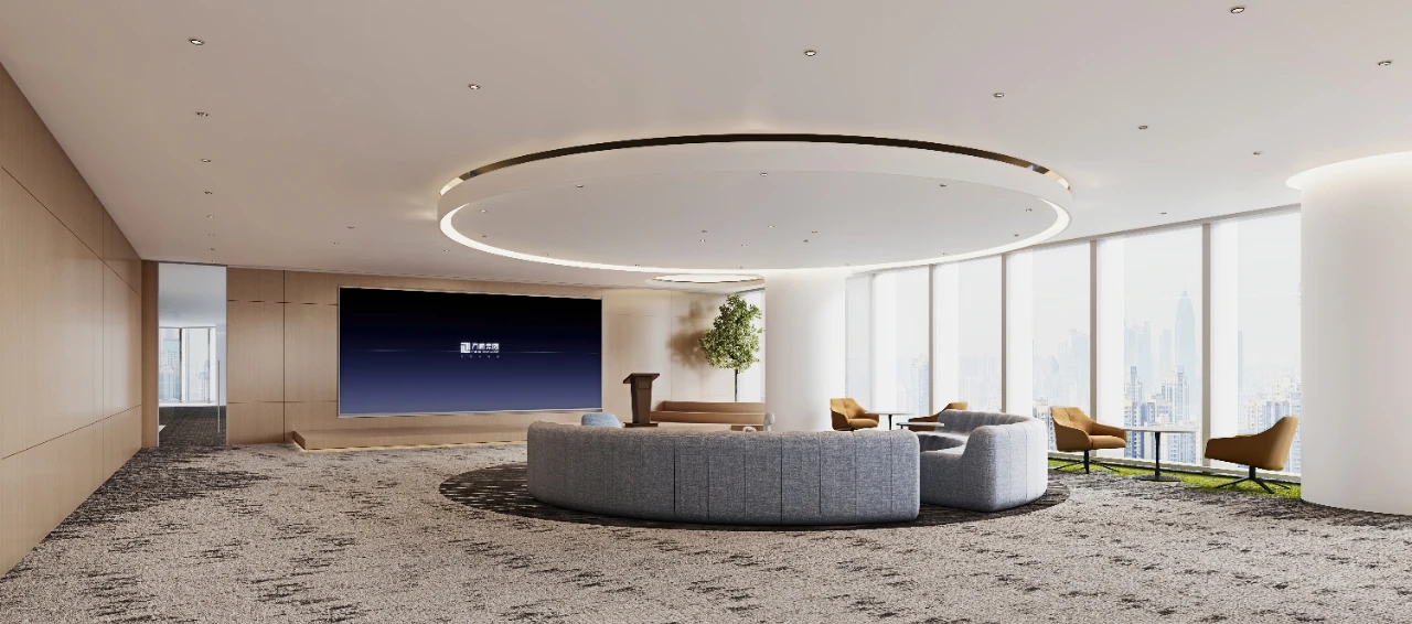 整个19-20层共设有11个大小会议室,且会议室风格多样,其中小会议室墙面采用的是整面灰色绒布硬包,手感舒适的同时兼顾隔音效果,再搭配上橙色真皮会议沙发,窗外黄浦江一线江景迎面而来,整个空间给人以大气、精致的氛围感。