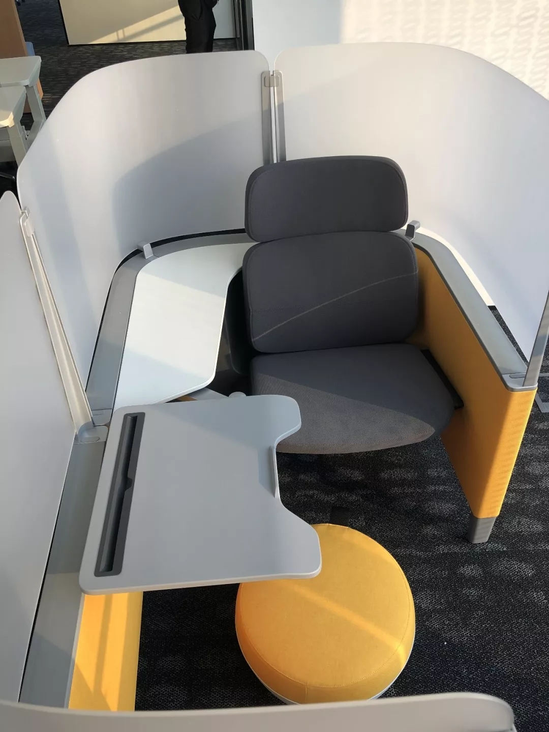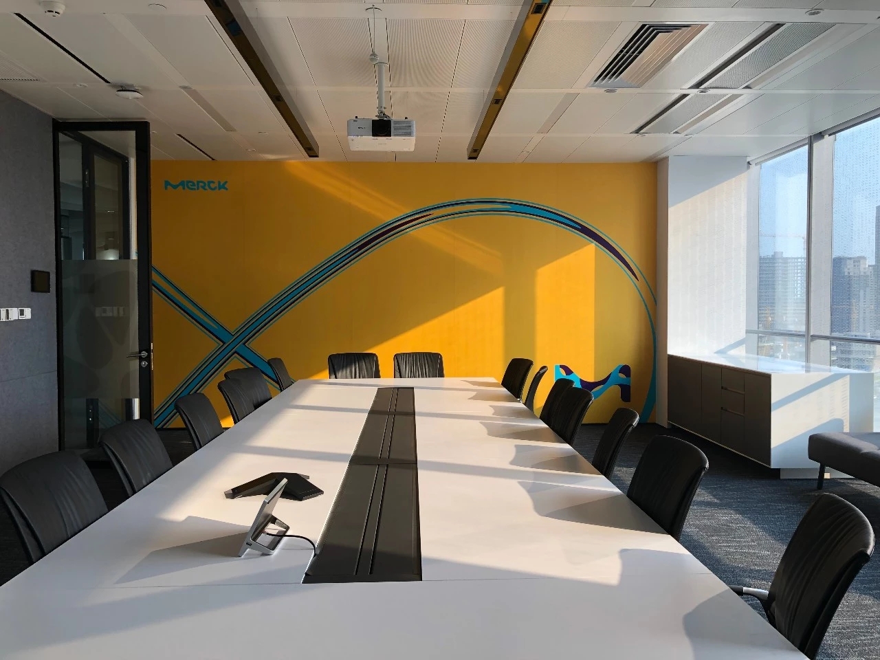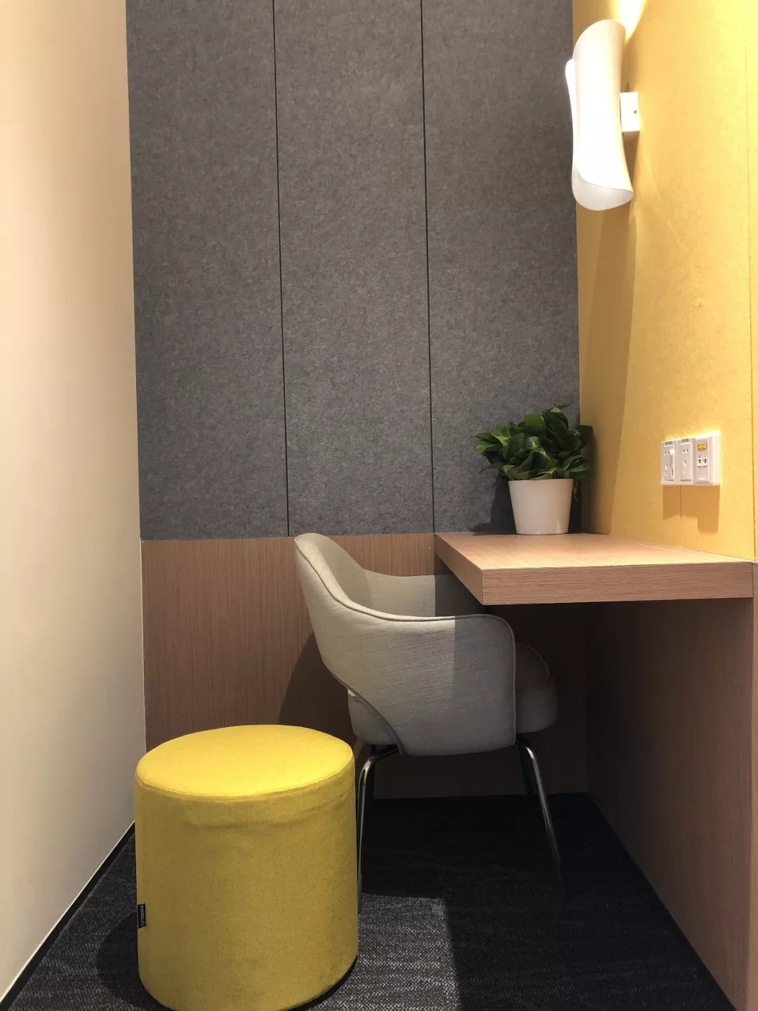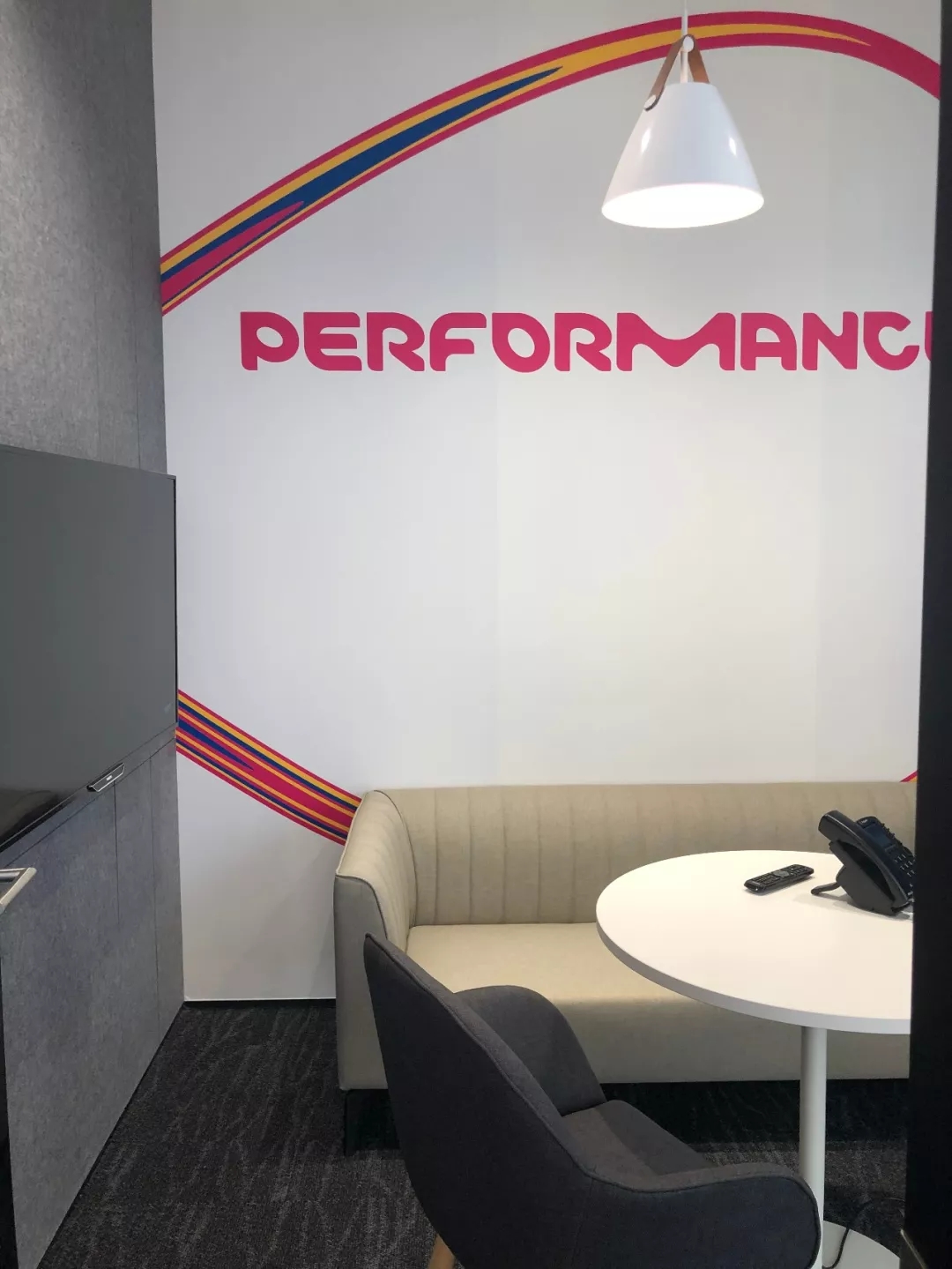 整个19-20层共设有11个大小会议室,且会议室风格多样,其中小会议室墙面采用的是整面灰色绒布硬包,手感舒适的同时兼顾隔音效果,再搭配上橙色真皮会议沙发,窗外黄浦江一线江景迎面而来,整个空间给人以大气、精致的氛围感。