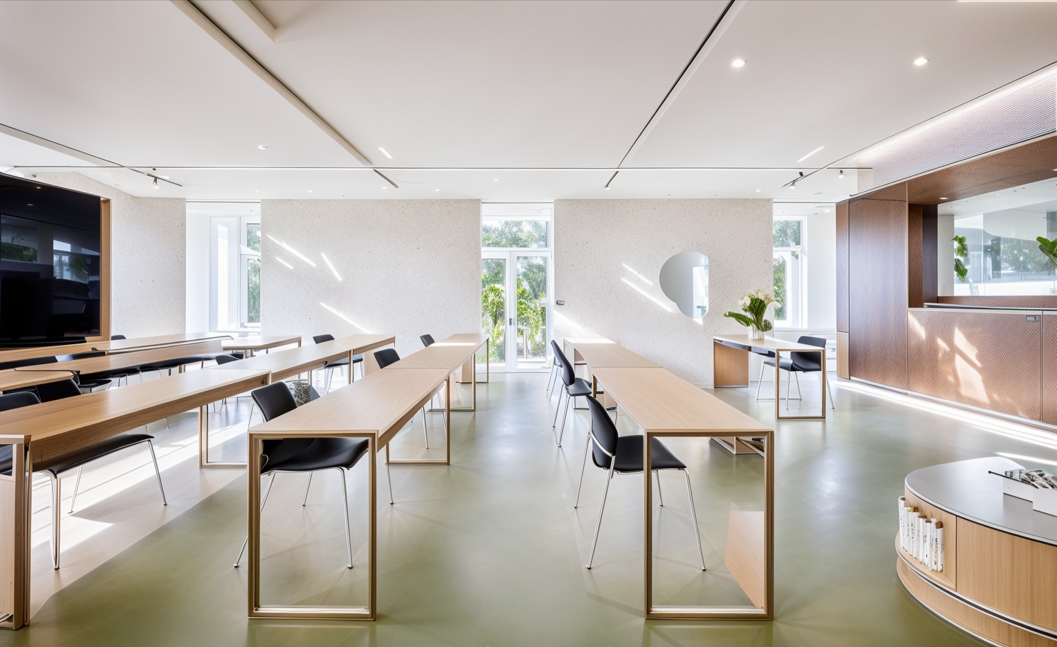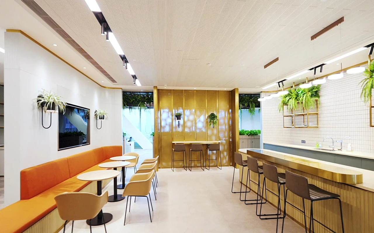 来到休息区,由穿孔黄铜色不锈钢屏风与工作区隔开,从而创造私密性和分隔性,同时允许自然光进入空间。