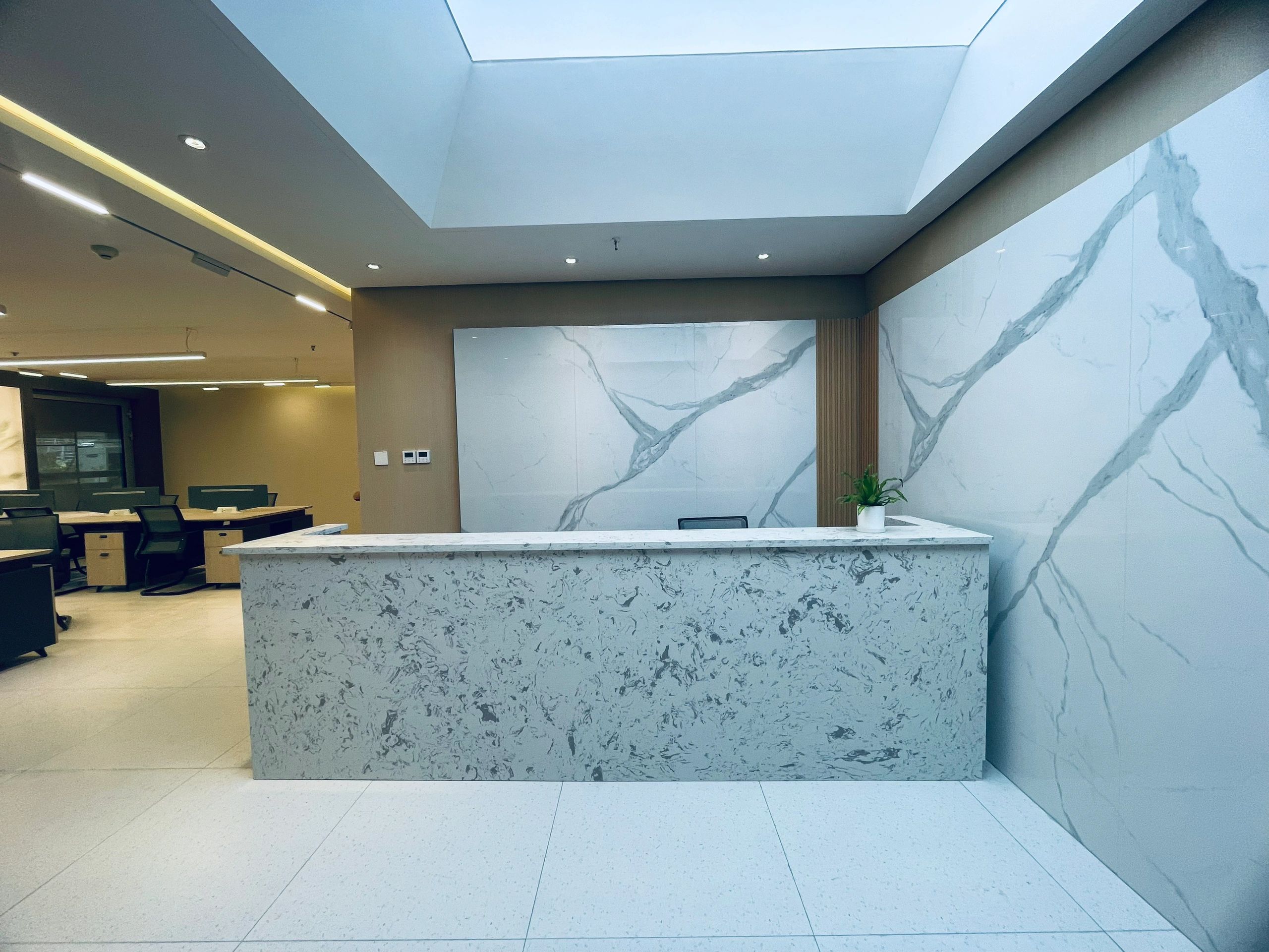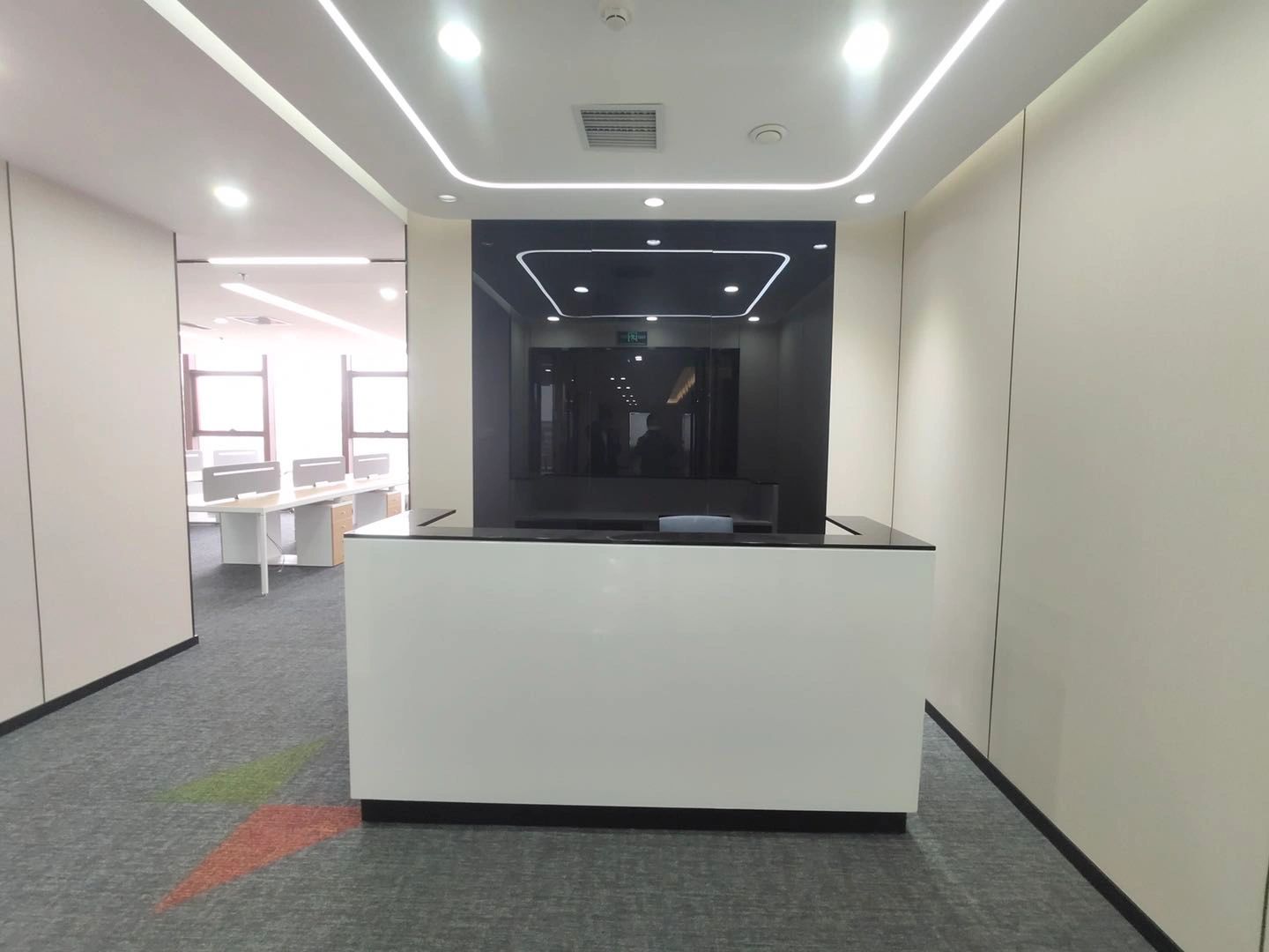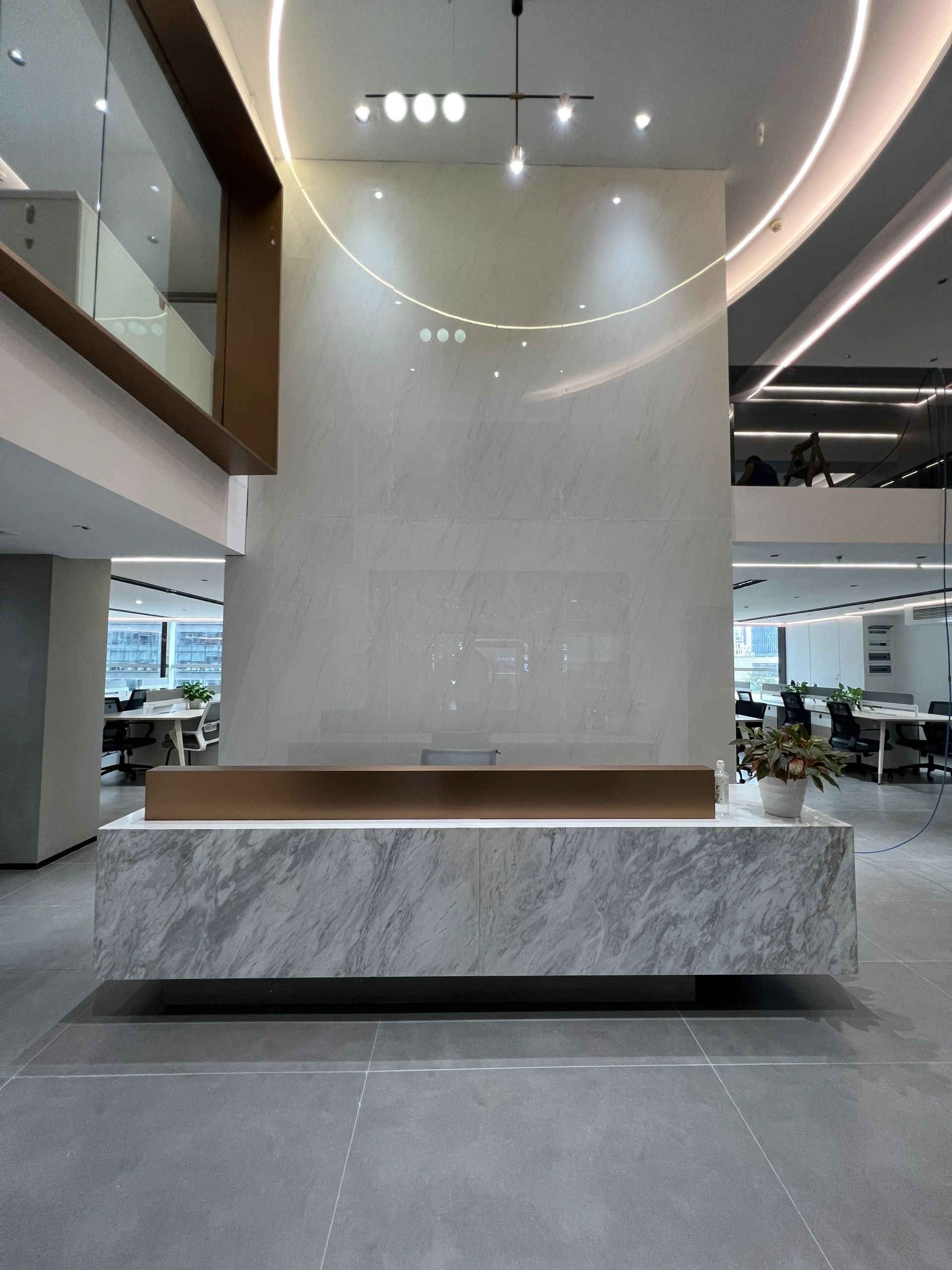 前台的设计保证了光线引入,在前台对面设置企业展示墙,可有效提升企业形象。仿铜不锈钢的接待台设计简洁大方,与整体室内风格相协调。这种颜色选择既不失稳重,又带有一定的现代感。接待台作为前台的重要部分,其设计不仅影响着来访者的第一印象,也反映了公司的管理水平和服务态度。