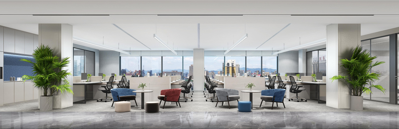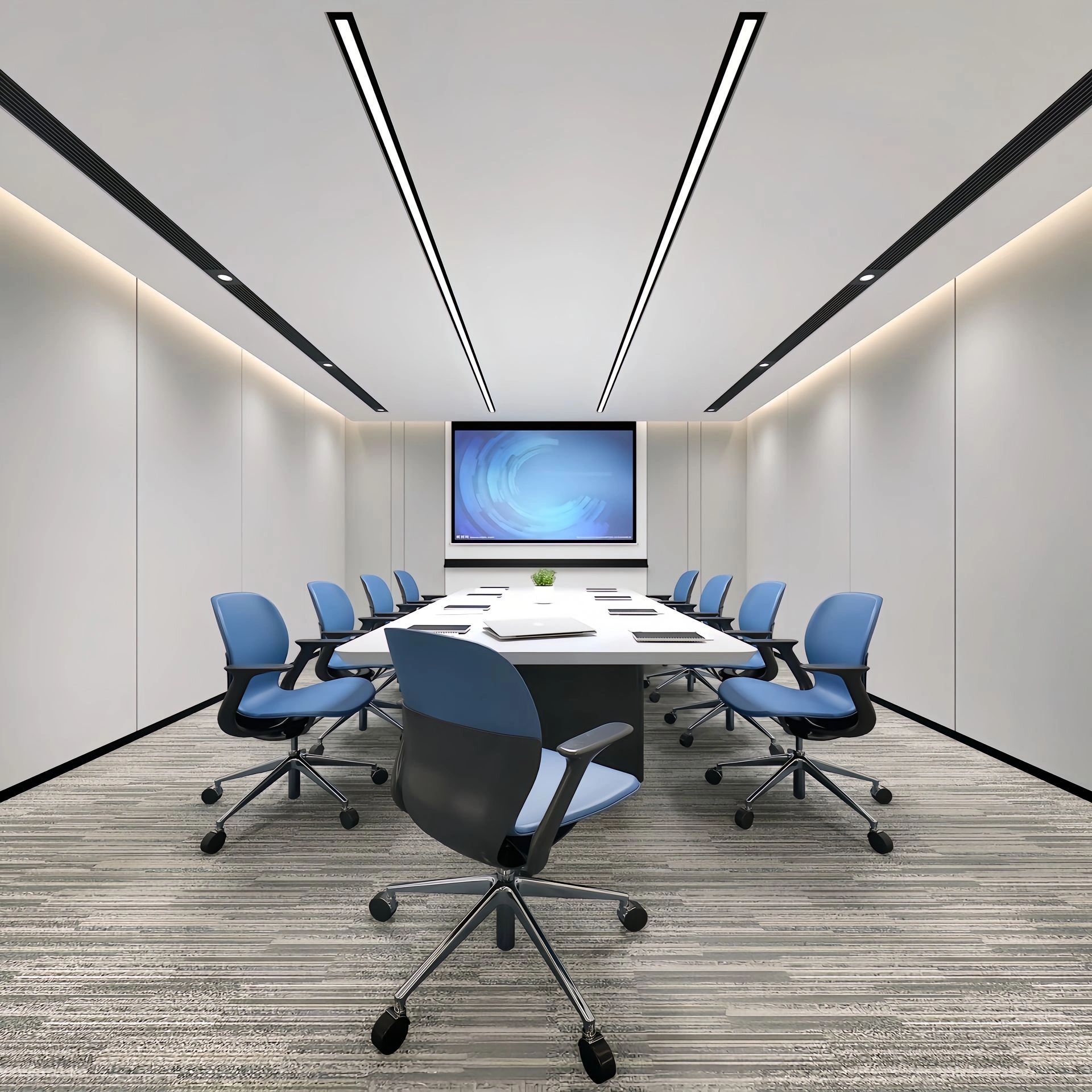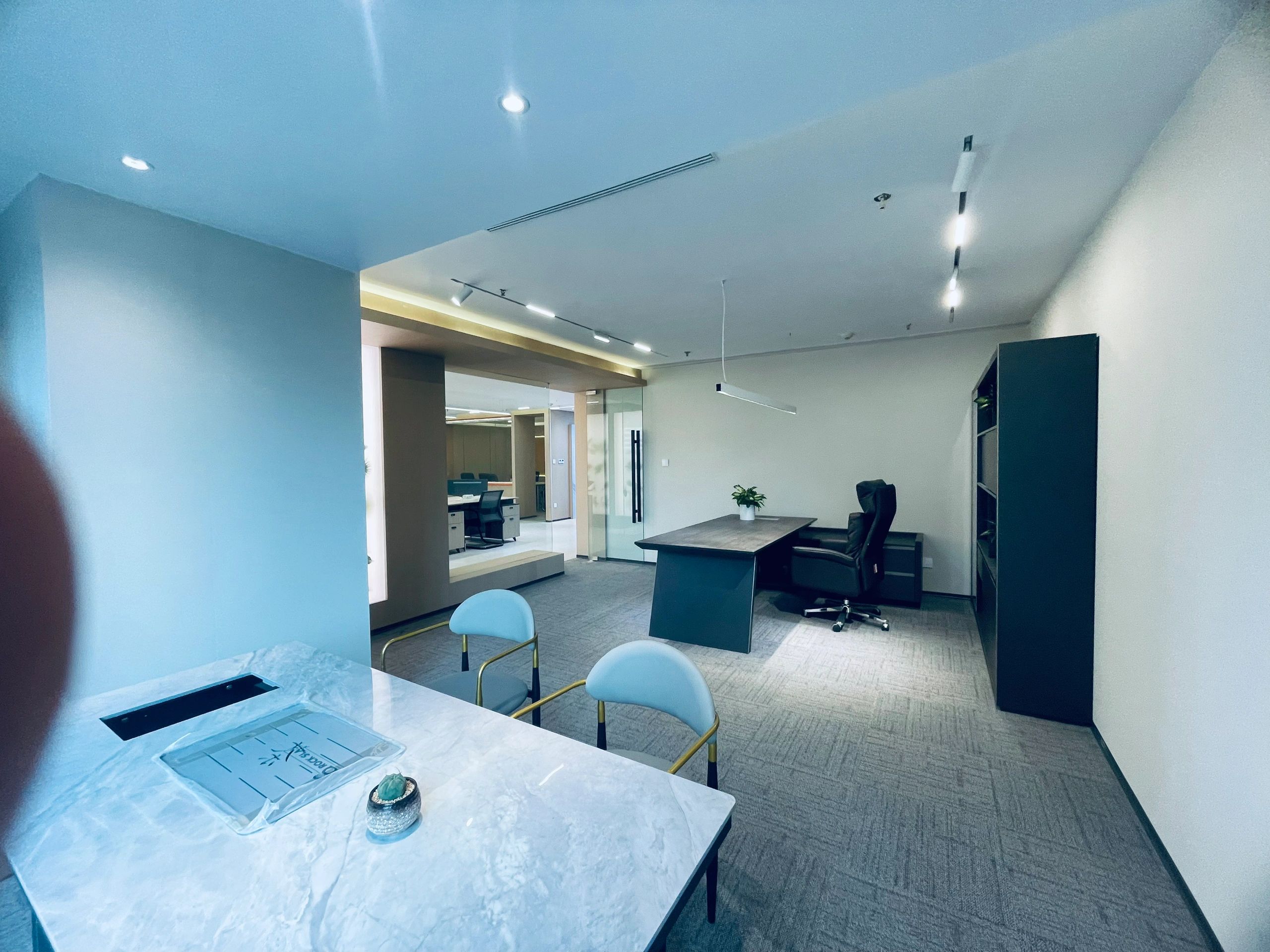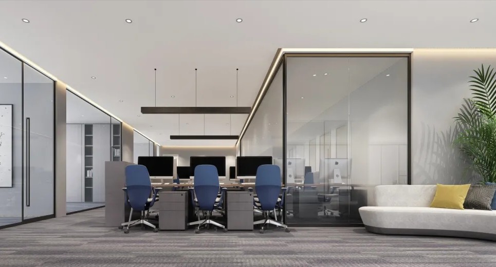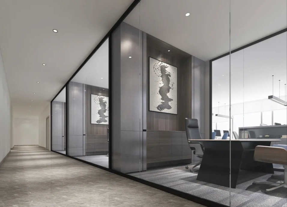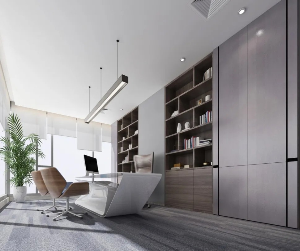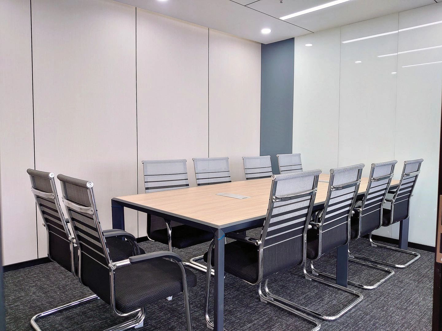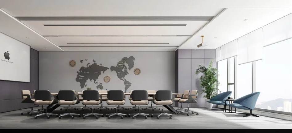 中会议室的设计以现代简约为主,线条简洁明快,色彩搭配和谐统一。这种设计风格不仅符合现代审美趋势,也体现了公司的专业形象和创新精神。灰色地毯的铺设不仅增加了行走的舒适度,还有助于减少噪音,为会议提供一个更为宁静的环境。会议室的一侧设置玻璃隔断,不仅使空间得到了合理的划分,还通过玻璃材质增加了空间的通透感。