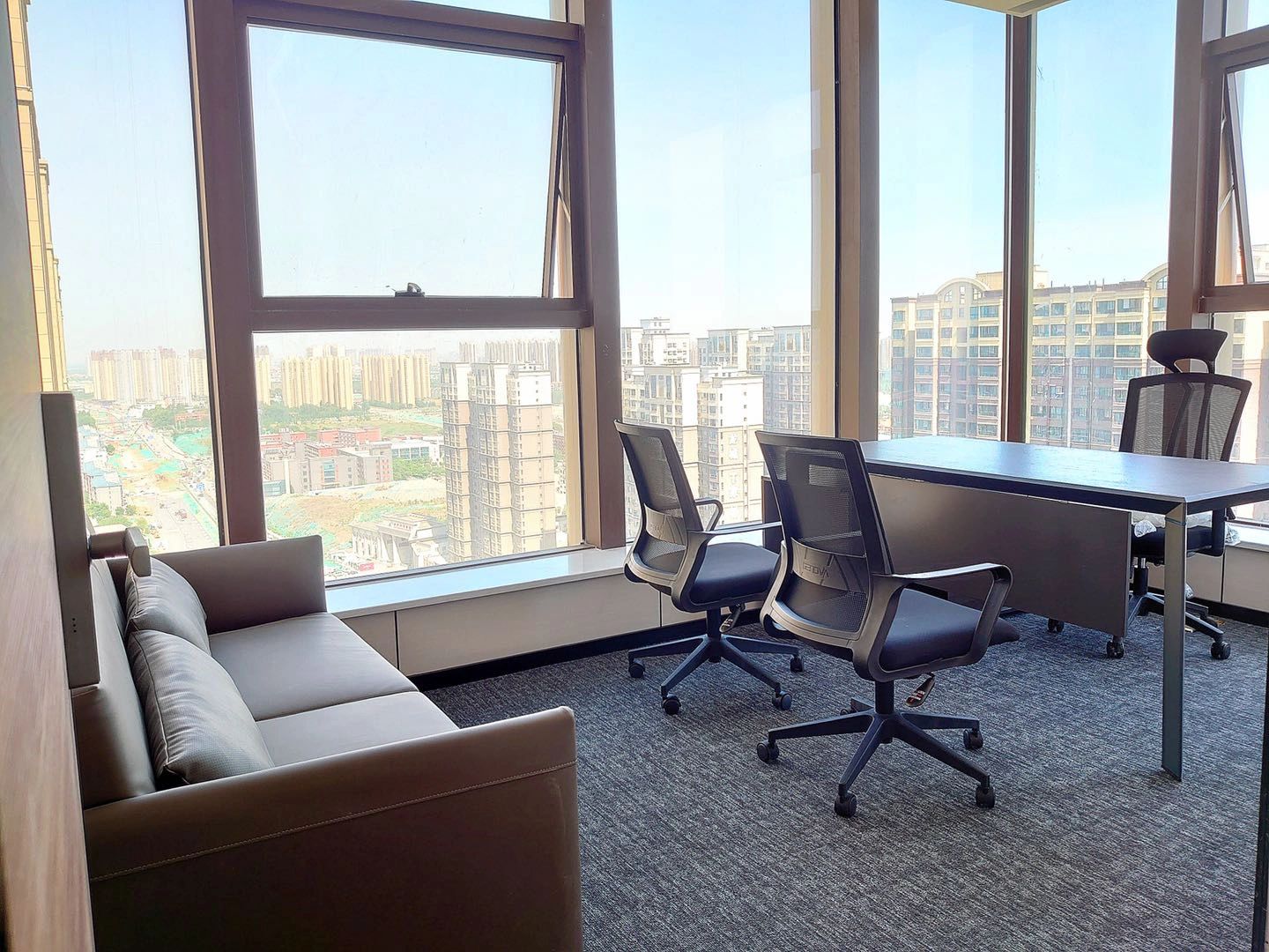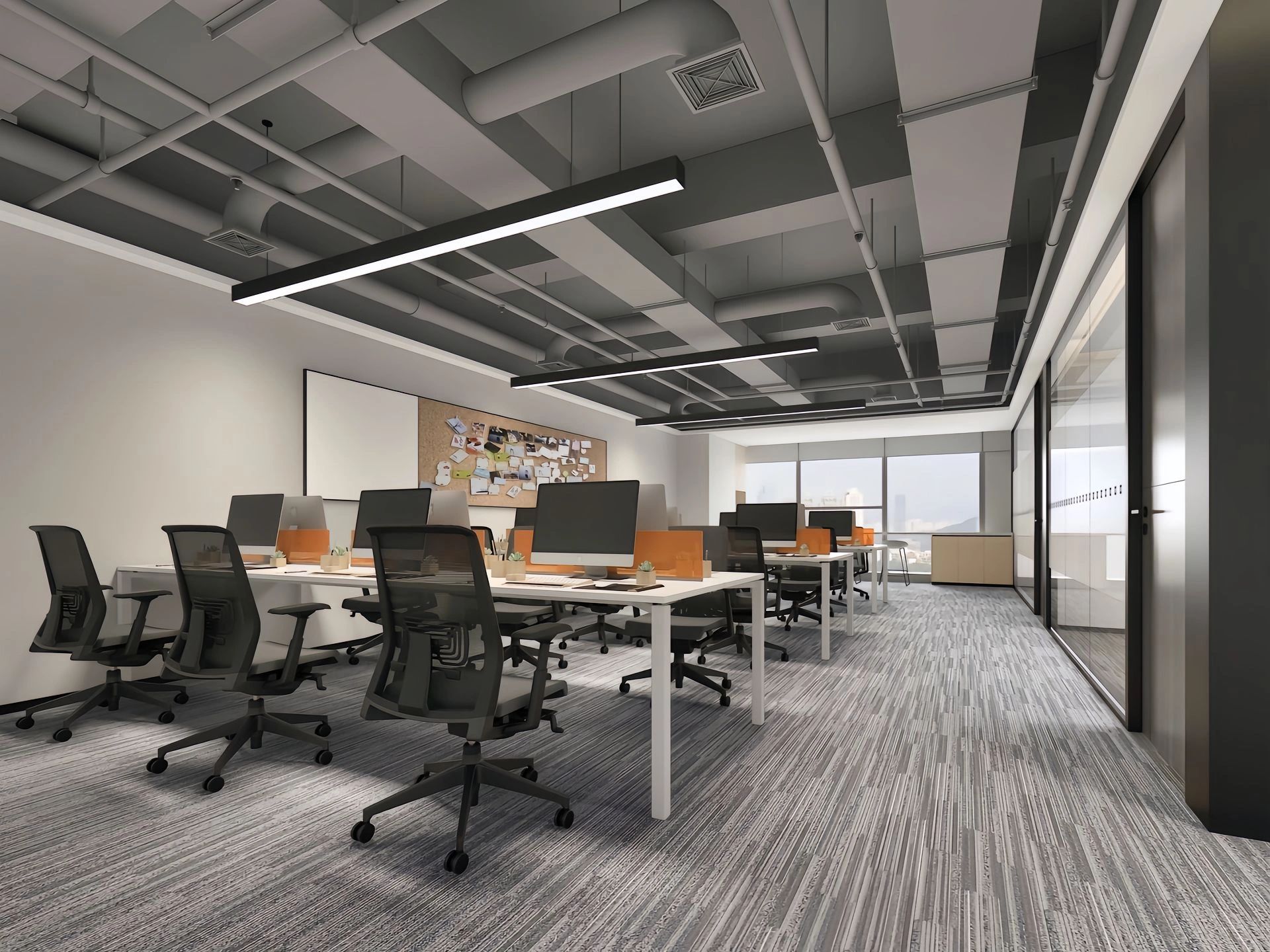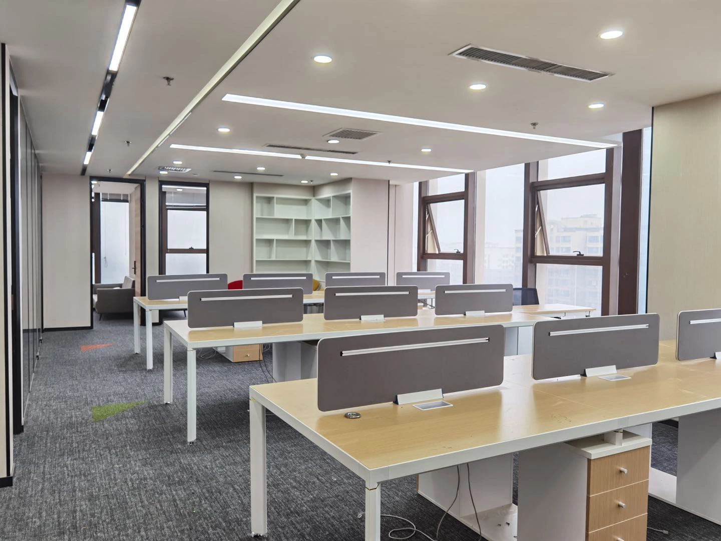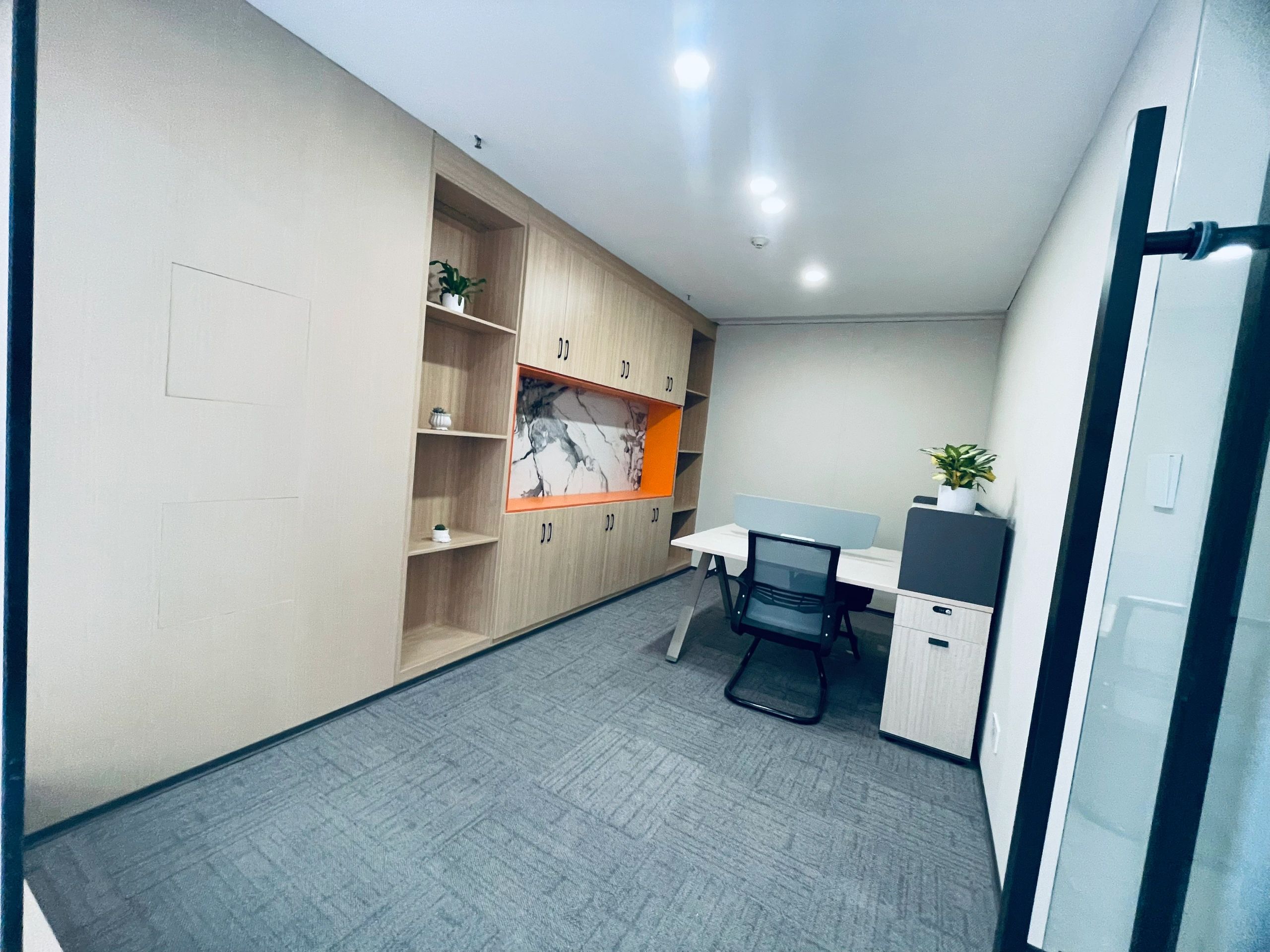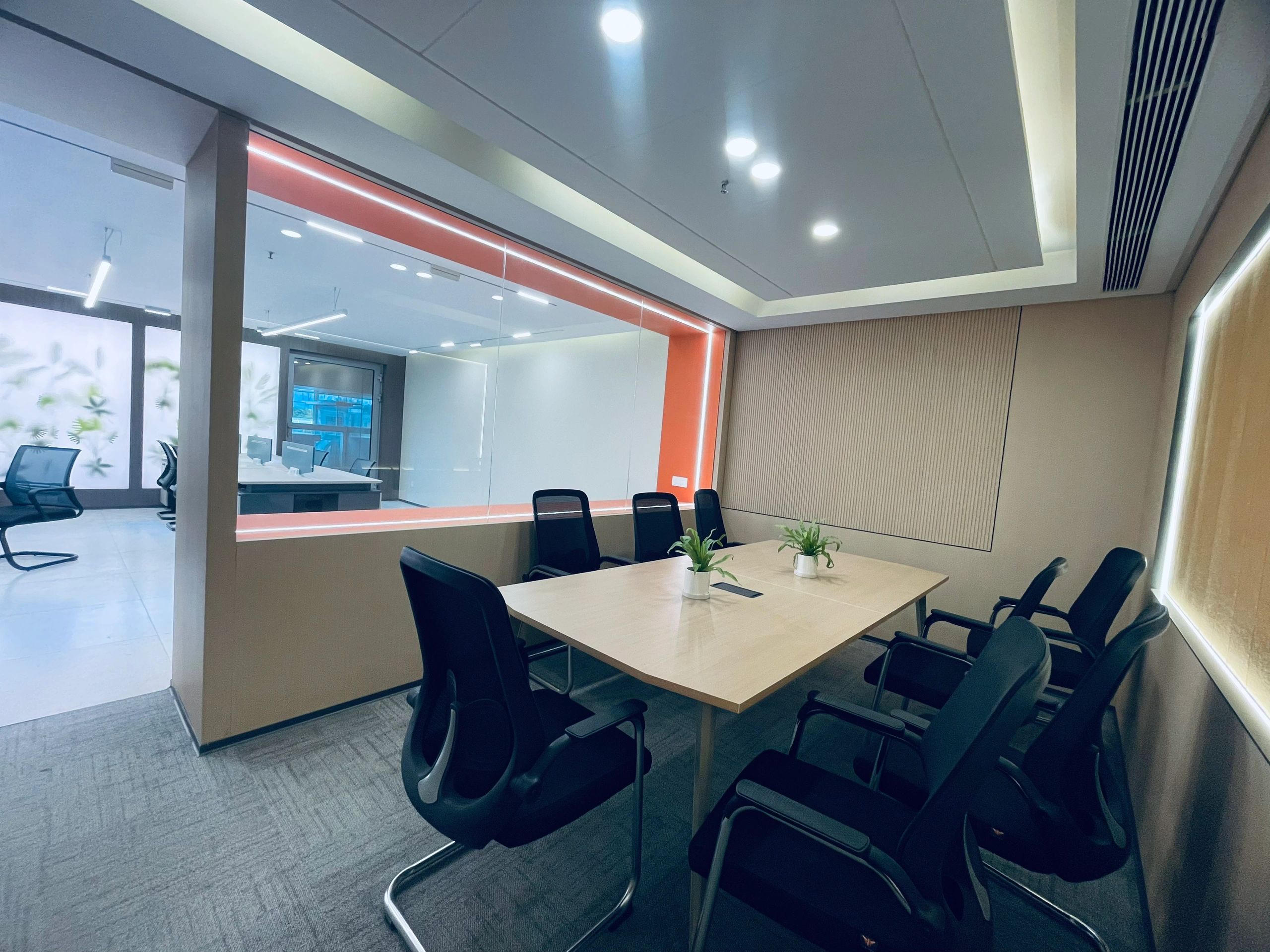 中会议室的设计以现代简约为主,线条简洁明快,色彩搭配和谐统一。这种设计风格不仅符合现代审美趋势,也体现了公司的专业形象和创新精神。灰色地毯的铺设不仅增加了行走的舒适度,还有助于减少噪音,为会议提供一个更为宁静的环境。会议室的一侧设置玻璃隔断,不仅使空间得到了合理的划分,还通过玻璃材质增加了空间的通透感。