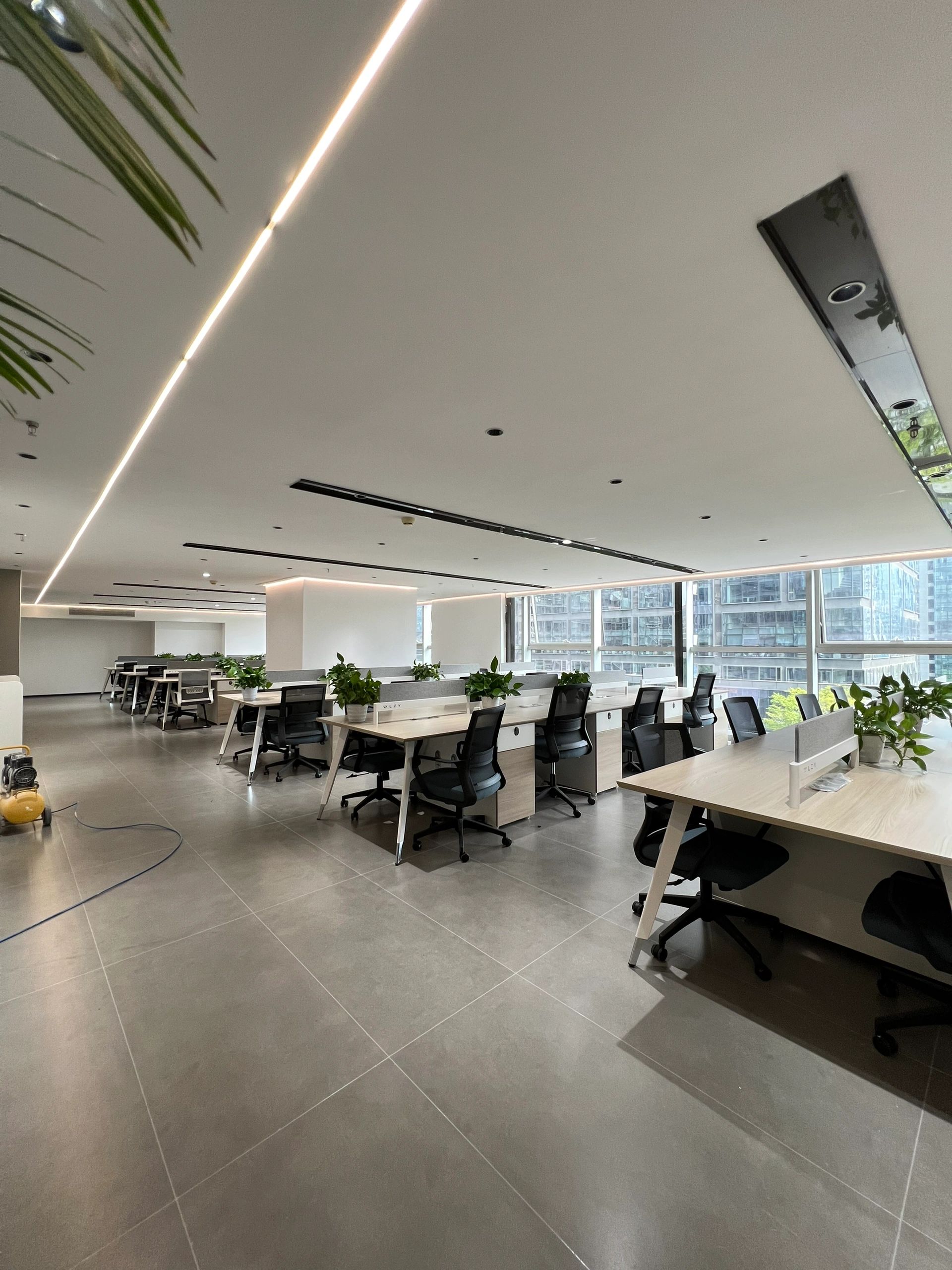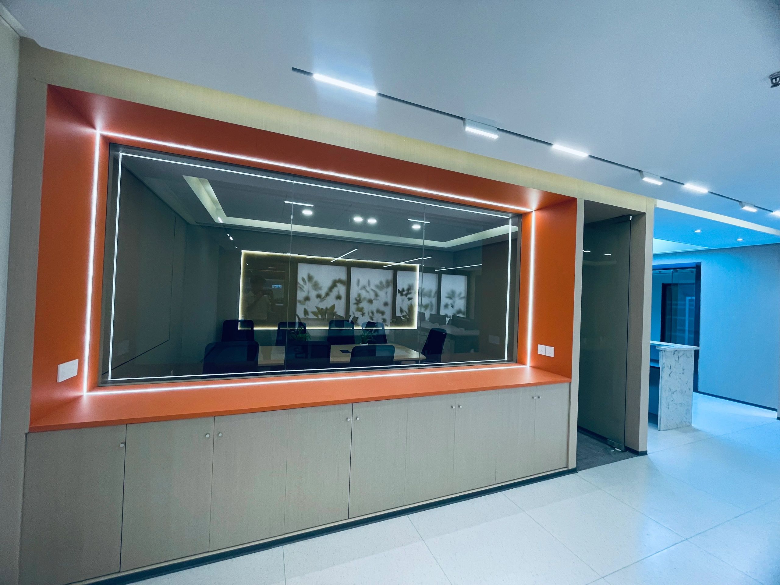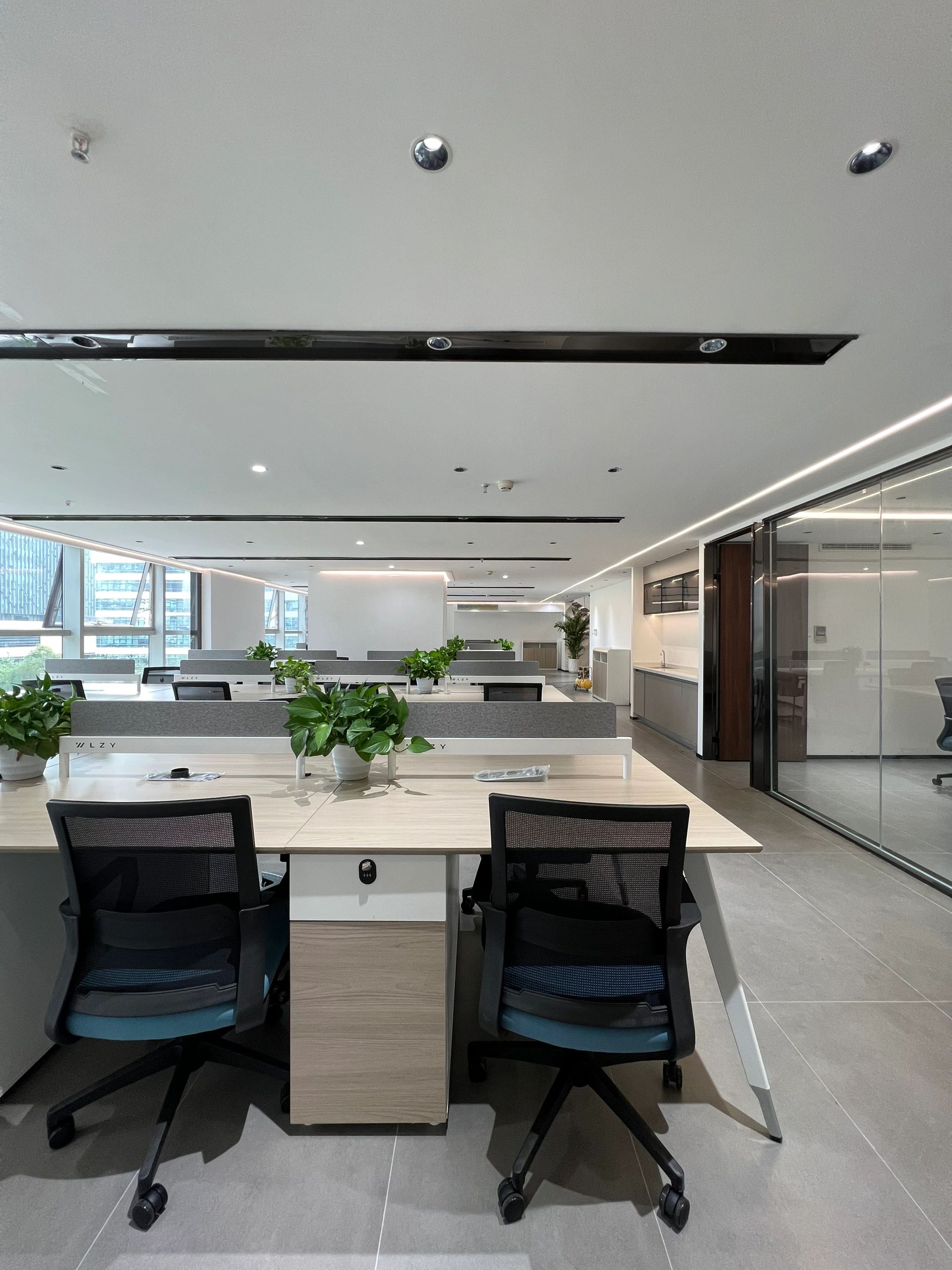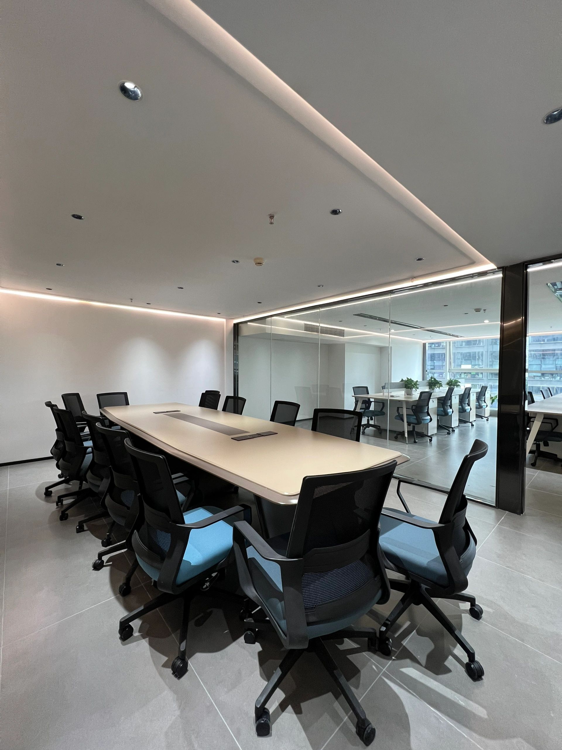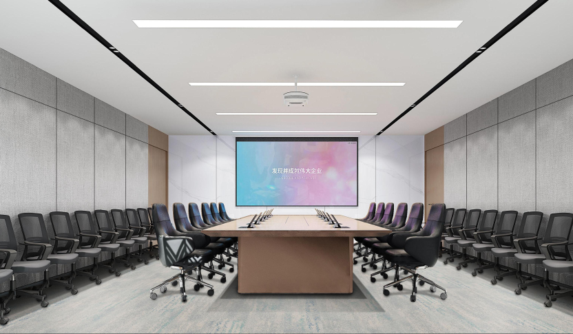 大会议室可容纳40人以上同时参会,窗边柱子用布艺硬包修饰,设计保证会议内容的私密性。以浅灰色和白色为主,给人一种专业、冷静和舒适的感觉。白色的天花板和嵌入式照明设备则让整个空间显得更加明亮和宽敞。