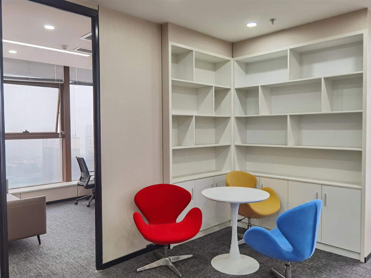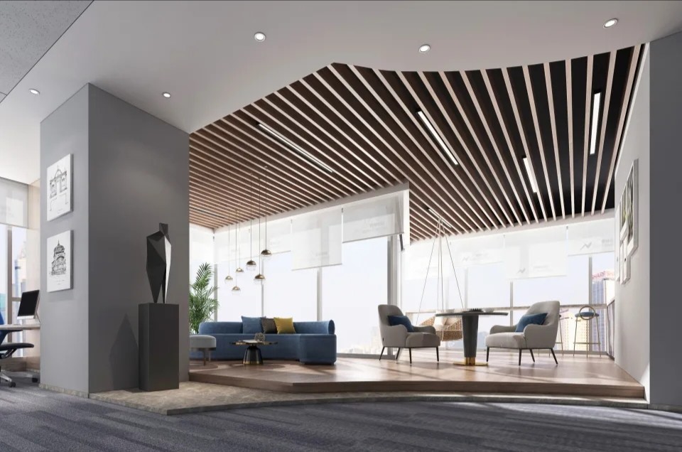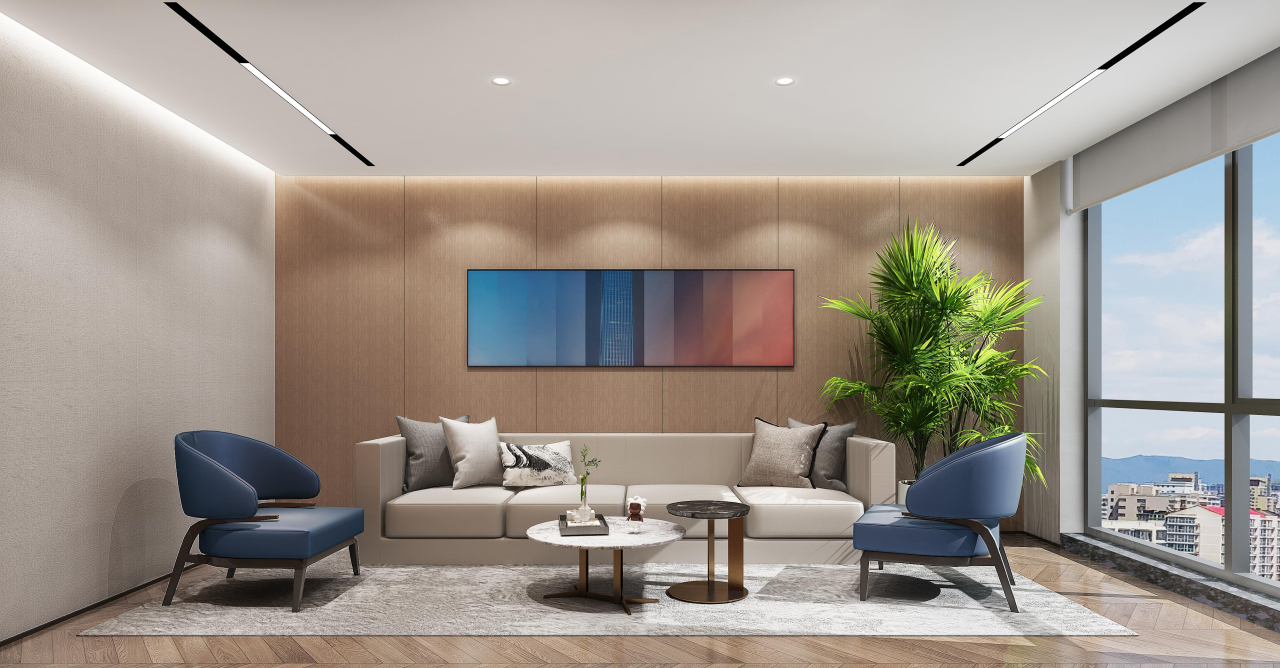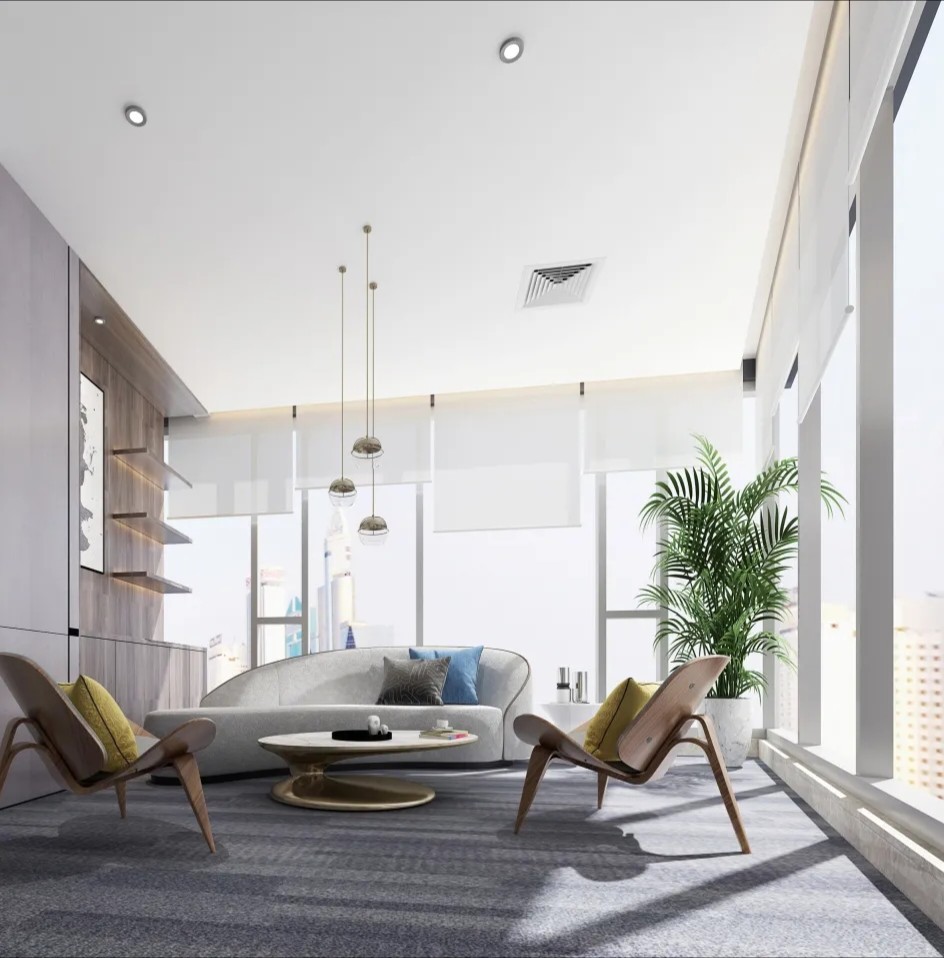 洽谈室墙面采用浅木色,与白色的天花板形成对比,突出了空间的层次感。这种色彩搭配不仅使人感到舒适,还有助于放松心情,为洽谈提供良好环境。房间一侧的大窗户提供了充足的自然光线,使整个洽谈室明亮通透。