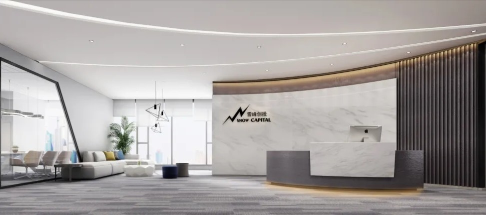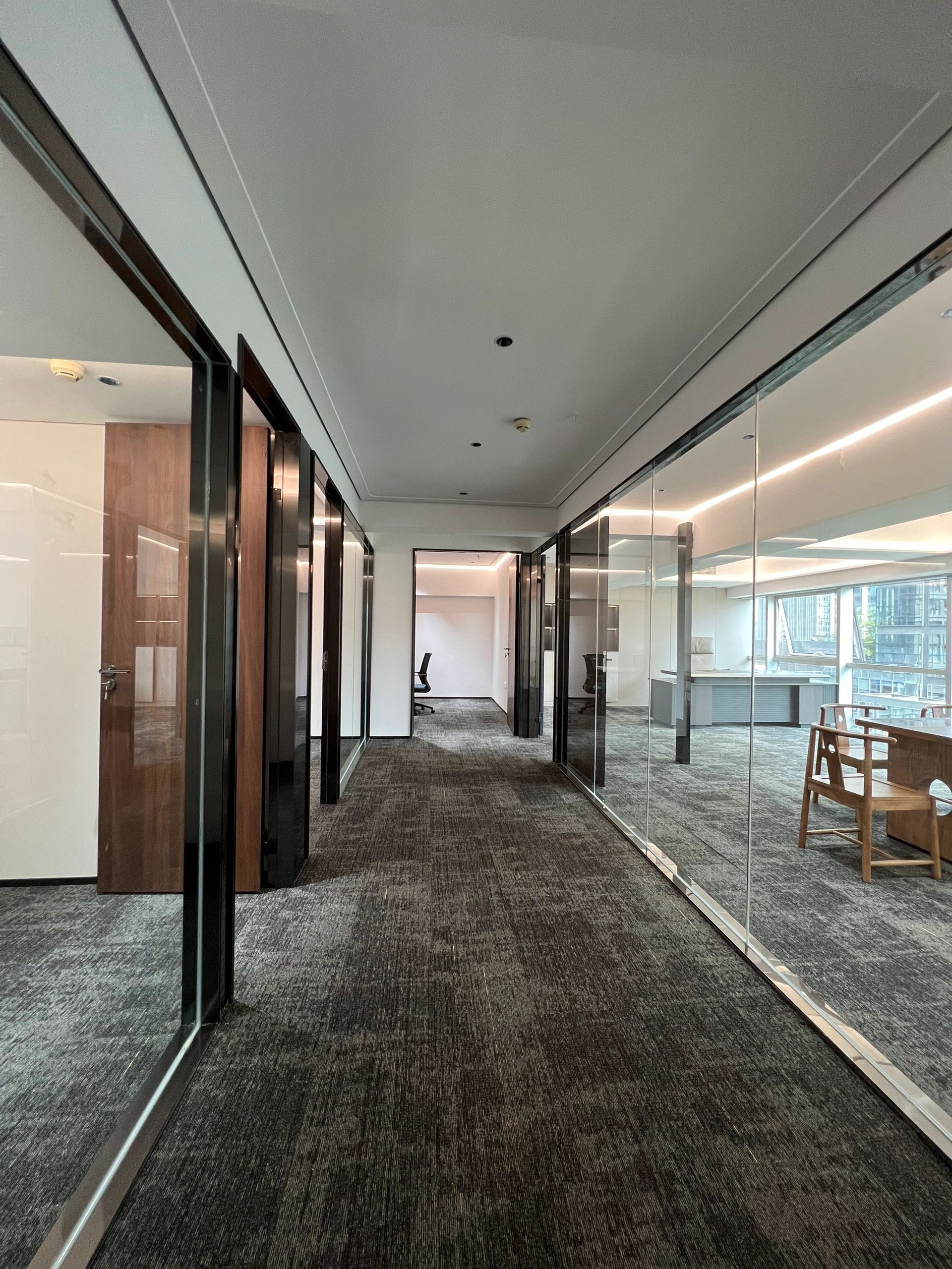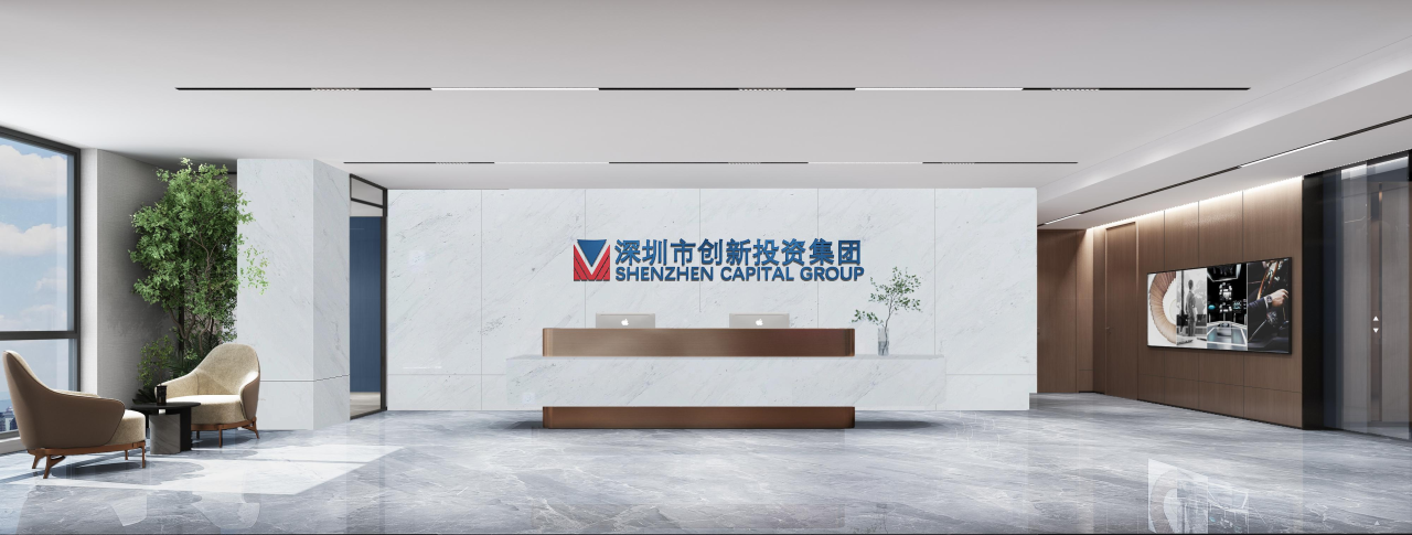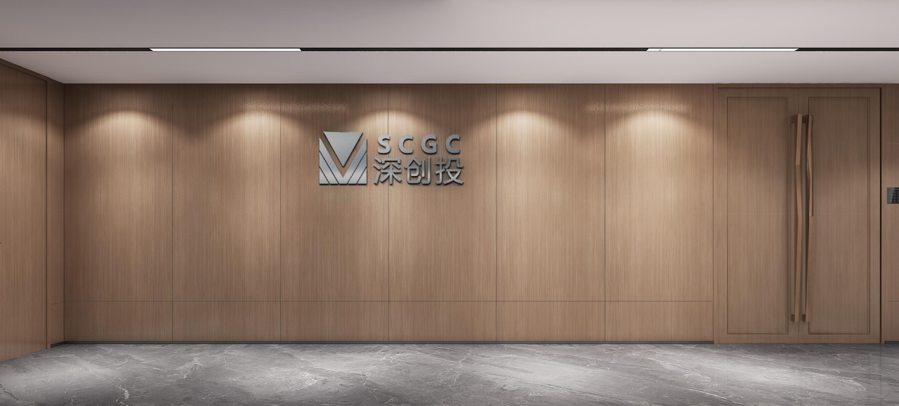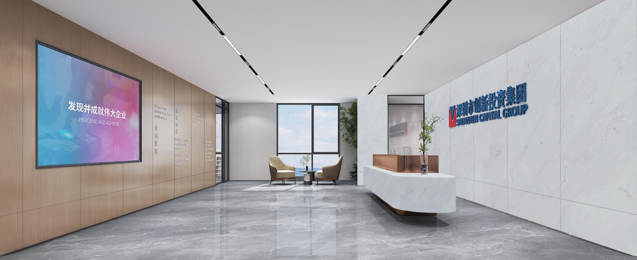 该区域作为次厅,与主厅呼应,保证了贵宾接待的私密性,走廊空间感得到延伸。灰色大理石瓷砖的地面为空间带来了一种沉稳感,同时也显得干净利落。浅木纹的墙板和门则与地面形成了良好的色彩搭配,使整个空间既不失温度,又保持了专业的形象。这种色彩与材质的选择既符合现代设计的审美,也反映了“深创投”公司的品牌专业性和稳健性。