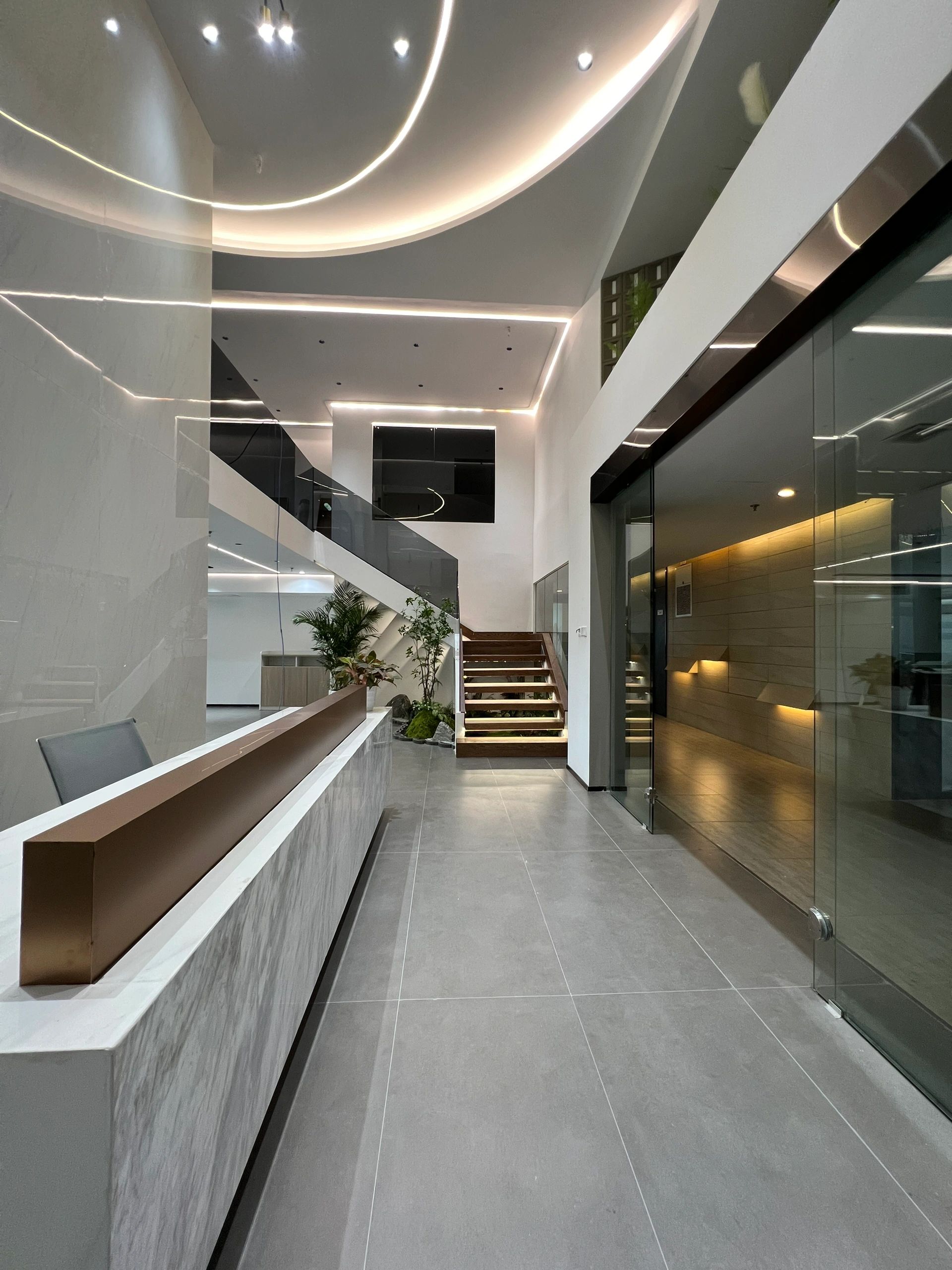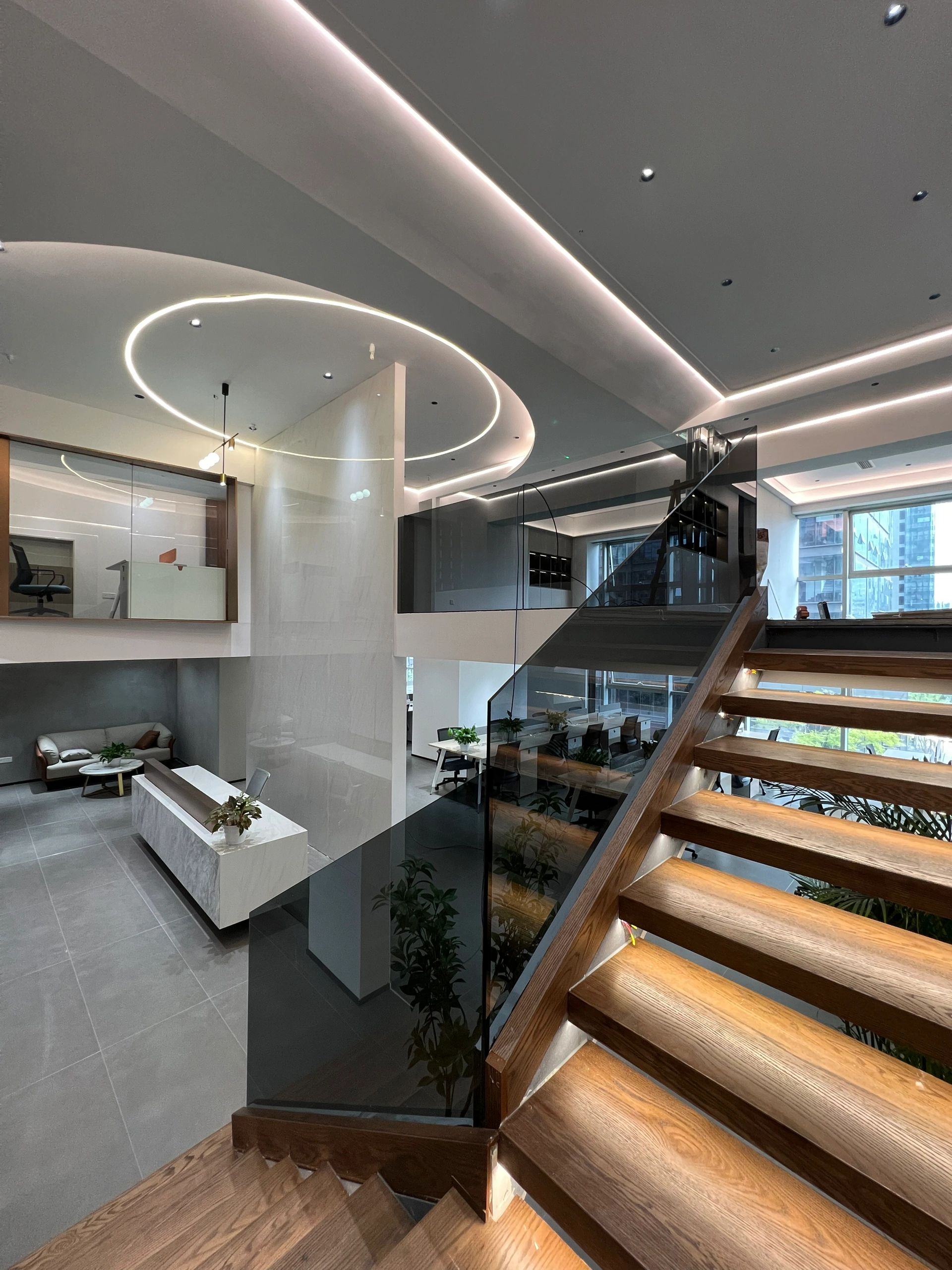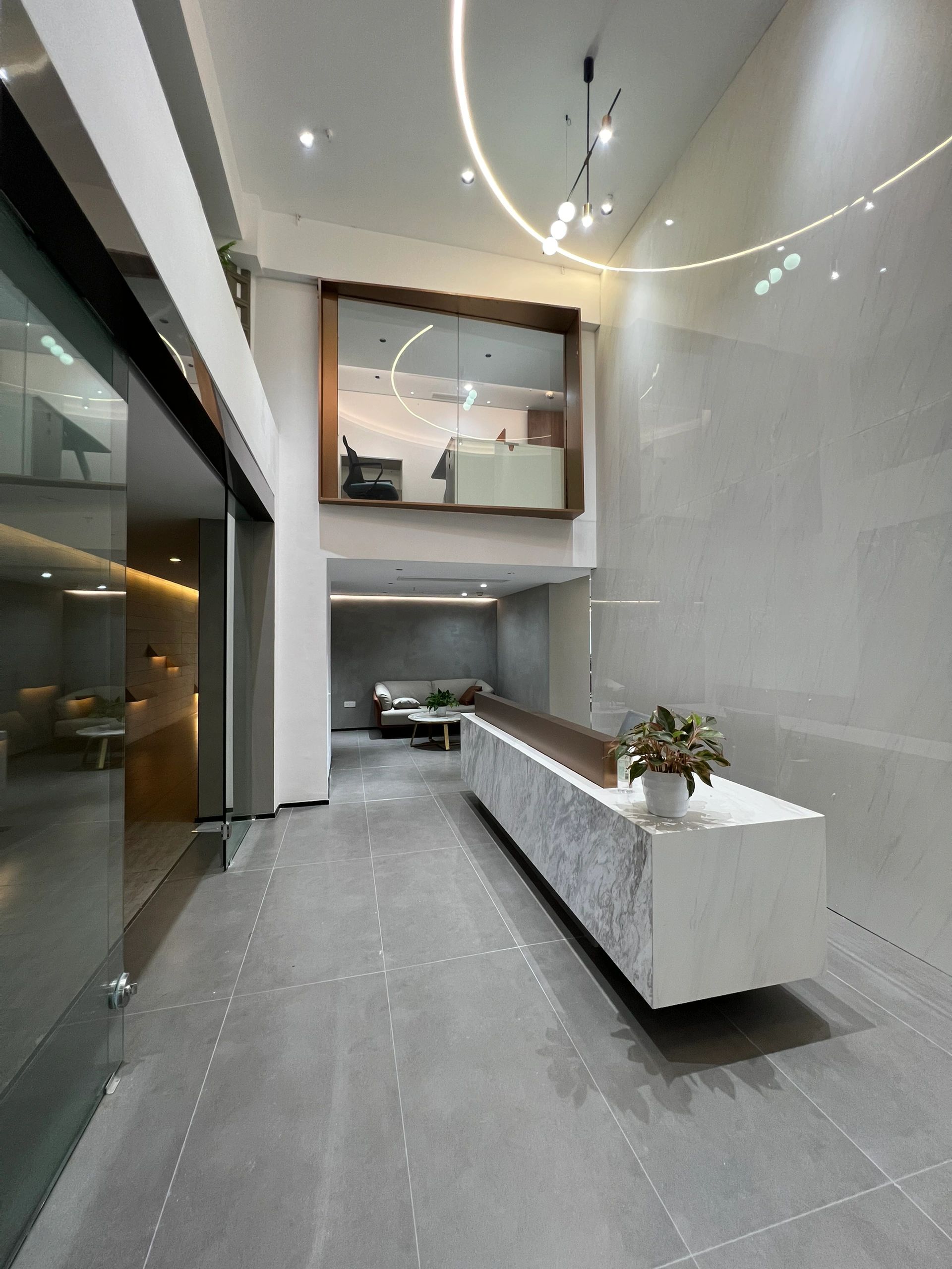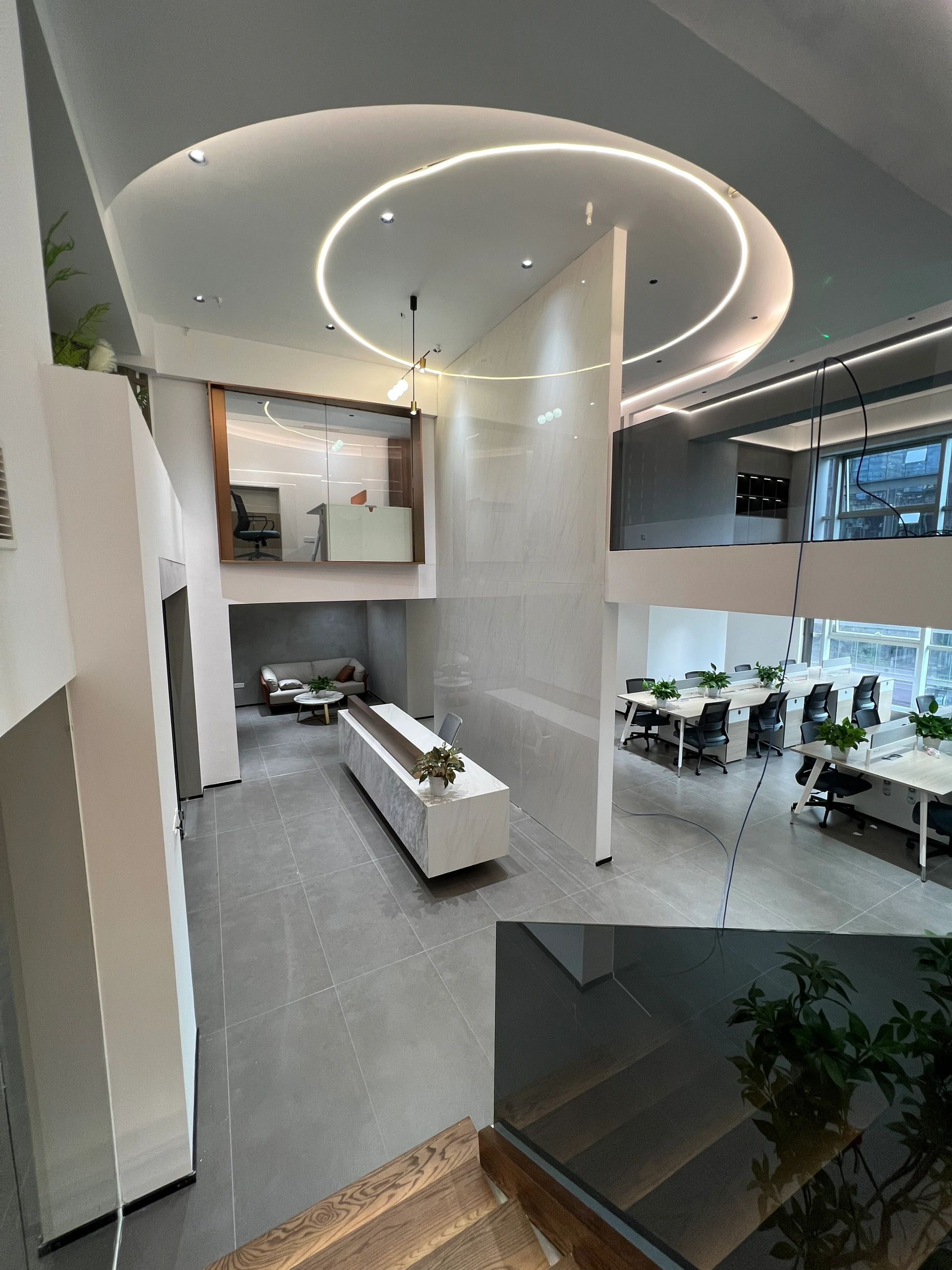 该区域作为次厅,与主厅呼应,保证了贵宾接待的私密性,走廊空间感得到延伸。灰色大理石瓷砖的地面为空间带来了一种沉稳感,同时也显得干净利落。浅木纹的墙板和门则与地面形成了良好的色彩搭配,使整个空间既不失温度,又保持了专业的形象。这种色彩与材质的选择既符合现代设计的审美,也反映了“深创投”公司的品牌专业性和稳健性。